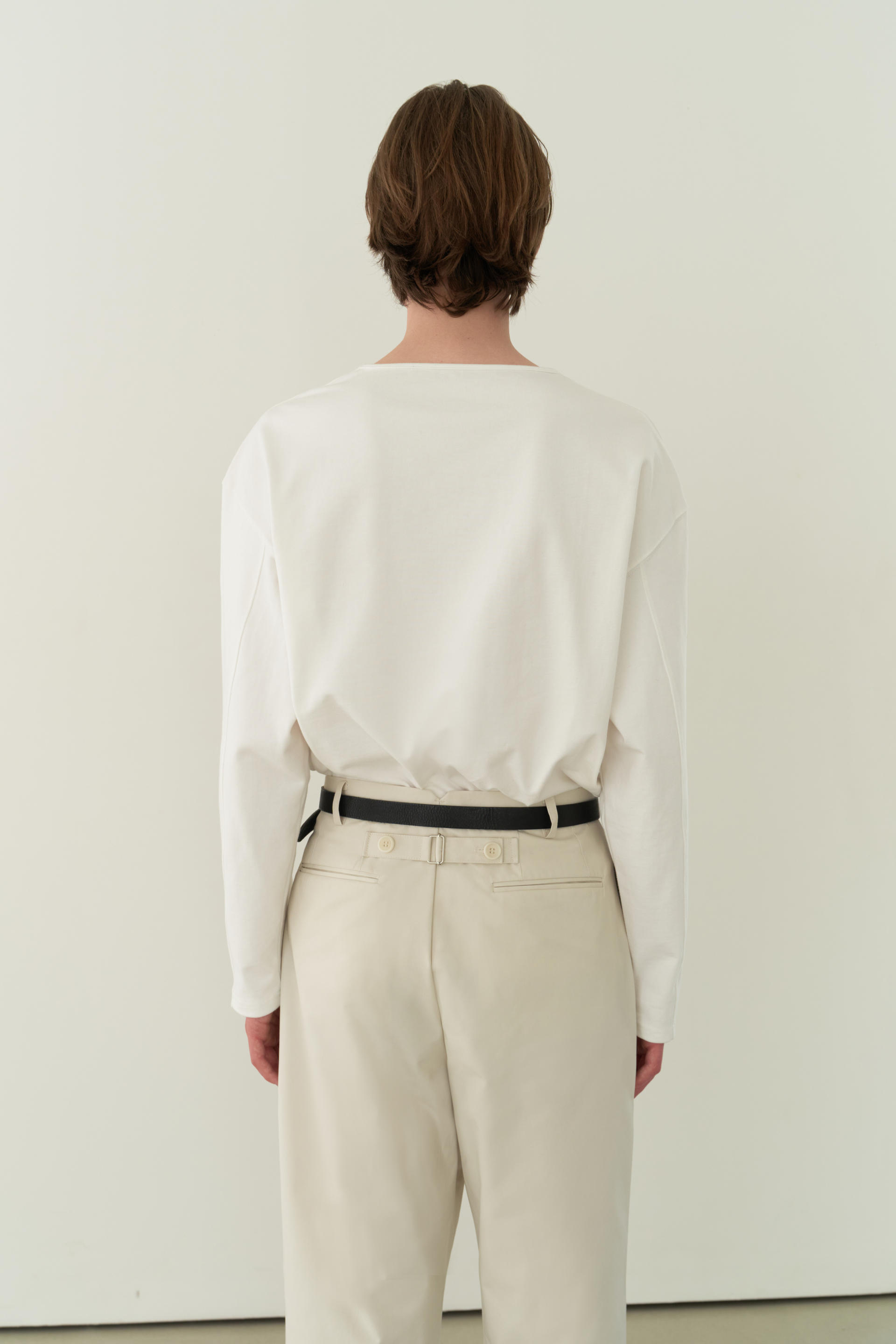 - 허리 뒤 중심에는 일반적인 친치백 디테일과 달리 양쪽 비조에 천연 너트 단추를 사용해 벨트를 고정해 주는 동시에