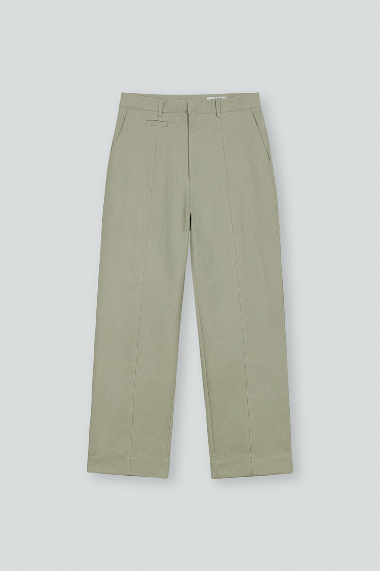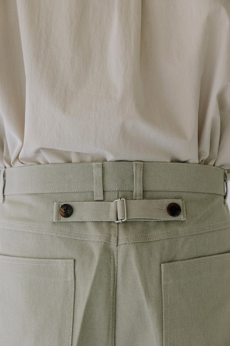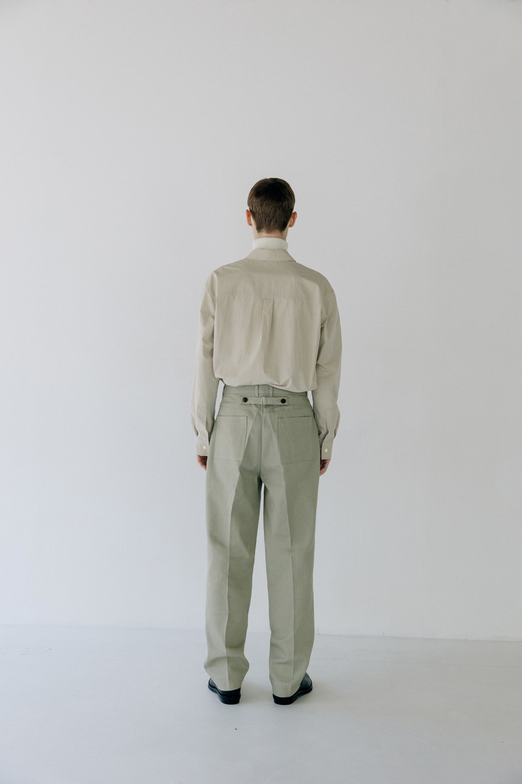 - 허리 뒤 중심에는 일반적인 친치백 디테일과 달리 양쪽 비조에 켄톤을 사용해 벨트를 고정해 주는 동시에 디자인의 심미적인 측면을 강조했습니다.