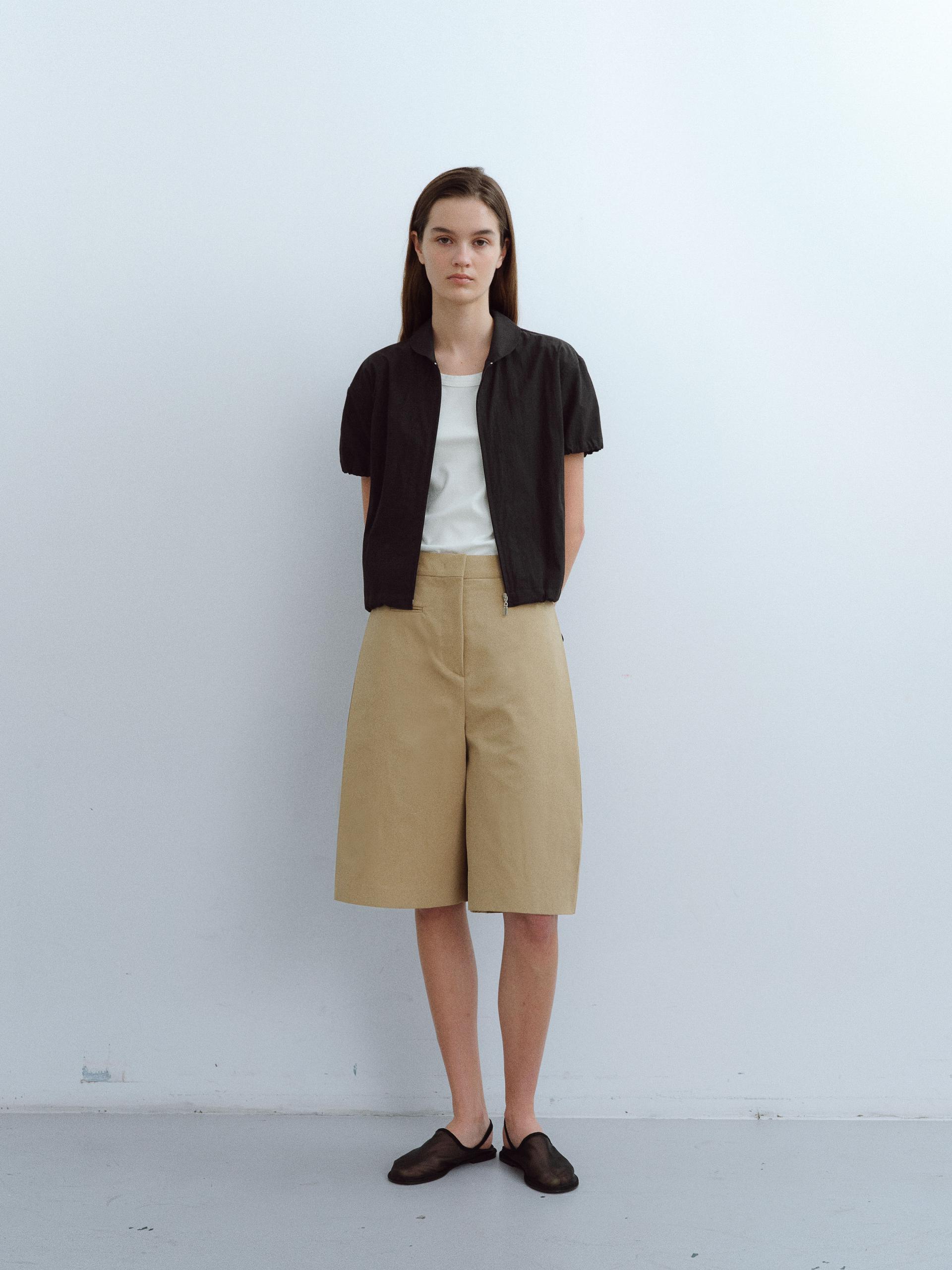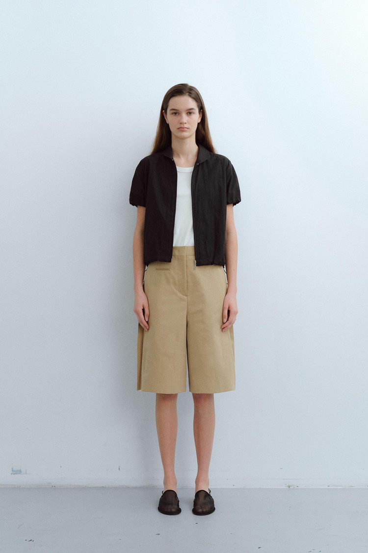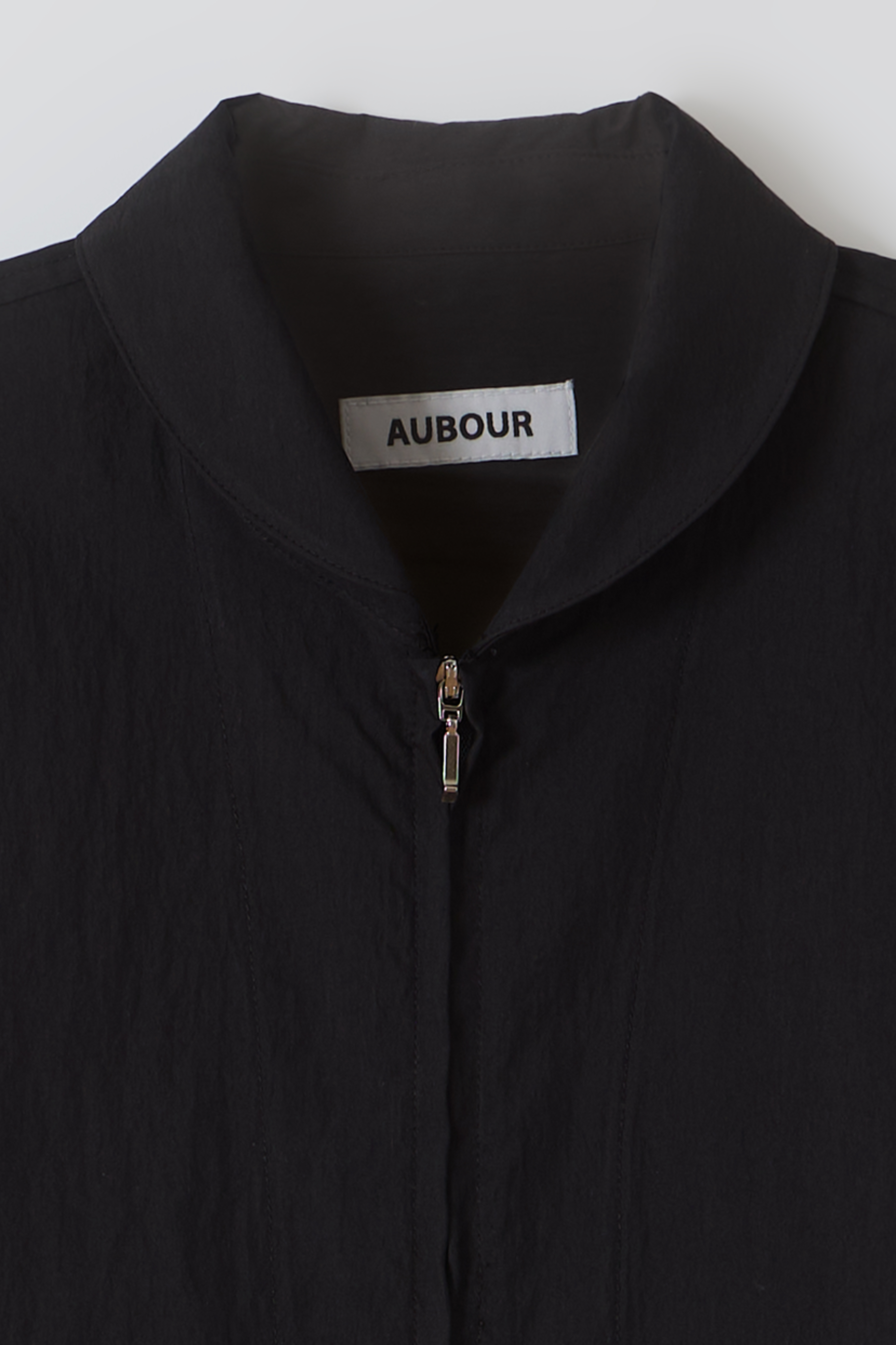 - 라운드 카라와 맞지퍼는 제품의 미니멀한 특징을 강조합니다.