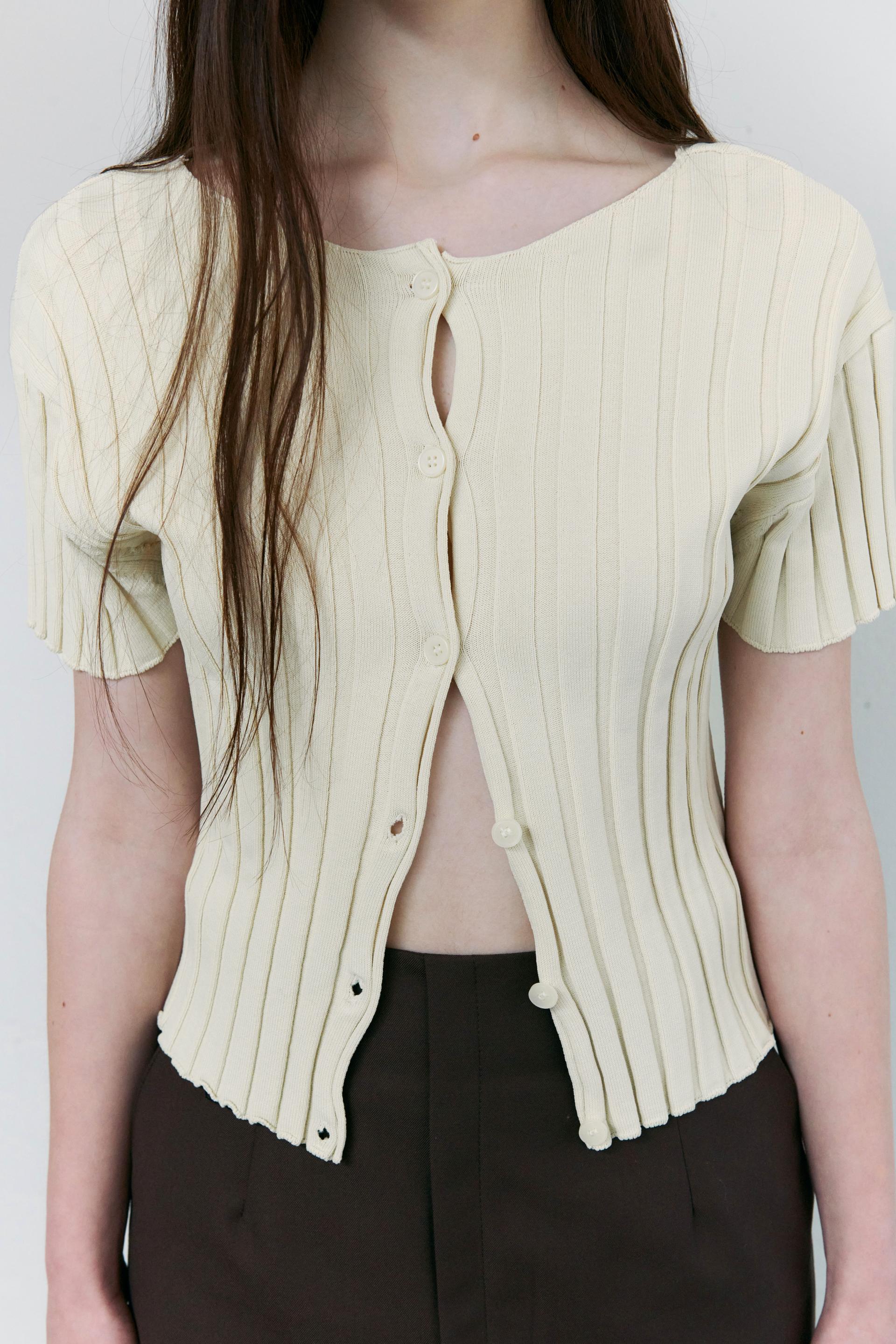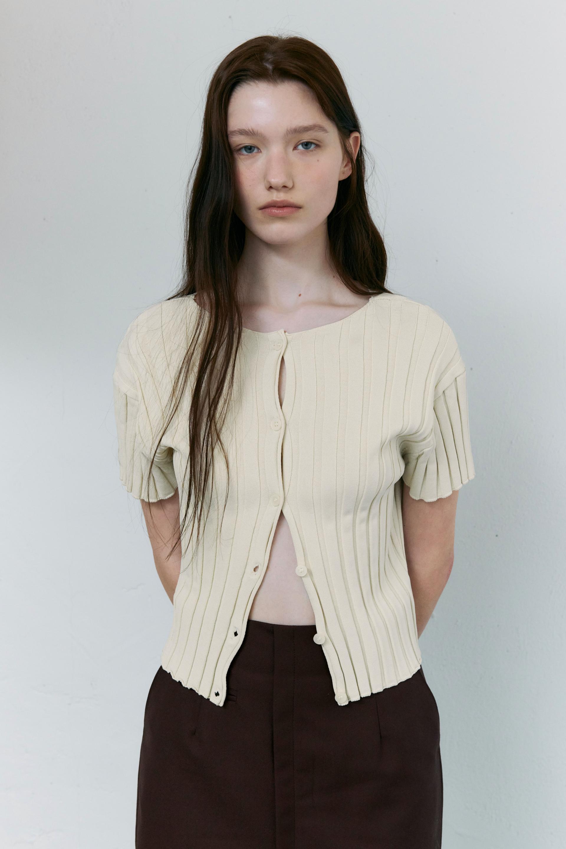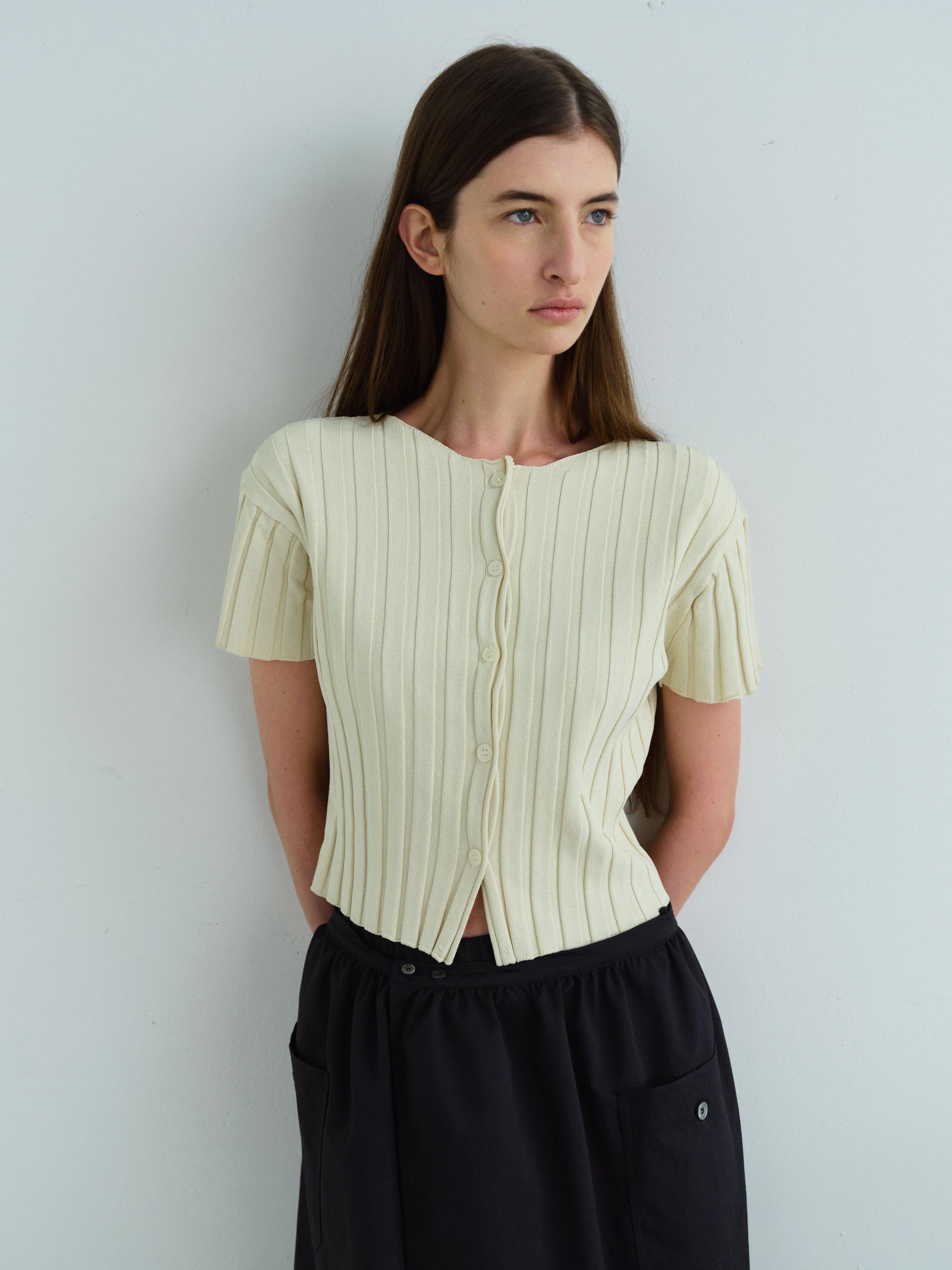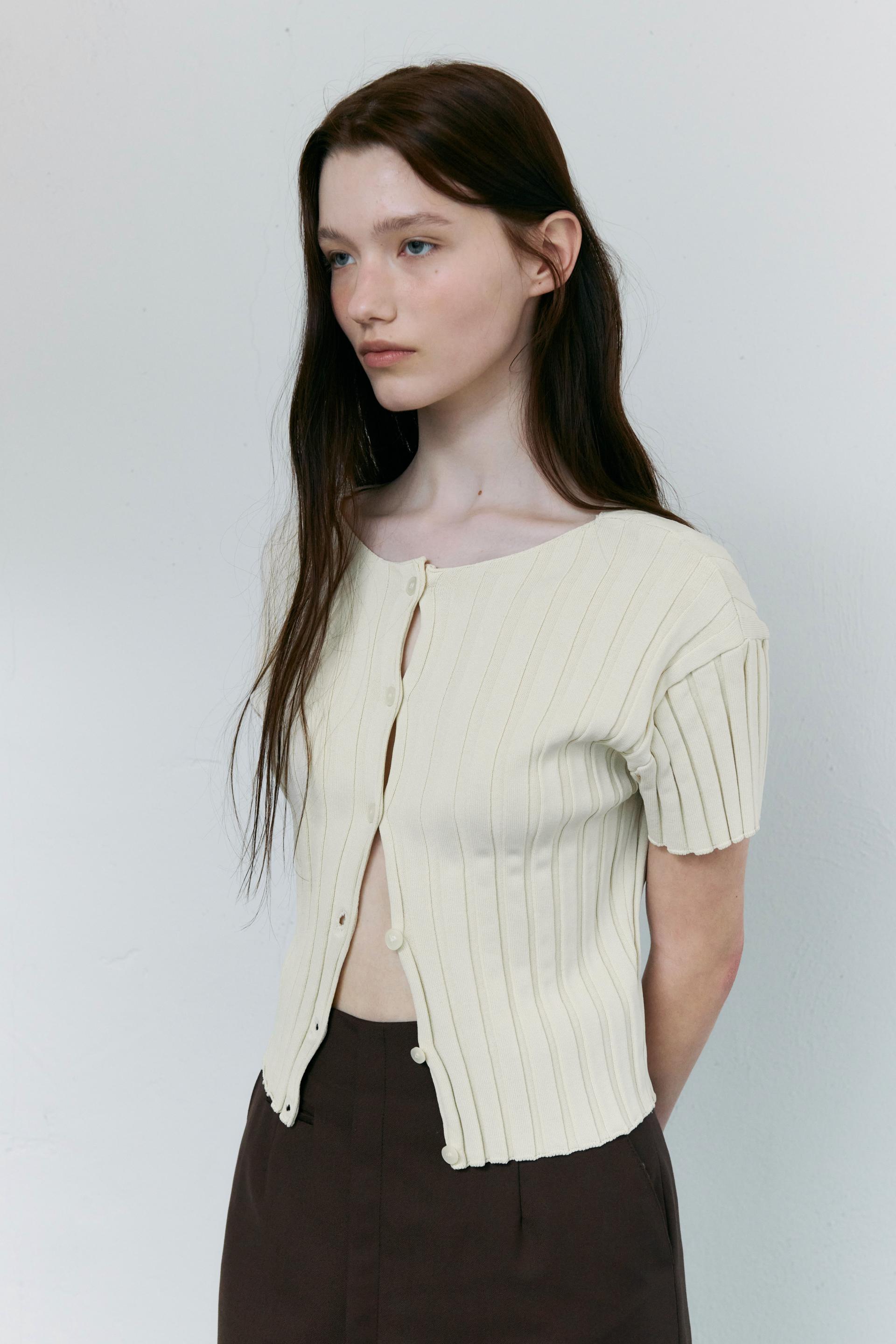 - 짧은 소매와 총장이 특징이며, 촘촘하게 편직해 입체감이 돋보입니다.
