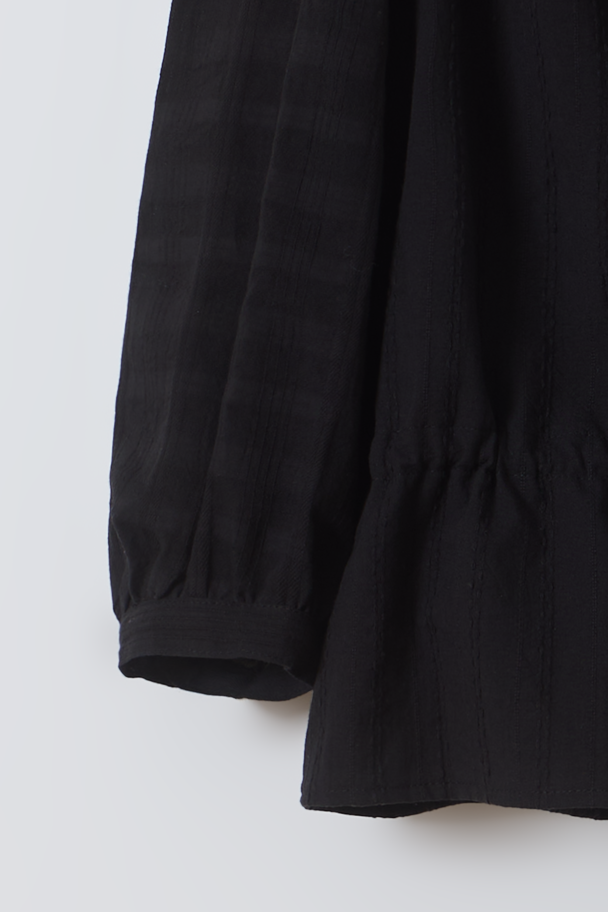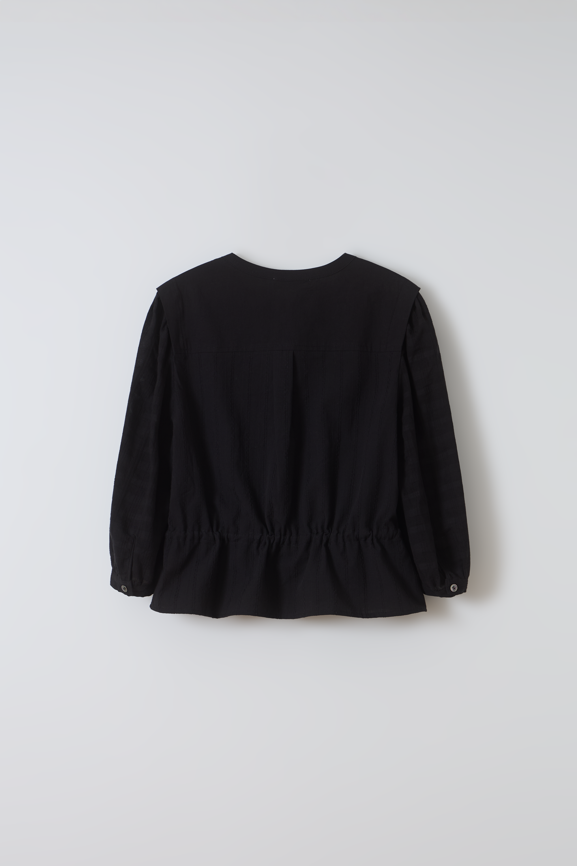 - 어깨에 잡힌 셔링은 요크 패널로 가려져 유니크한 디자인을 강조하며, 과할 수 있는 퍼프 슬리브를 부드럽게 완화시켰습니다.