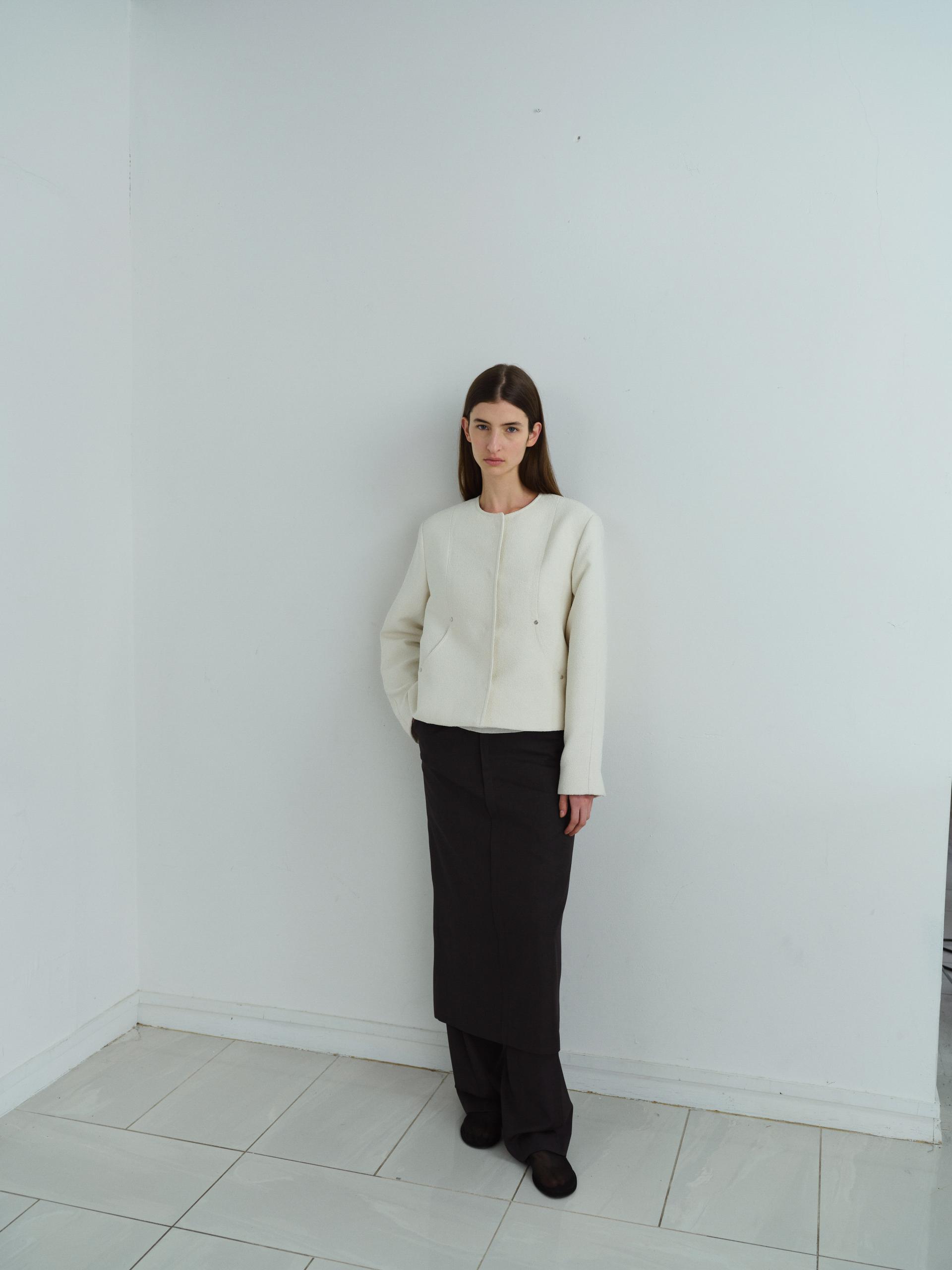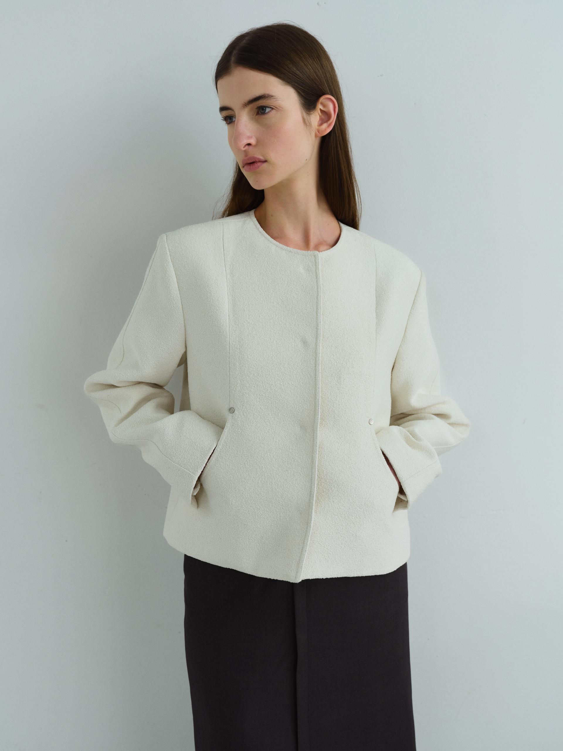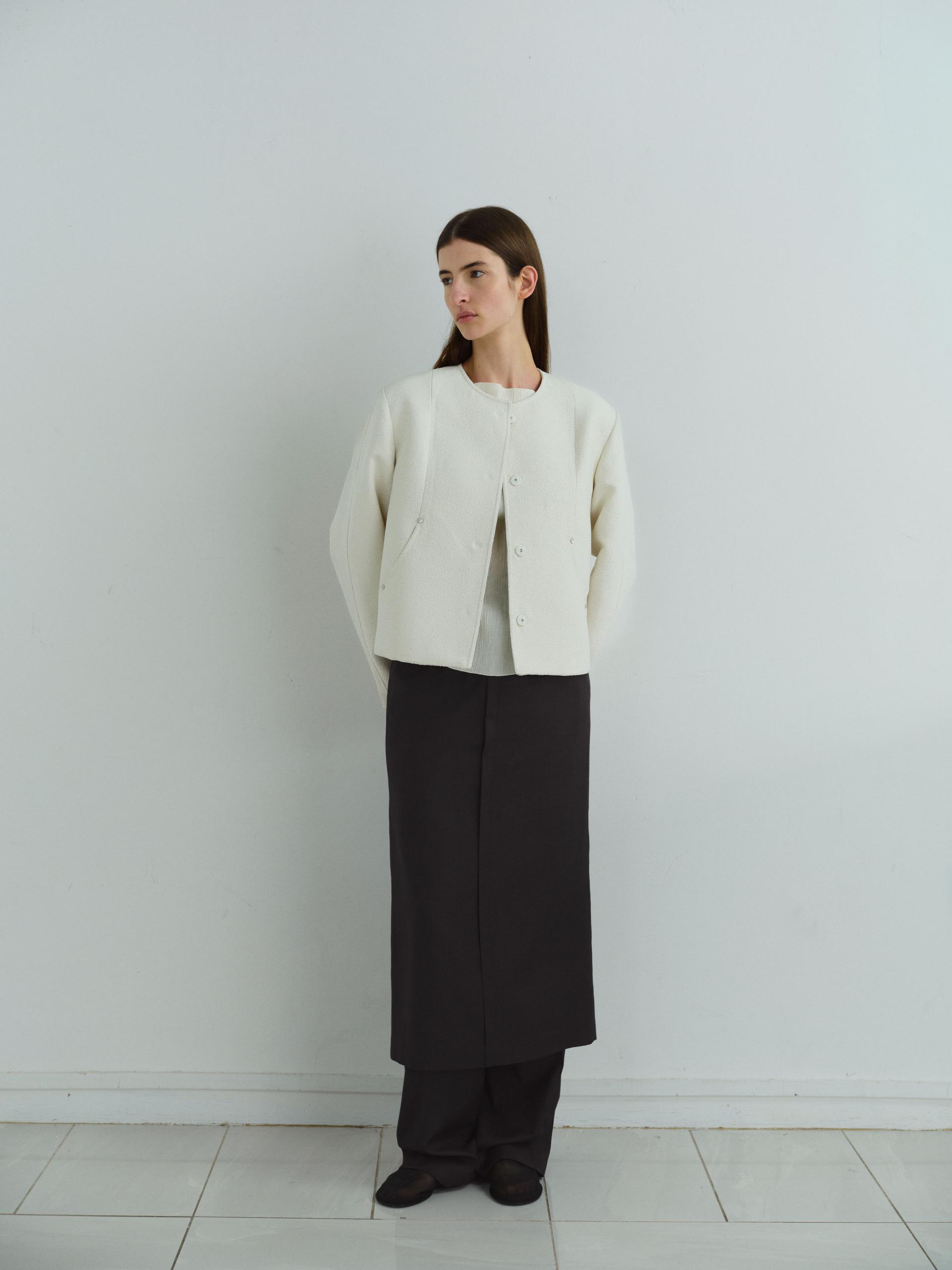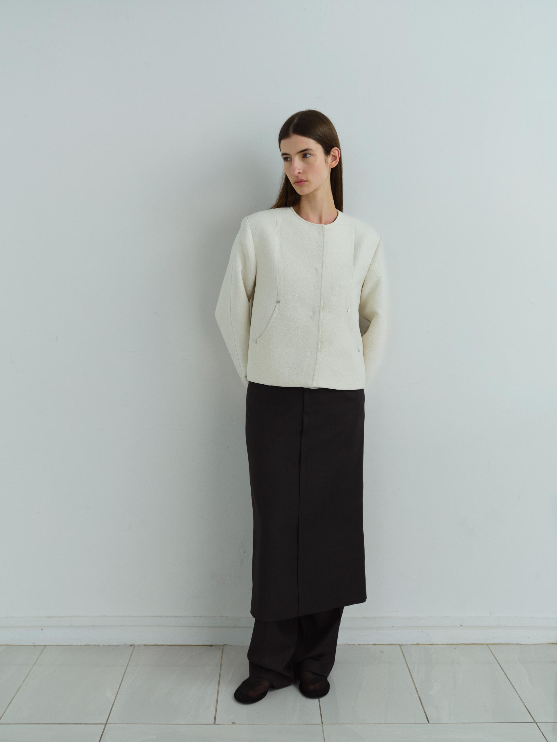 - 앞단과 소매단은 싸개 단추를 하나씩 손바느질로 마감하여, 잠갔을 때 단추가 보이지 않아 미니멀한 디자인을 강조했습니다.
