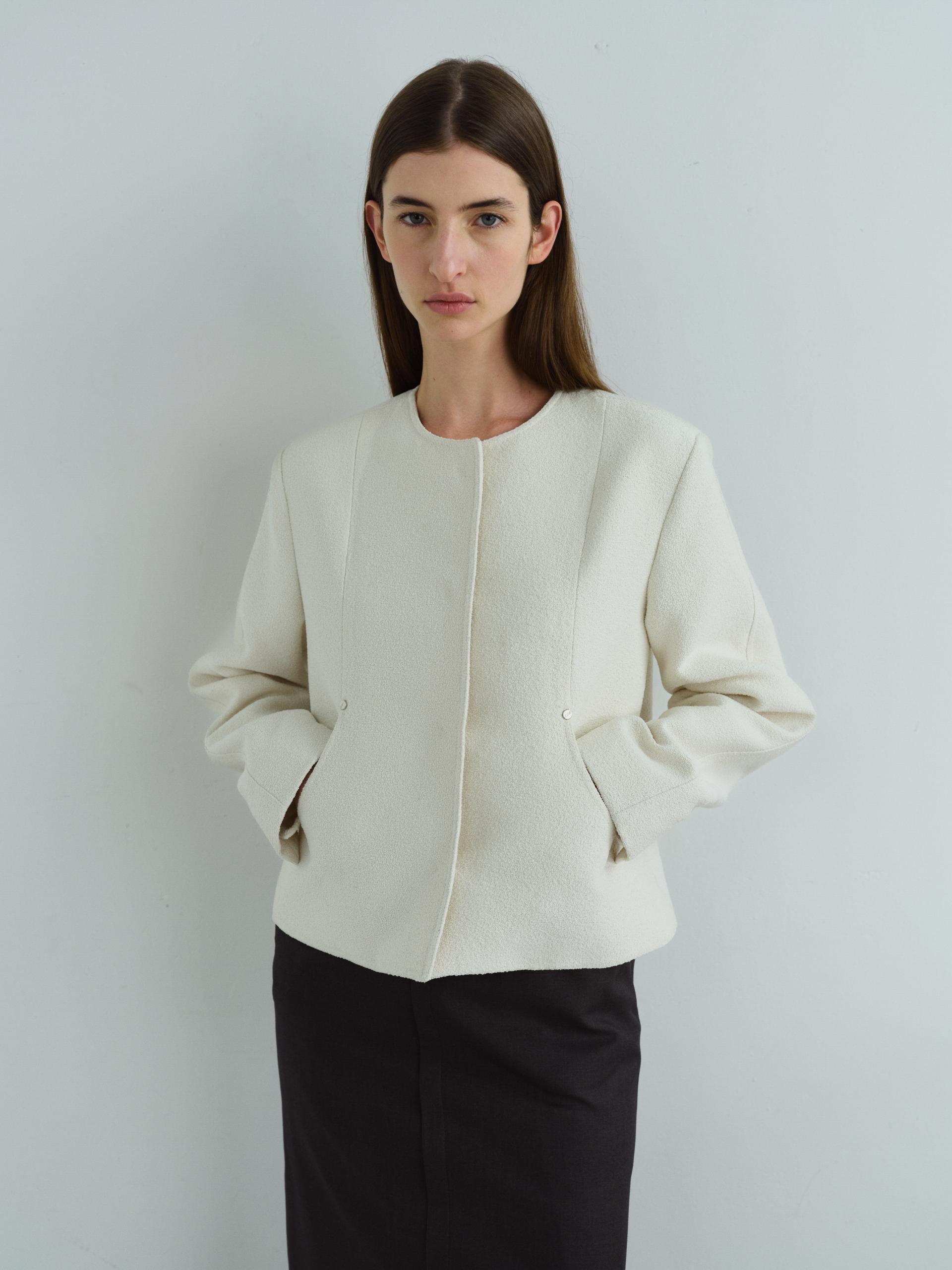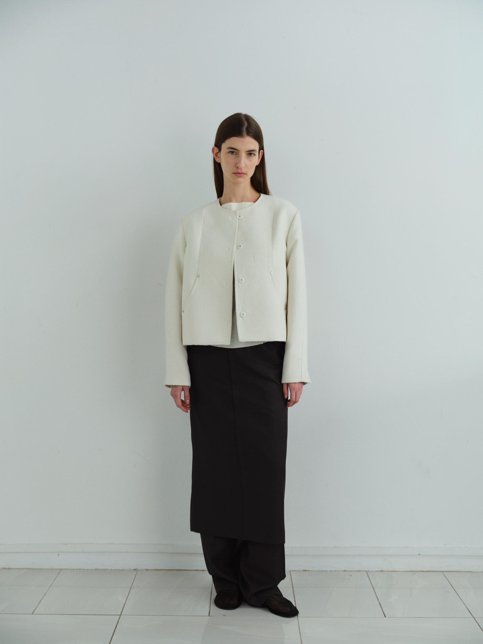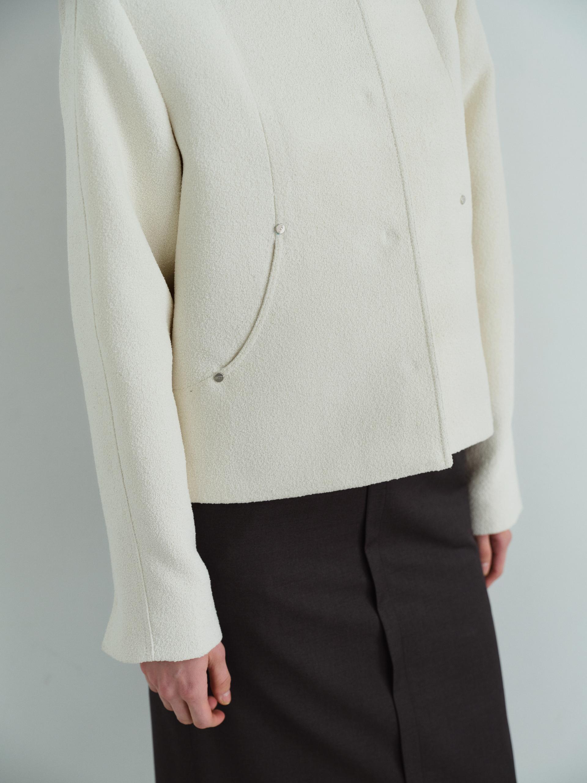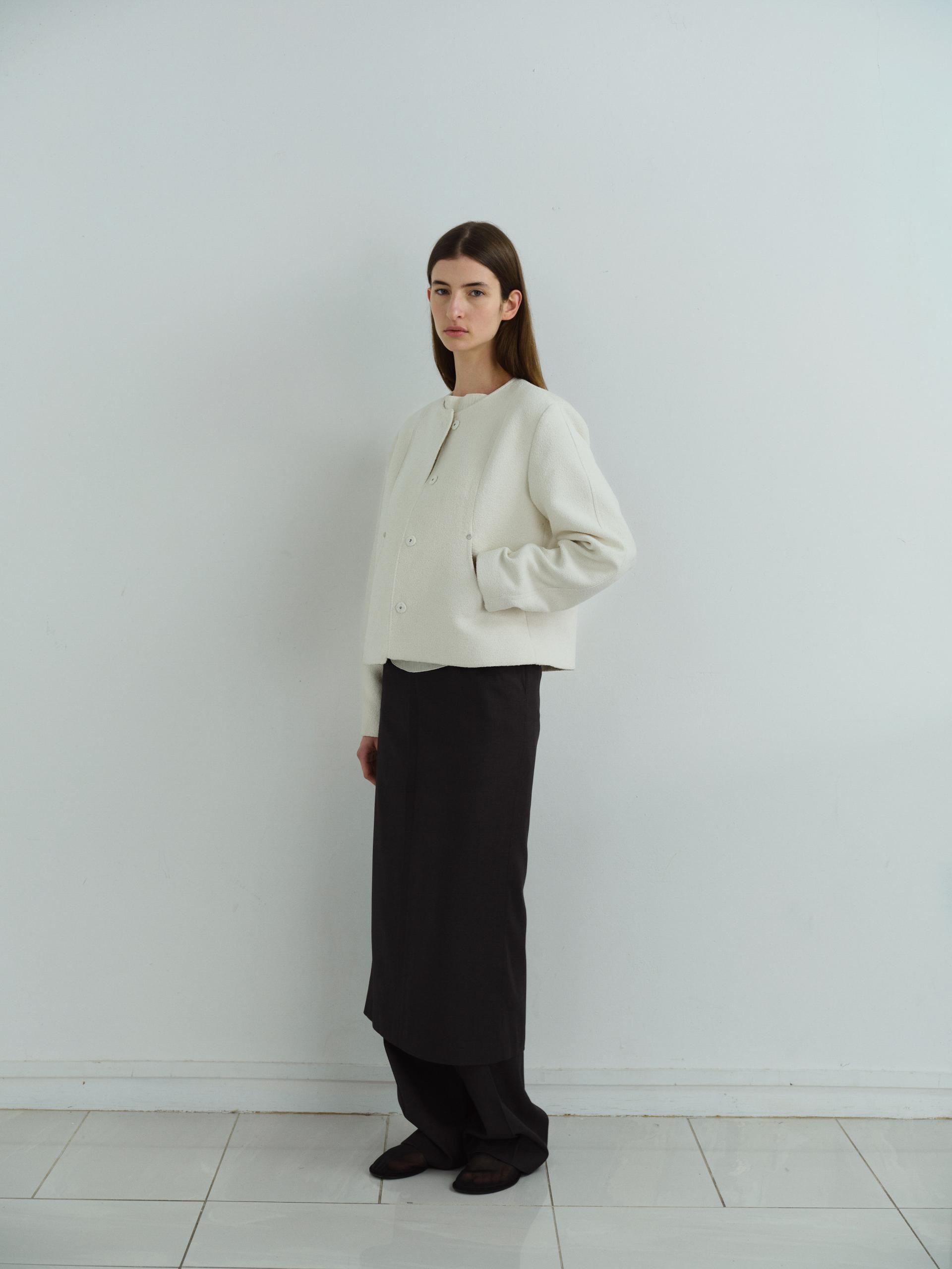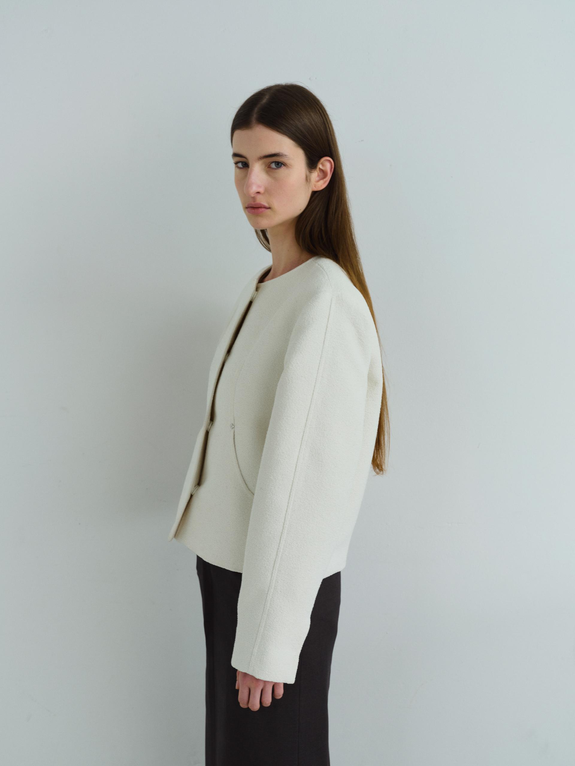 - 앞단과 소매단은 싸개 단추를 하나씩 손바느질로 마감하여, 잠갔을 때 단추가 보이지 않아 미니멀한 디자인을 강조했습니다.