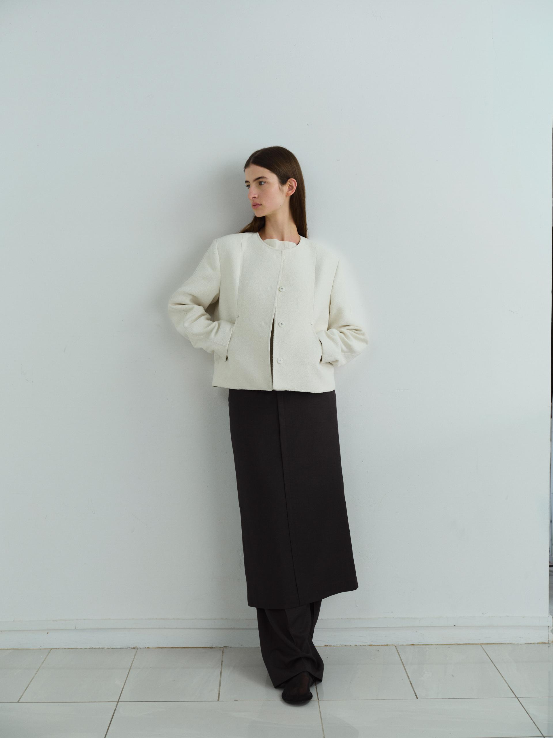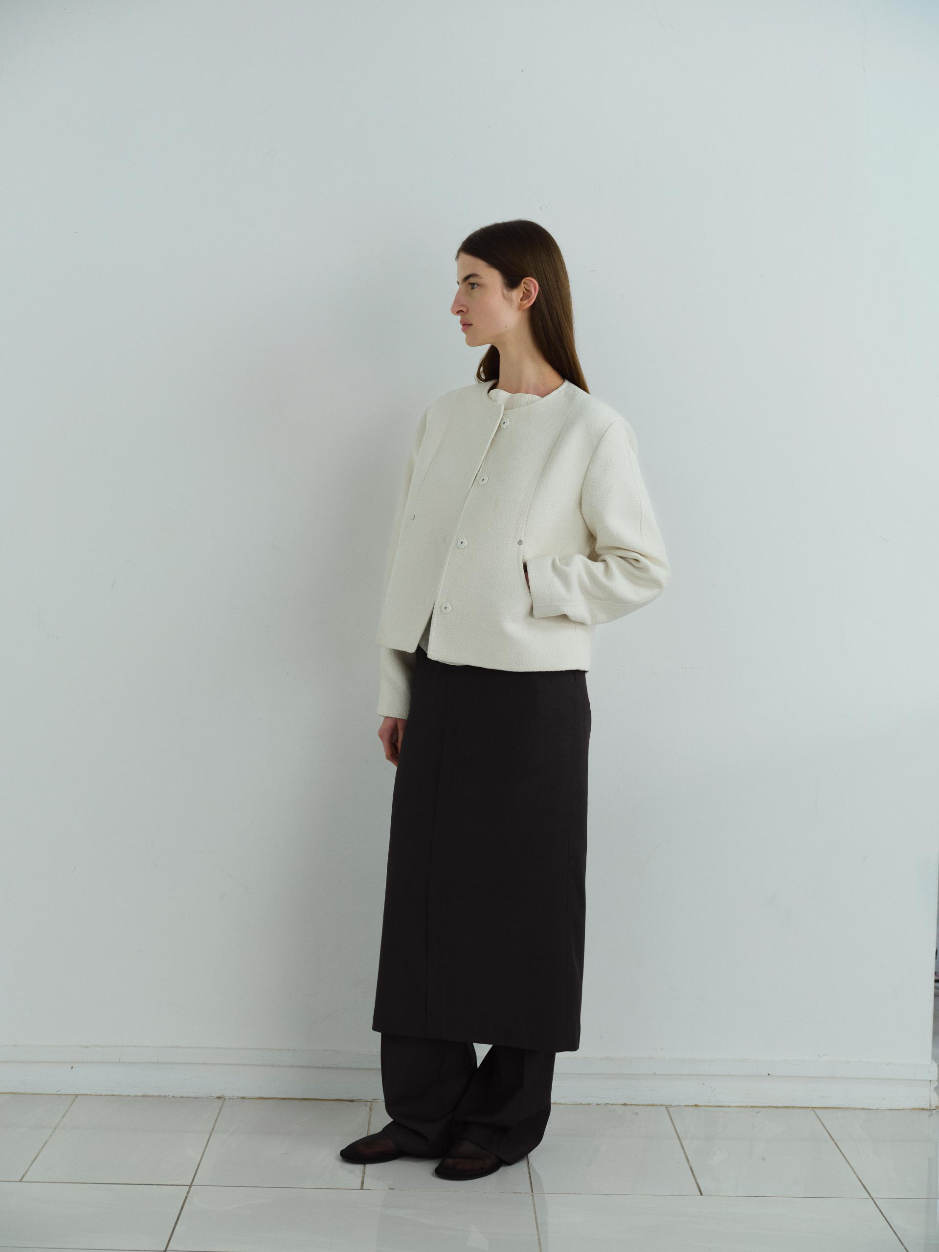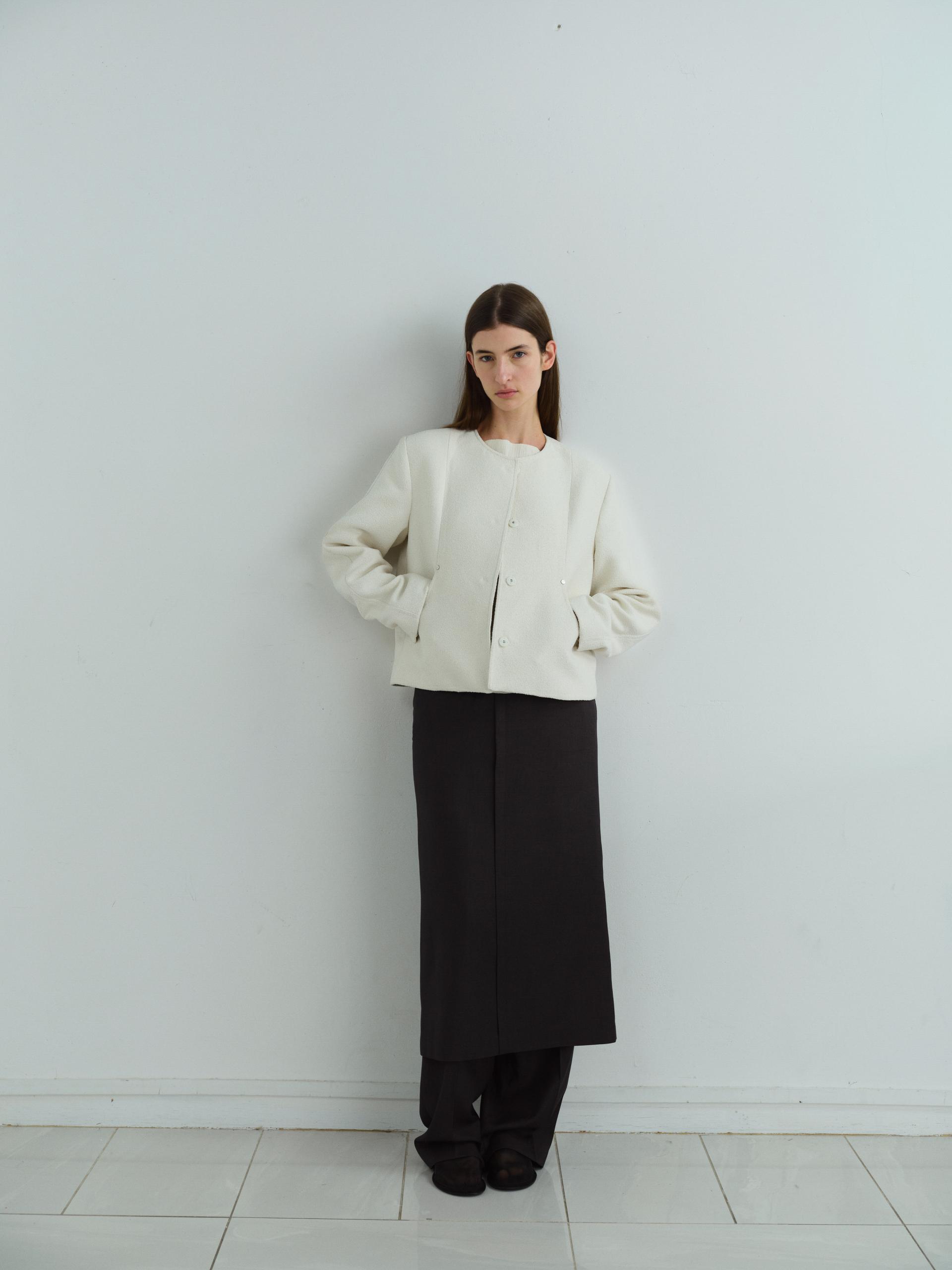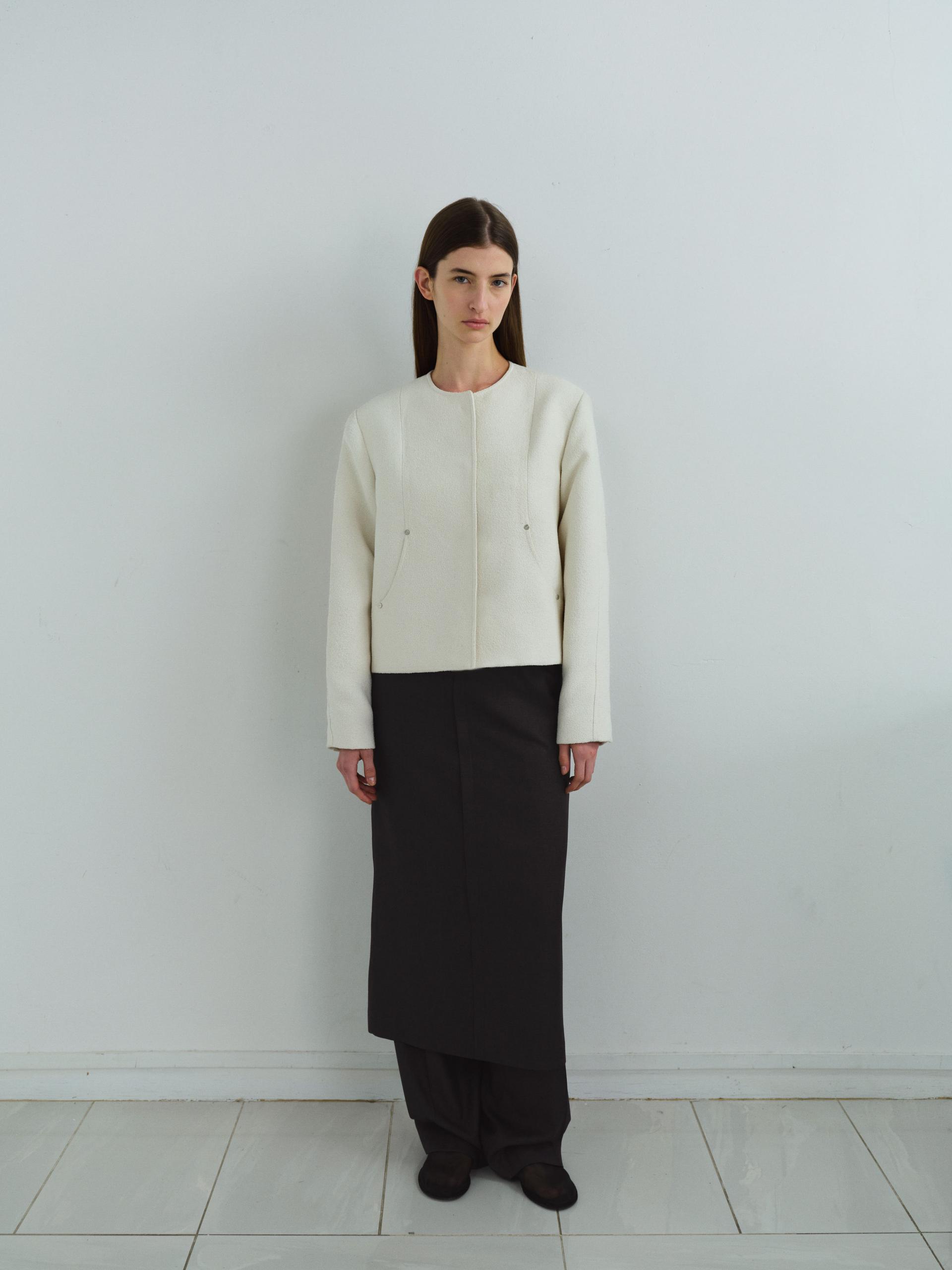 - 앞단과 소매단은 싸개 단추를 하나씩 손바느질로 마감하여, 잠갔을 때 단추가 보이지 않아 미니멀한 디자인을 강조했습니다.