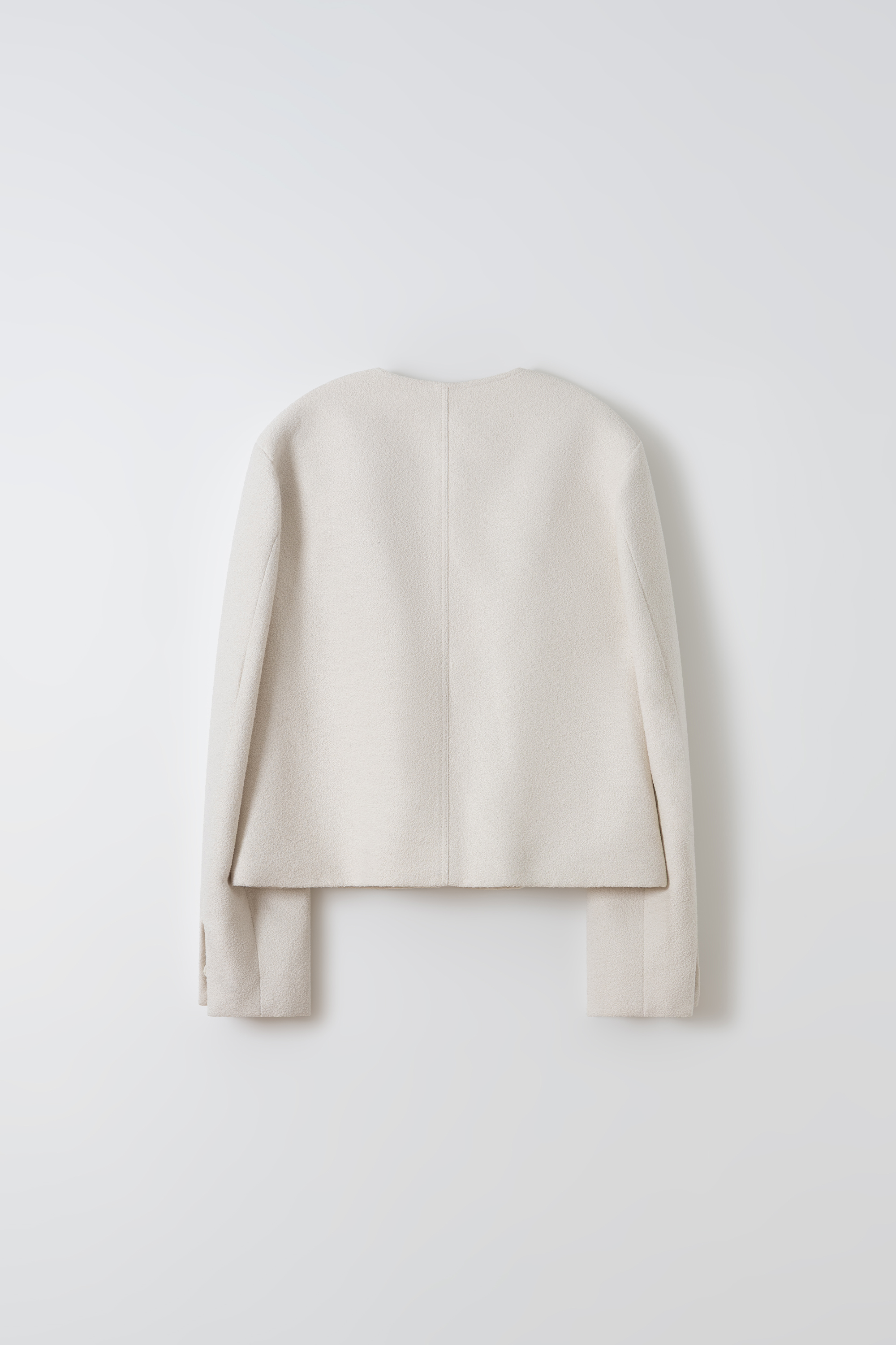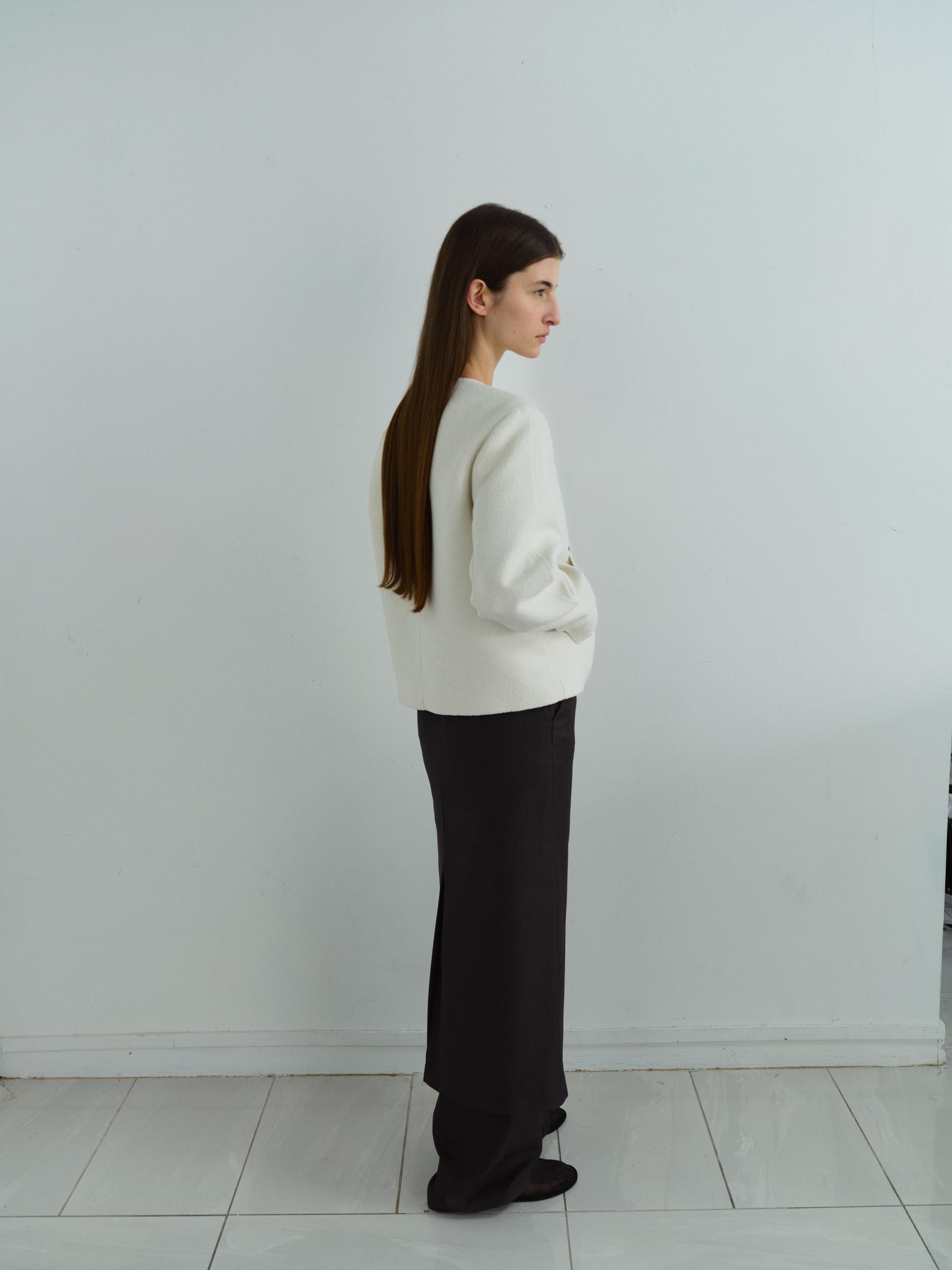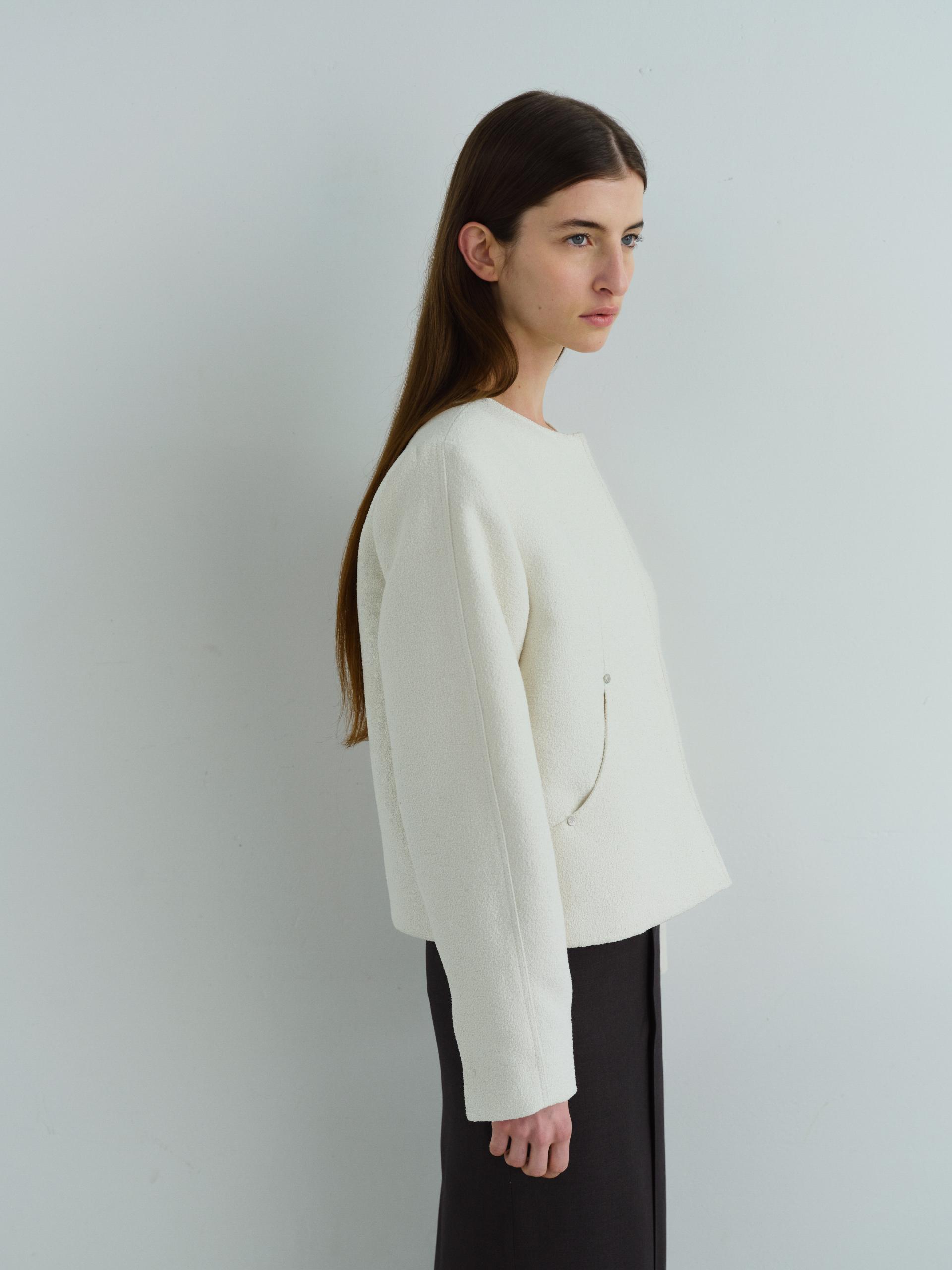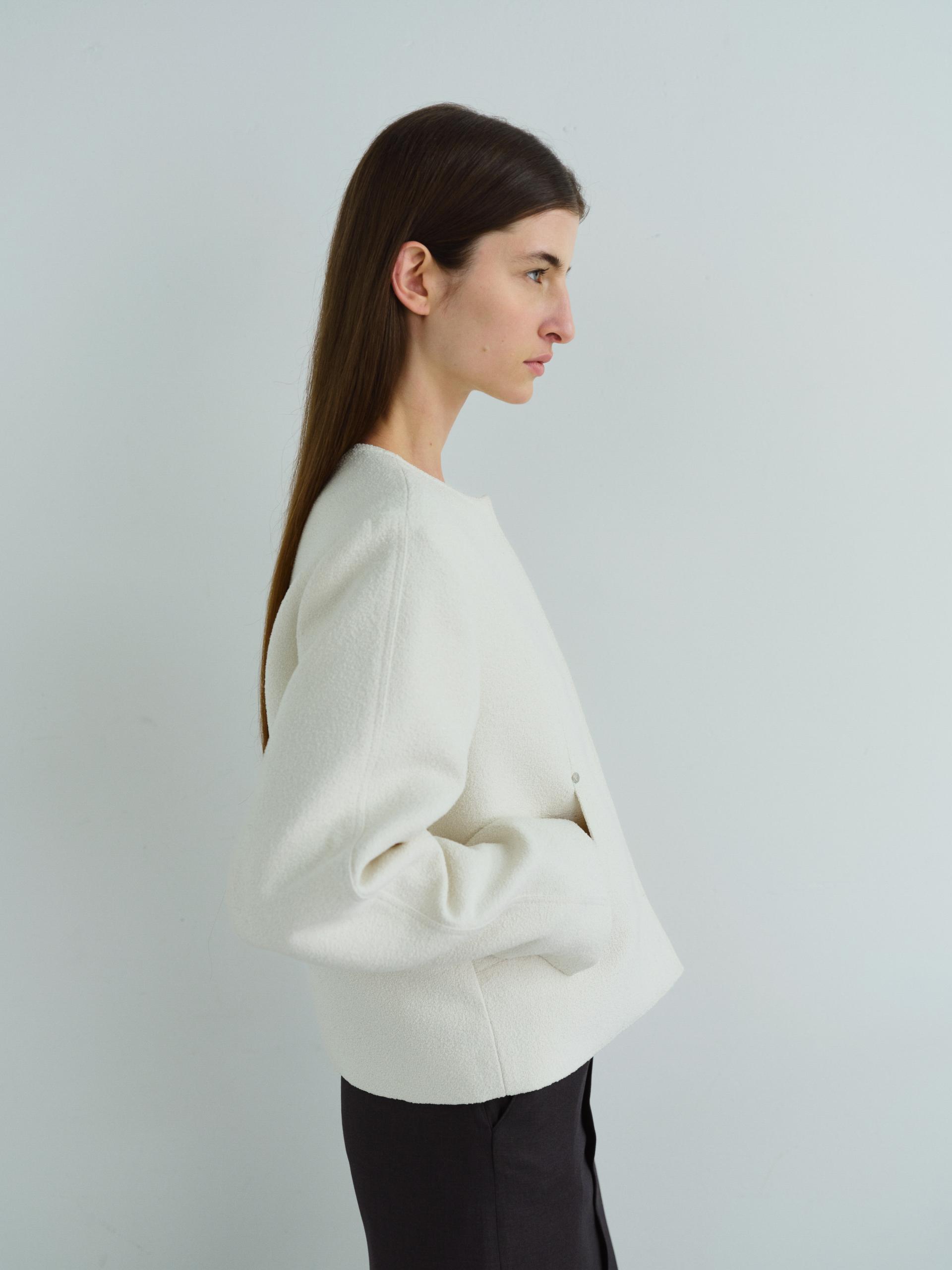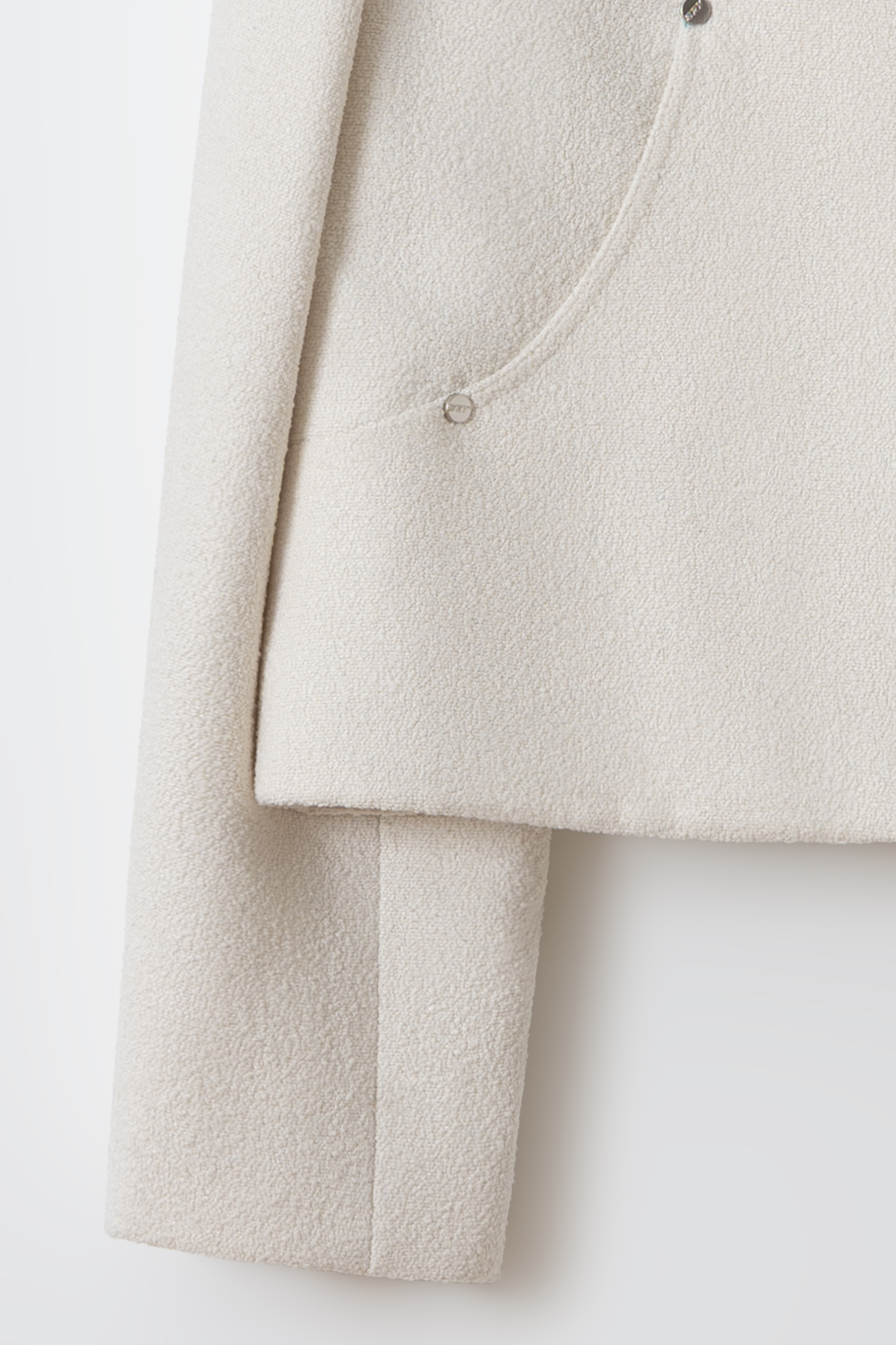 - 앞단과 소매단은 싸개 단추를 하나씩 손바느질로 마감하여, 잠갔을 때 단추가 보이지 않아 미니멀한 디자인을 강조했습니다.