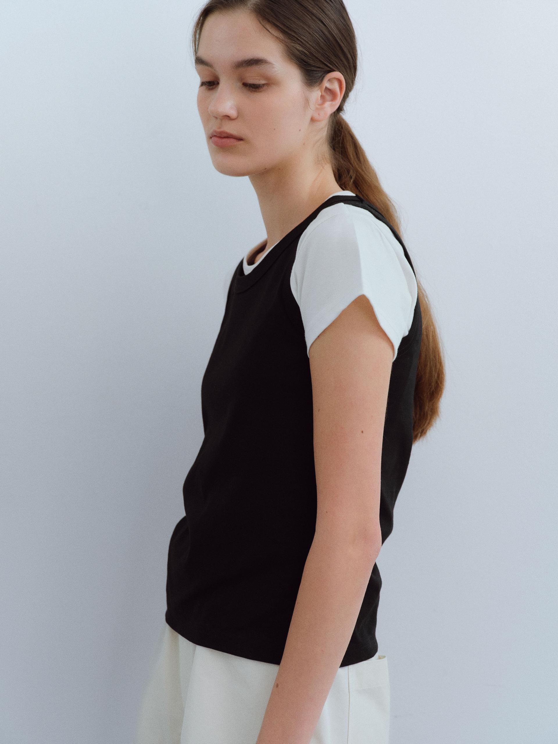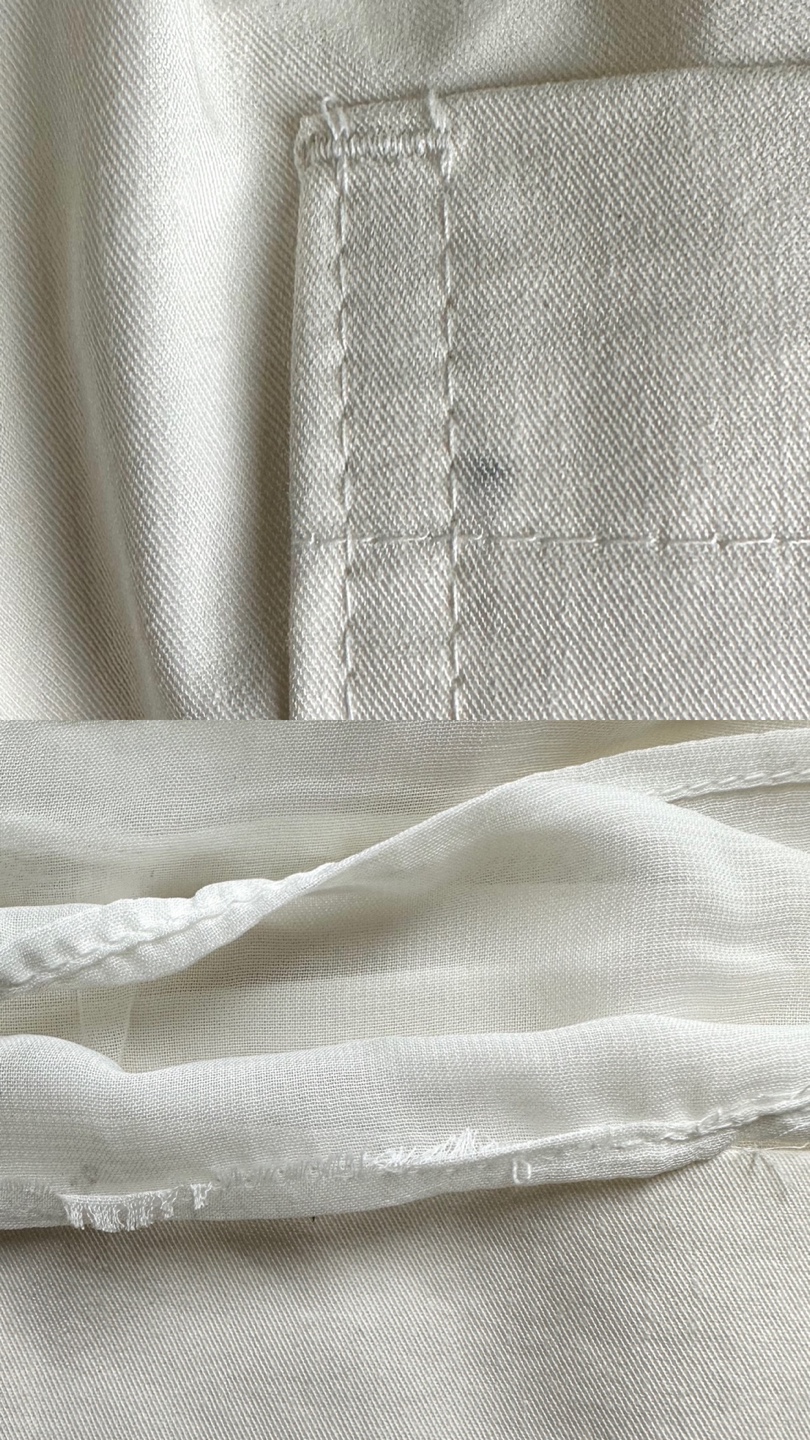 - 밑단 쪽 절개 후 쉬폰 원단을 덧대어 봉제했으며, 길게 나오는 쉬폰 패널은 디자인적 요소입니다.