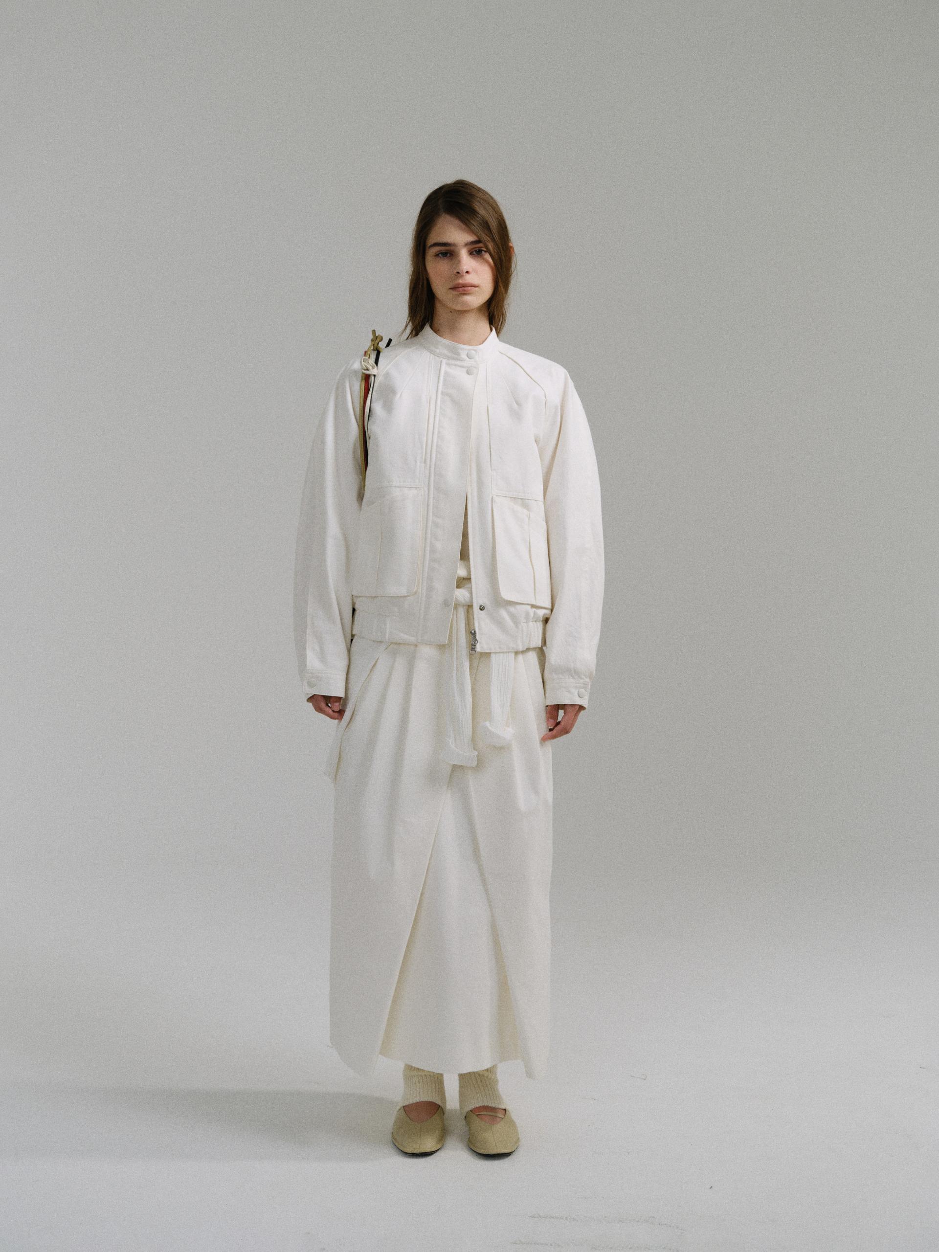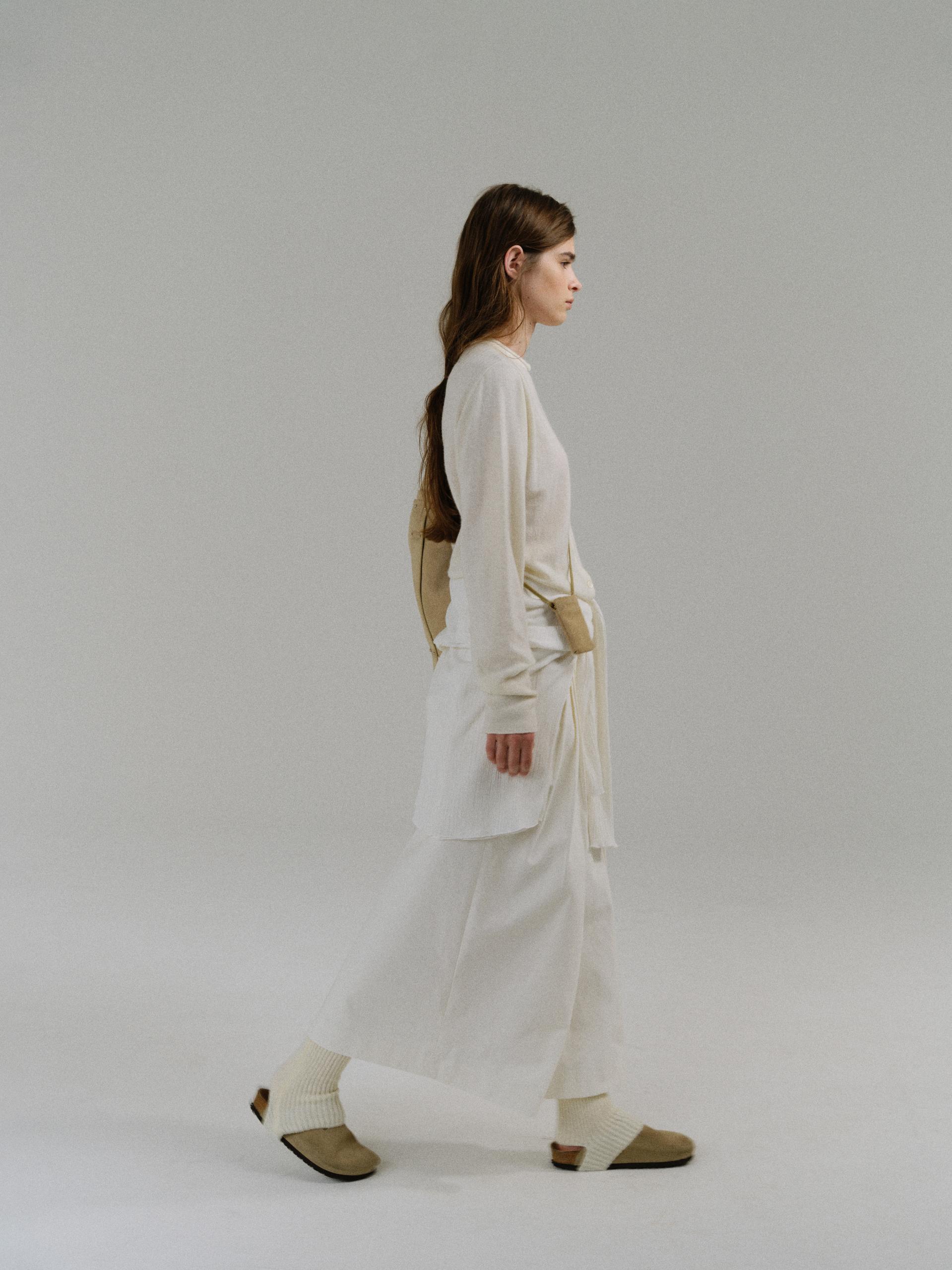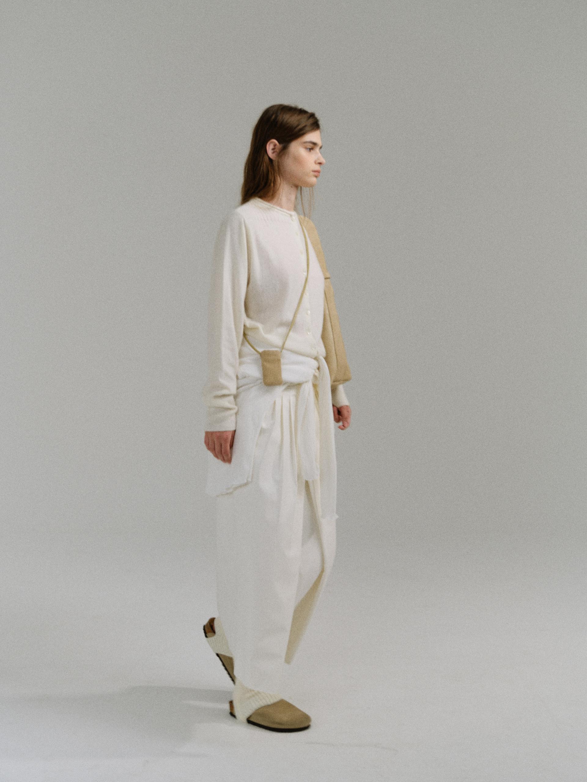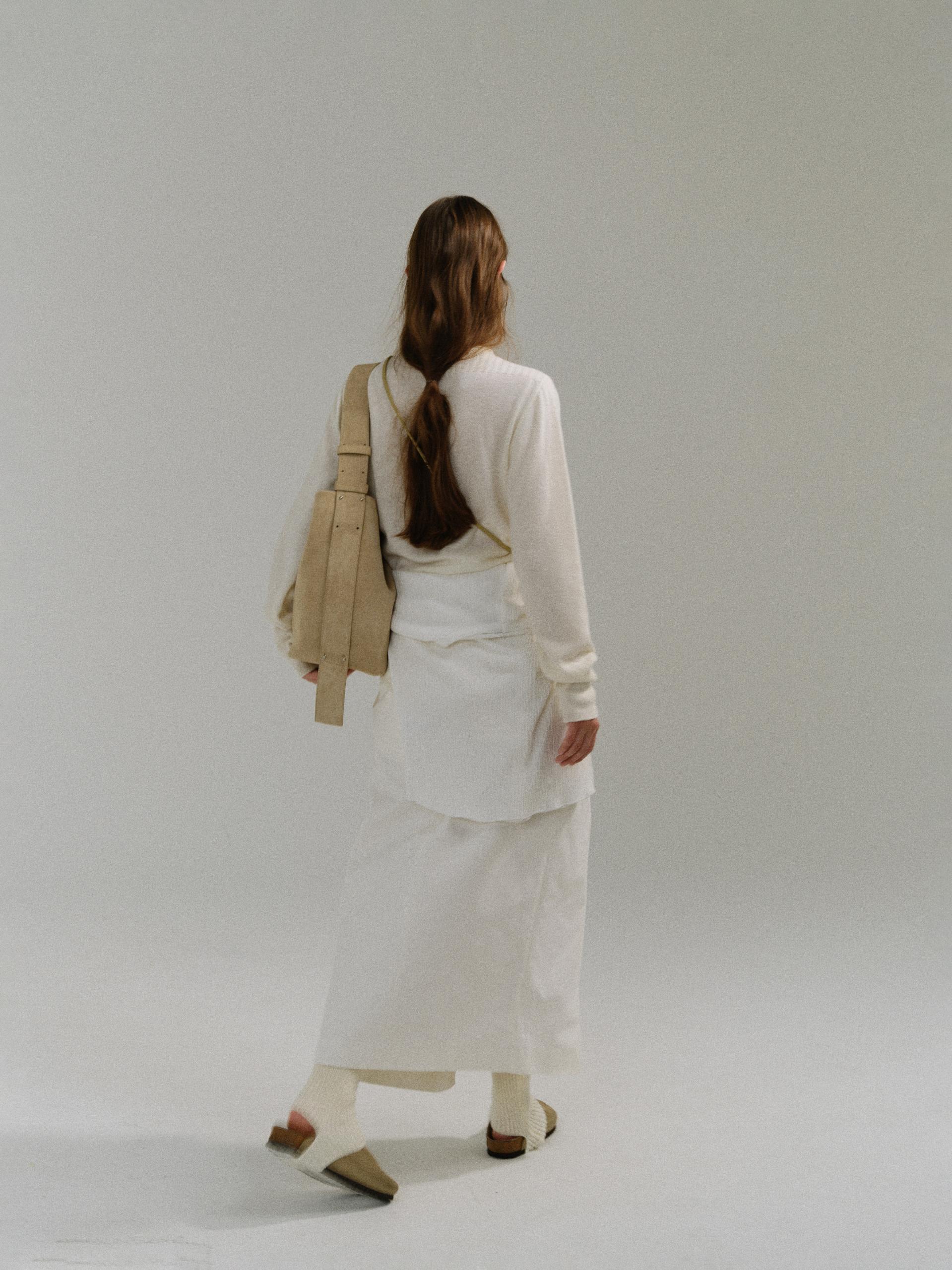 - 사선으로 겹쳐지는 앞판 라인은 조형적인 특징을 강조하며, 움직임에 따라 실루엣이 유연하게 흐릅니다.