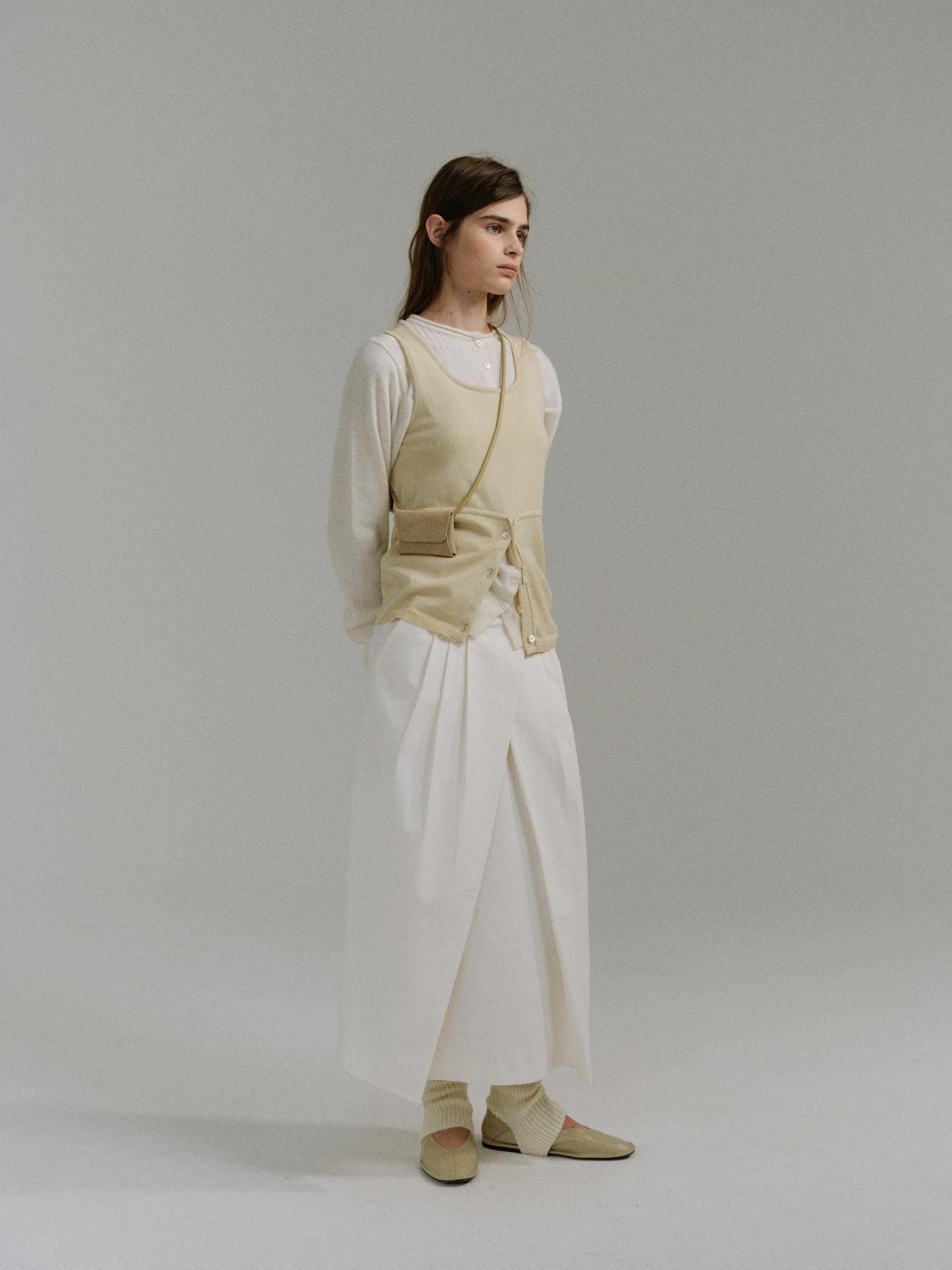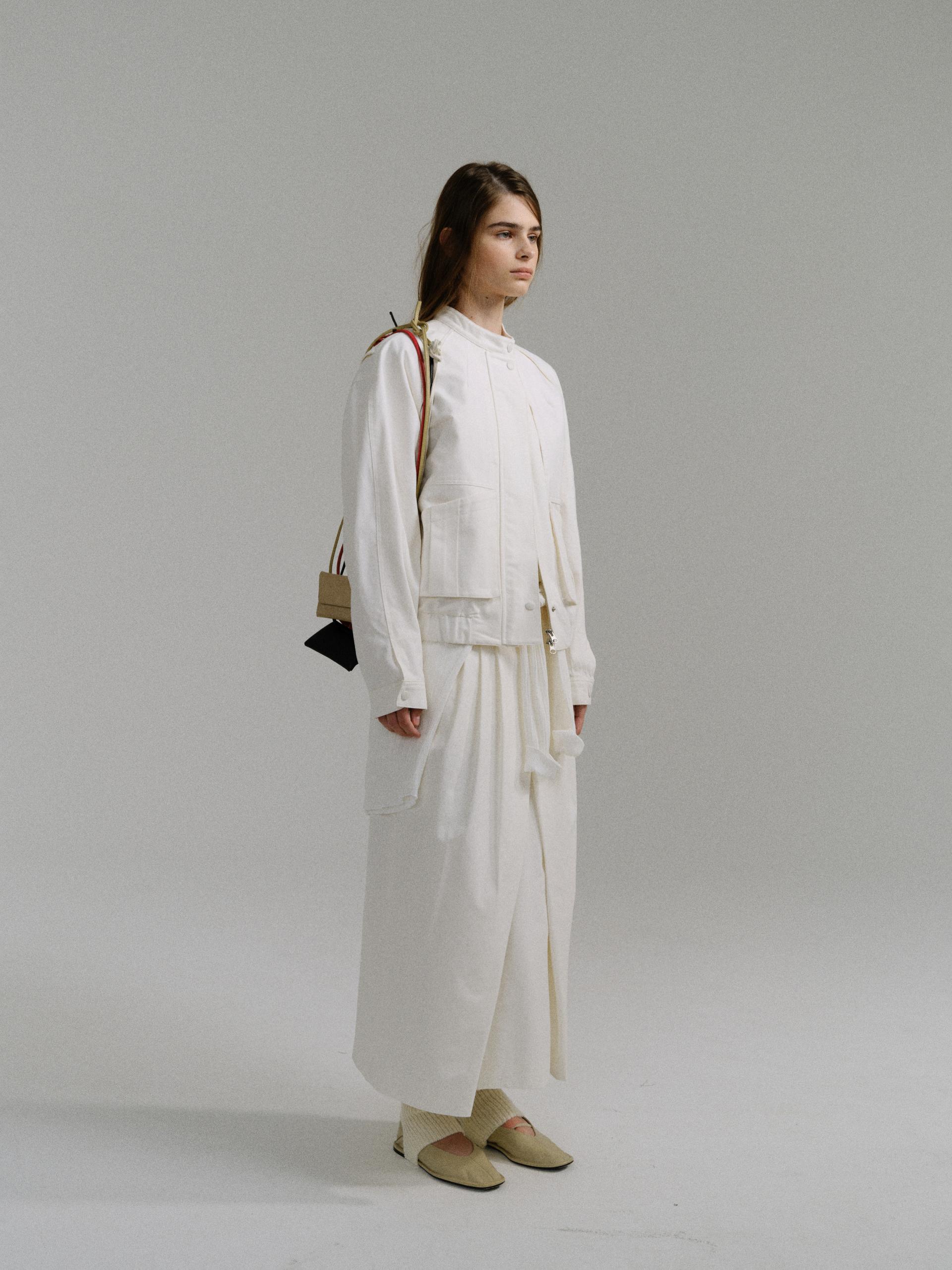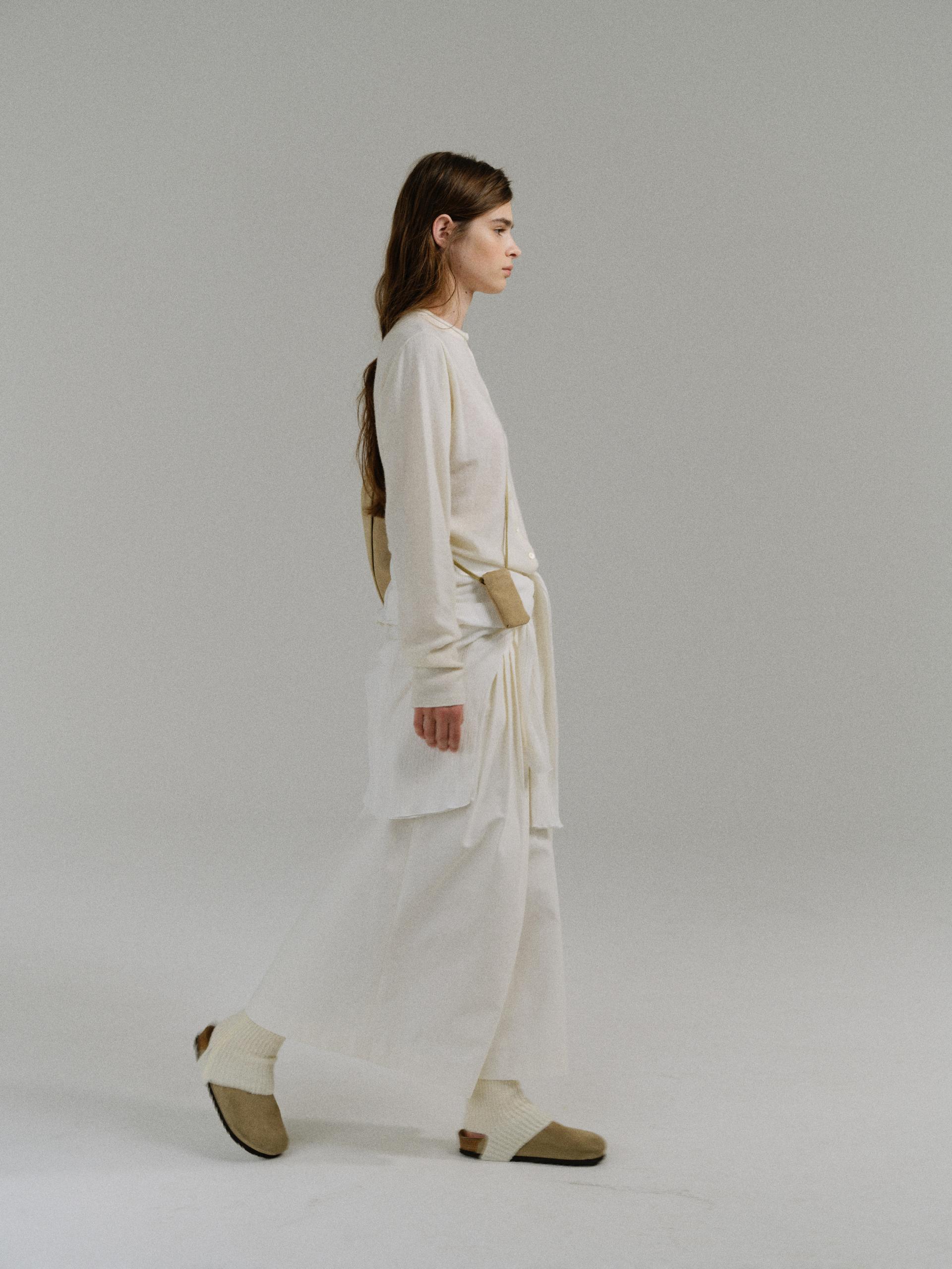 - 사선으로 겹쳐지는 앞판 라인은 조형적인 특징을 강조하며, 움직임에 따라 실루엣이 유연하게 흐릅니다.