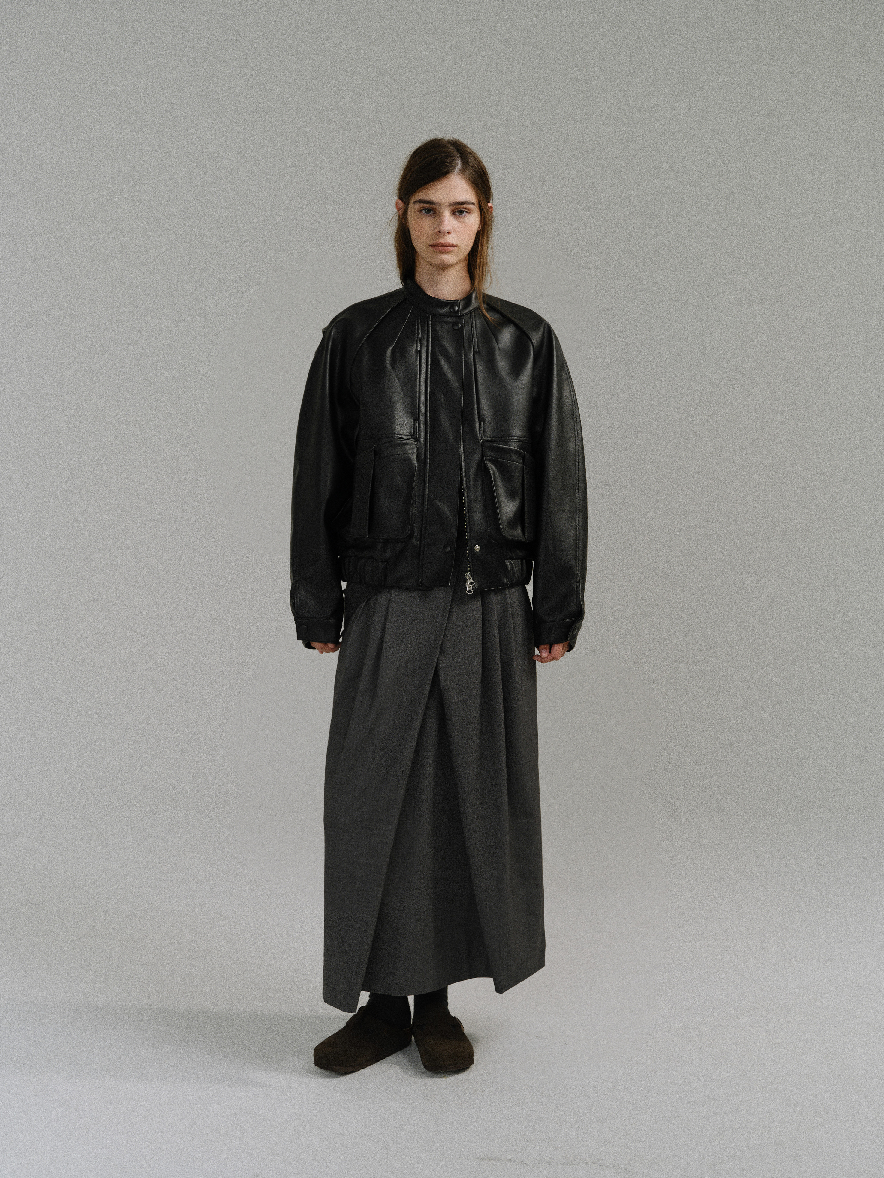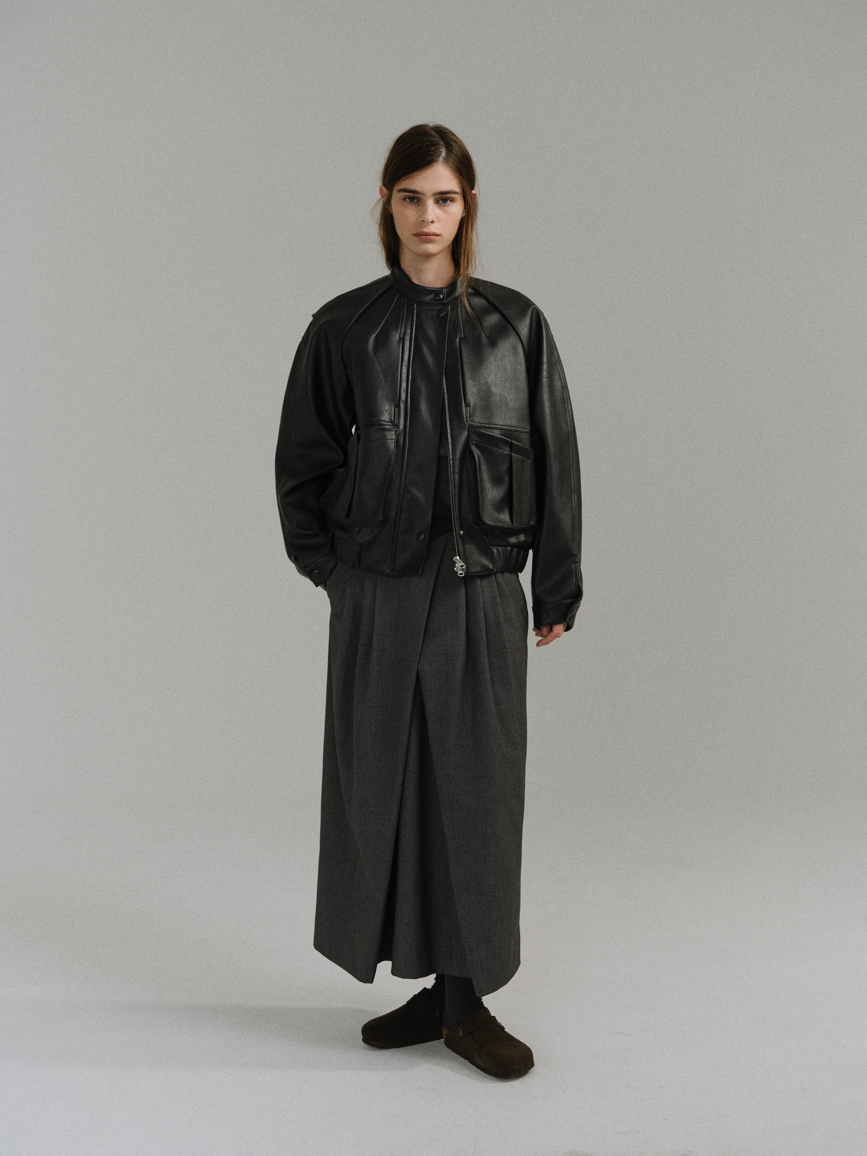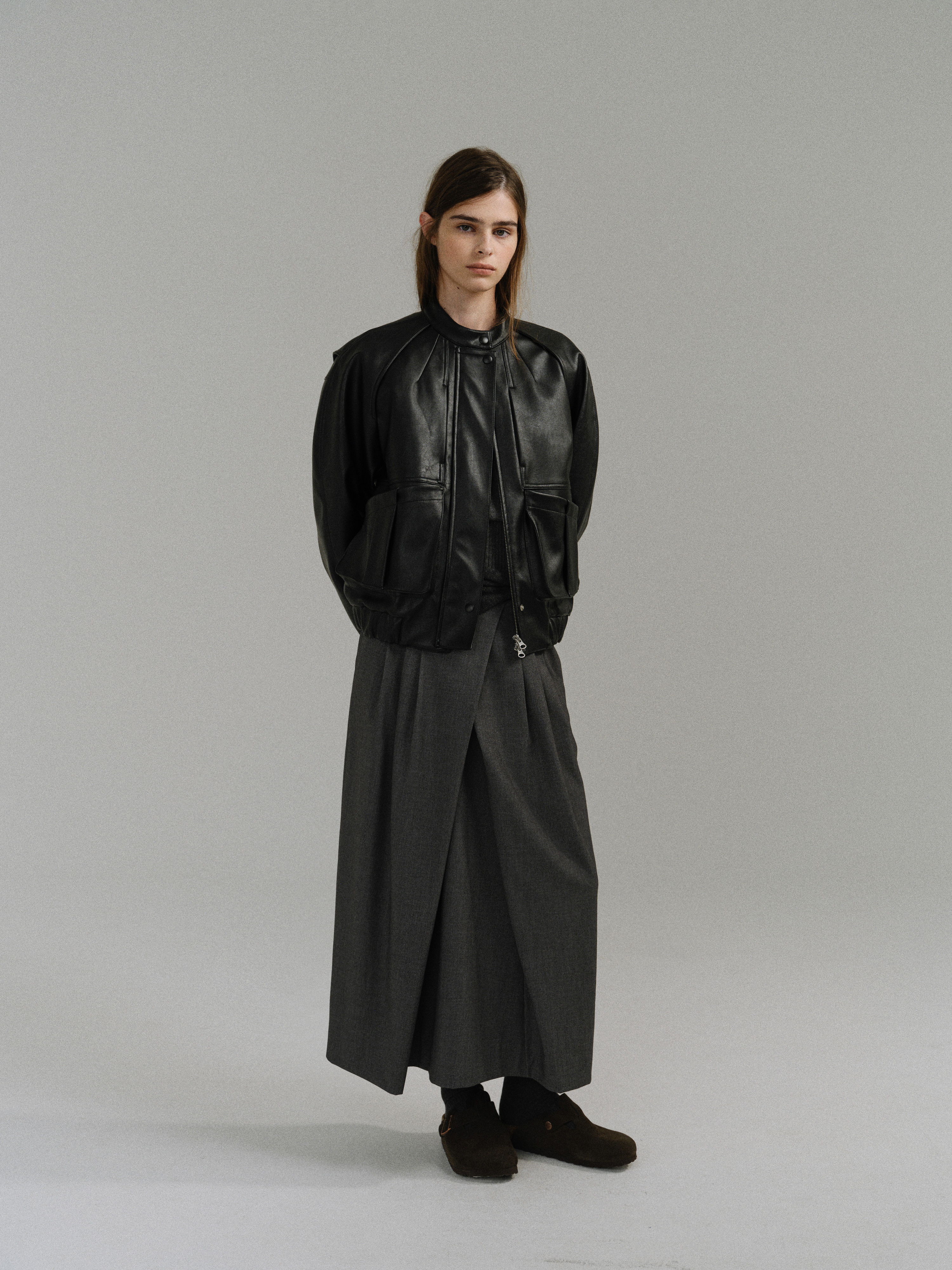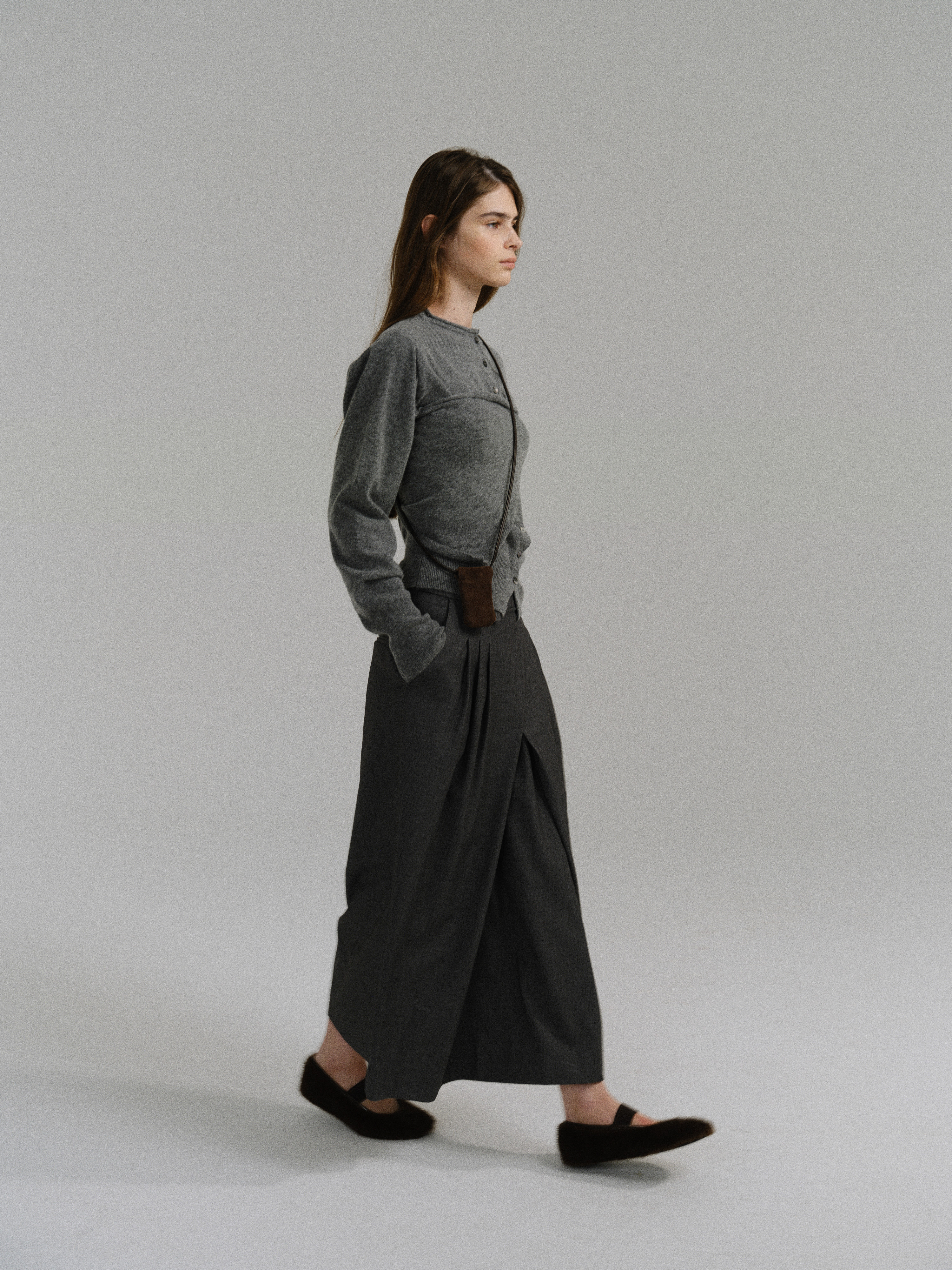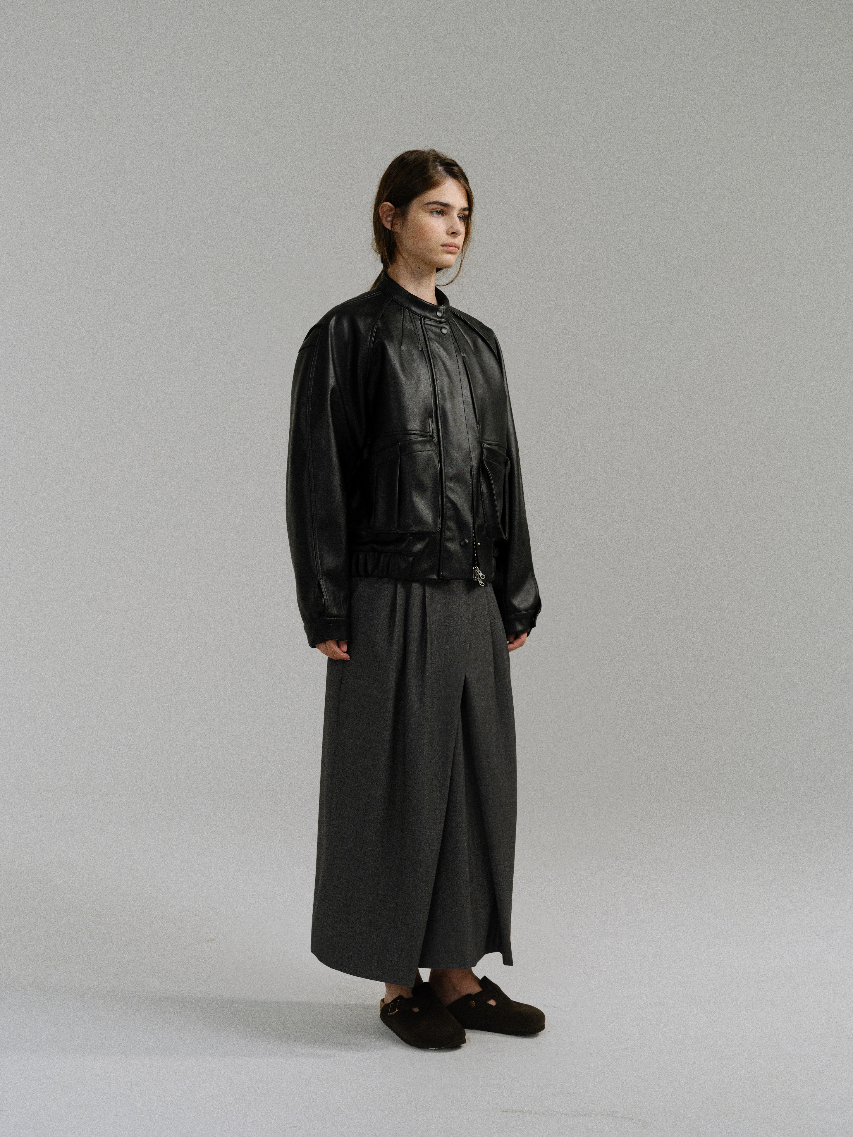 - 사선으로 겹쳐지는 앞판 라인은 조형적인 특징을 강조하며, 움직임에 따라 실루엣이 유연하게 흐릅니다.