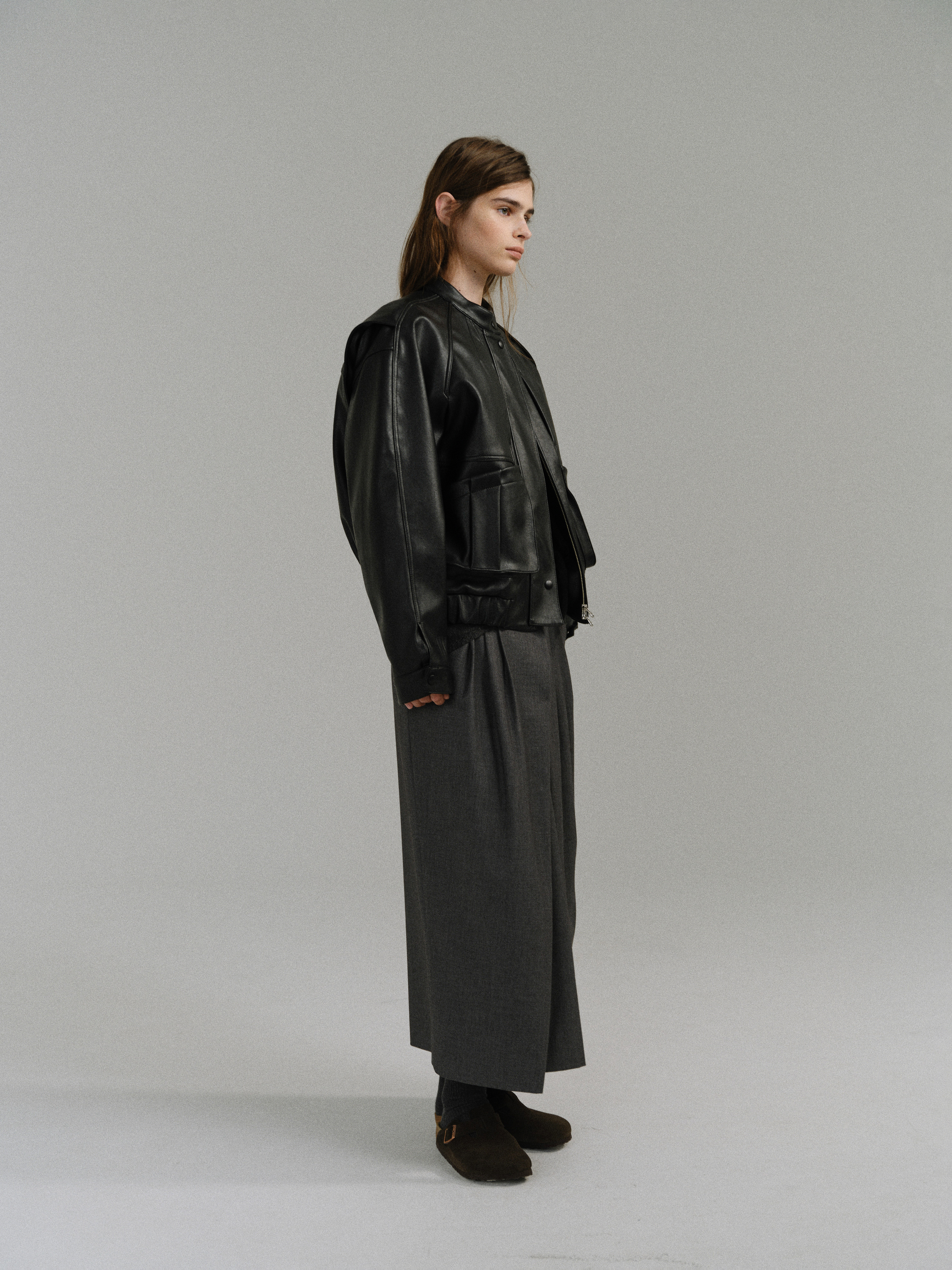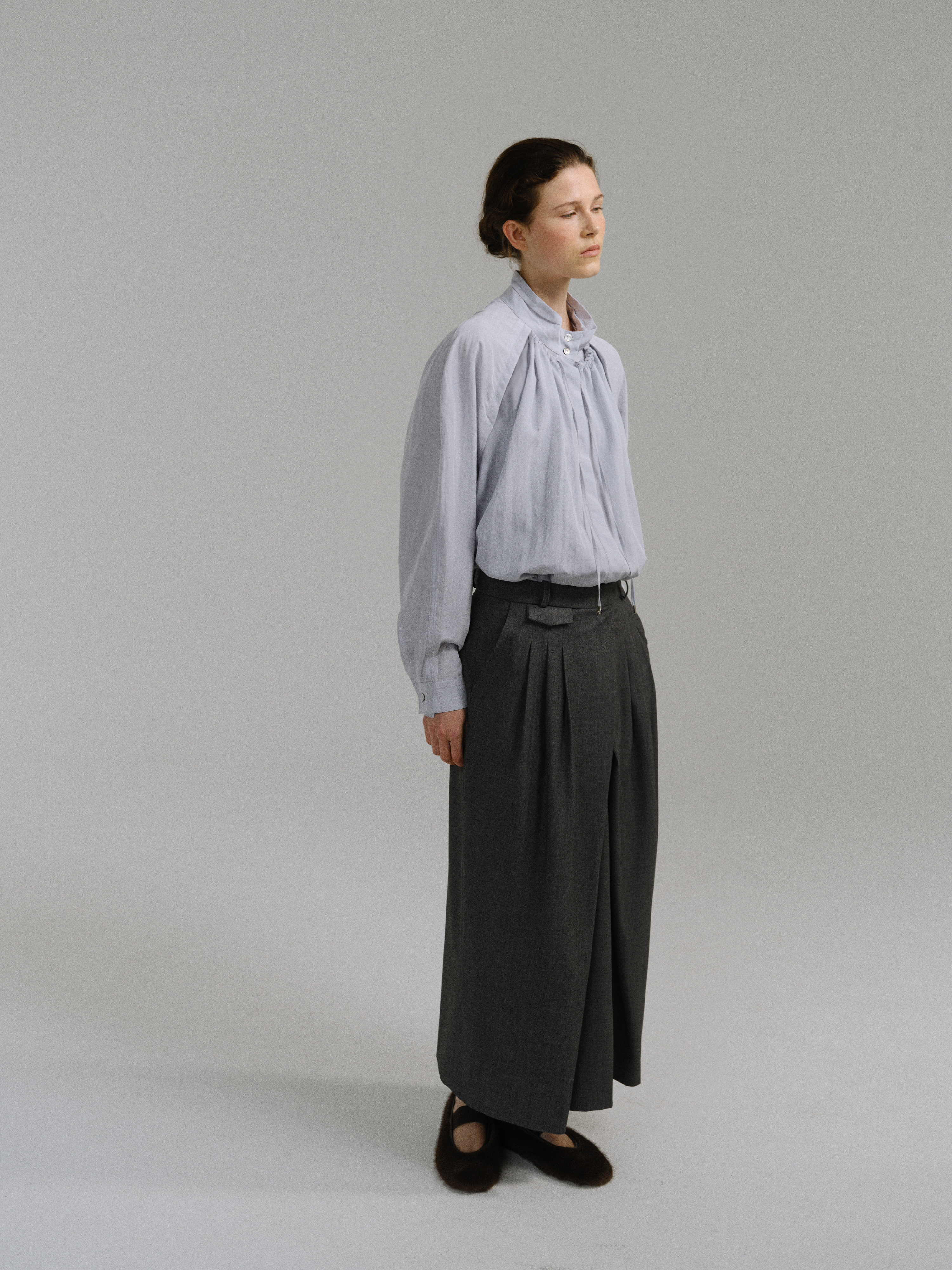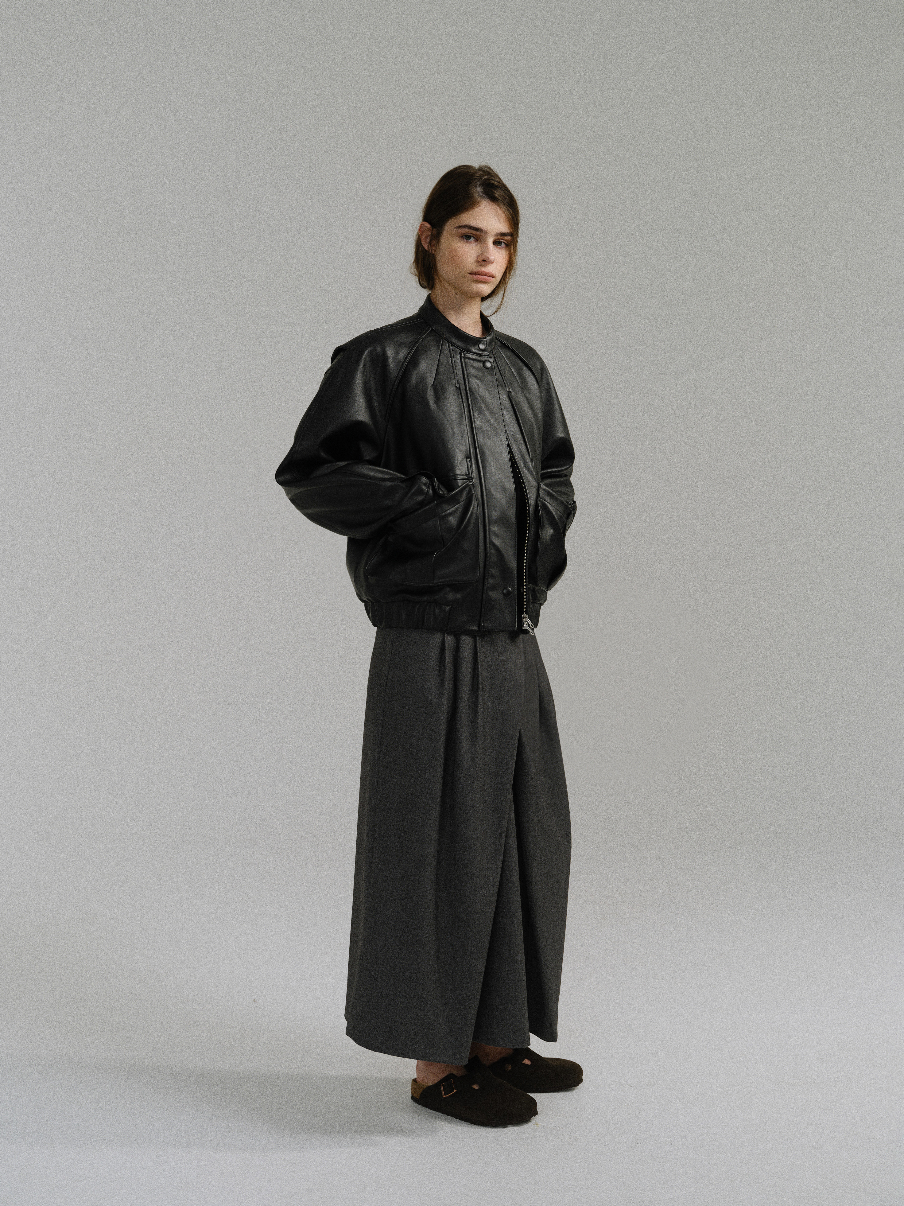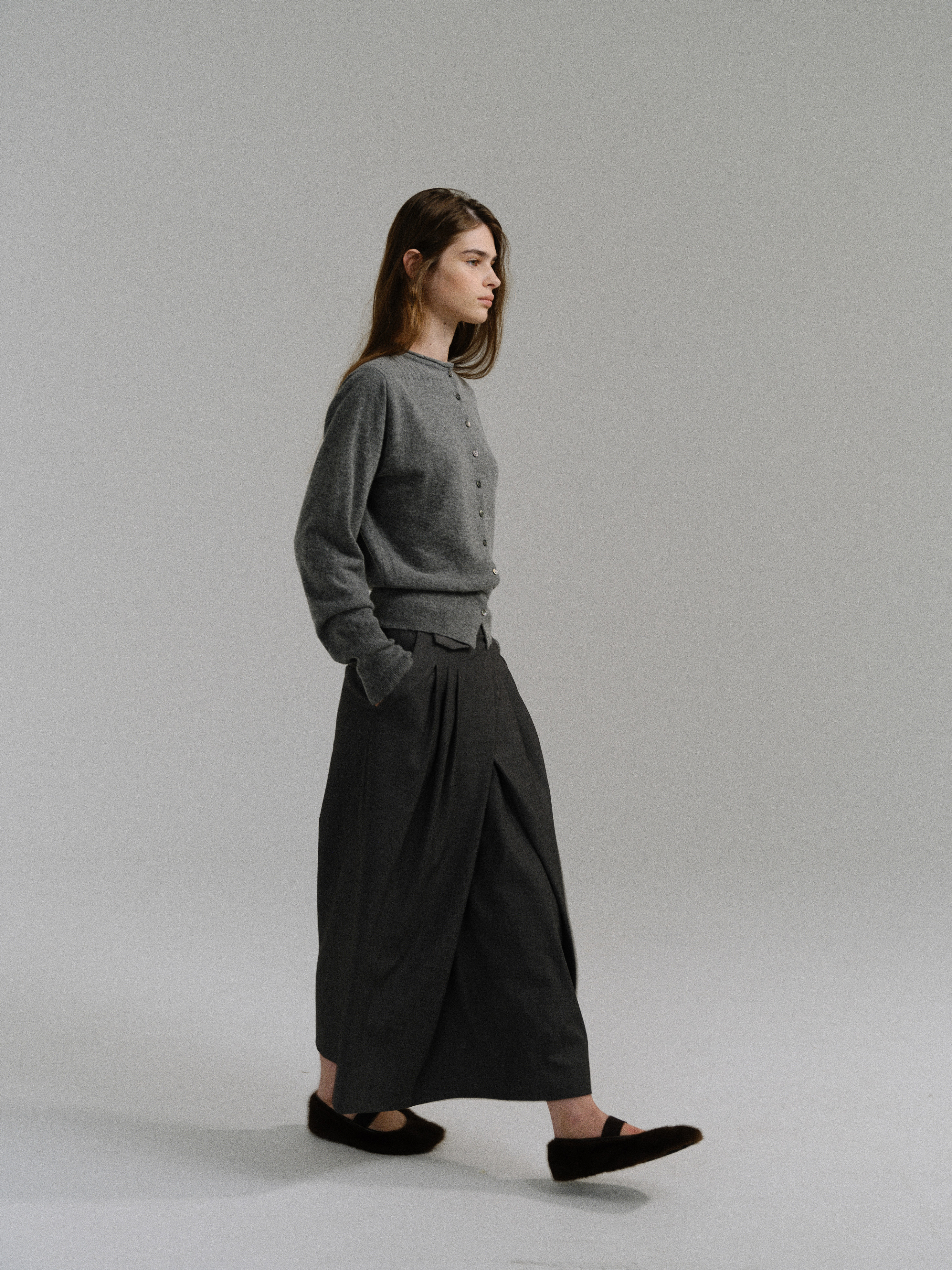 - 사선으로 겹쳐지는 앞판 라인은 조형적인 특징을 강조하며, 움직임에 따라 실루엣이 유연하게 흐릅니다.