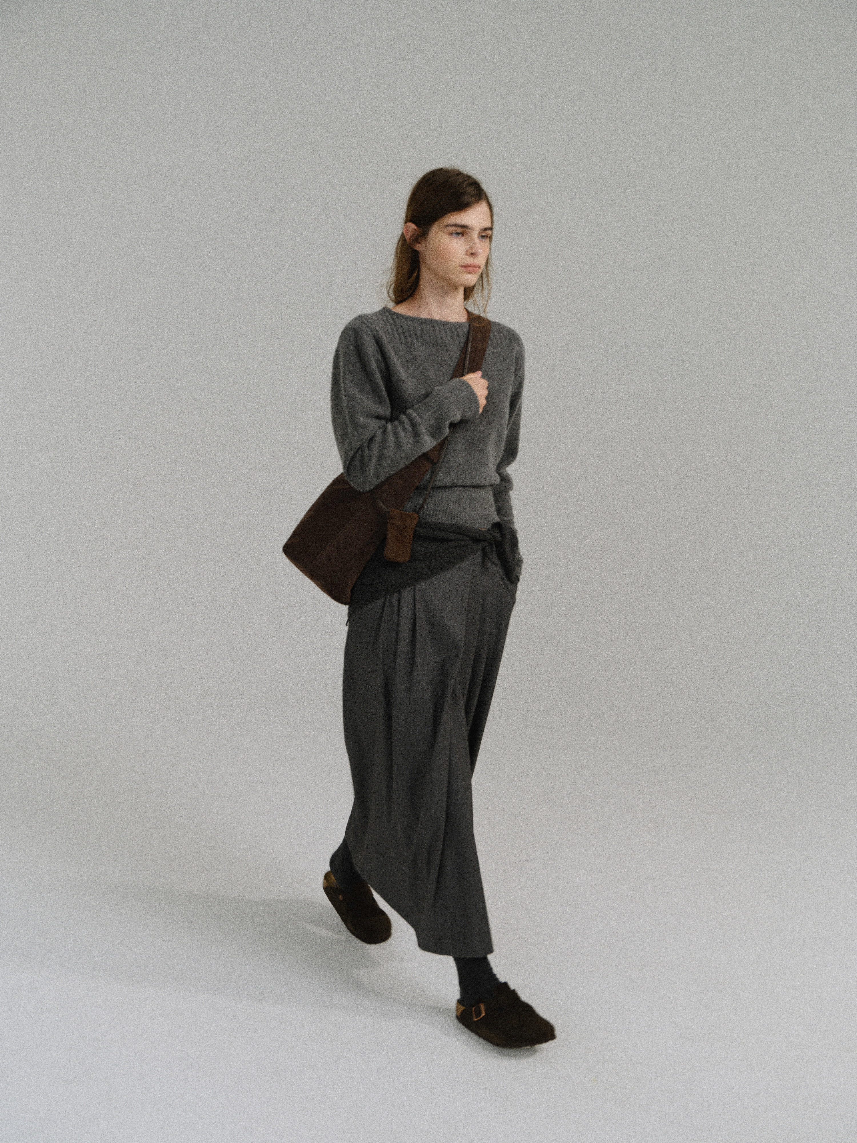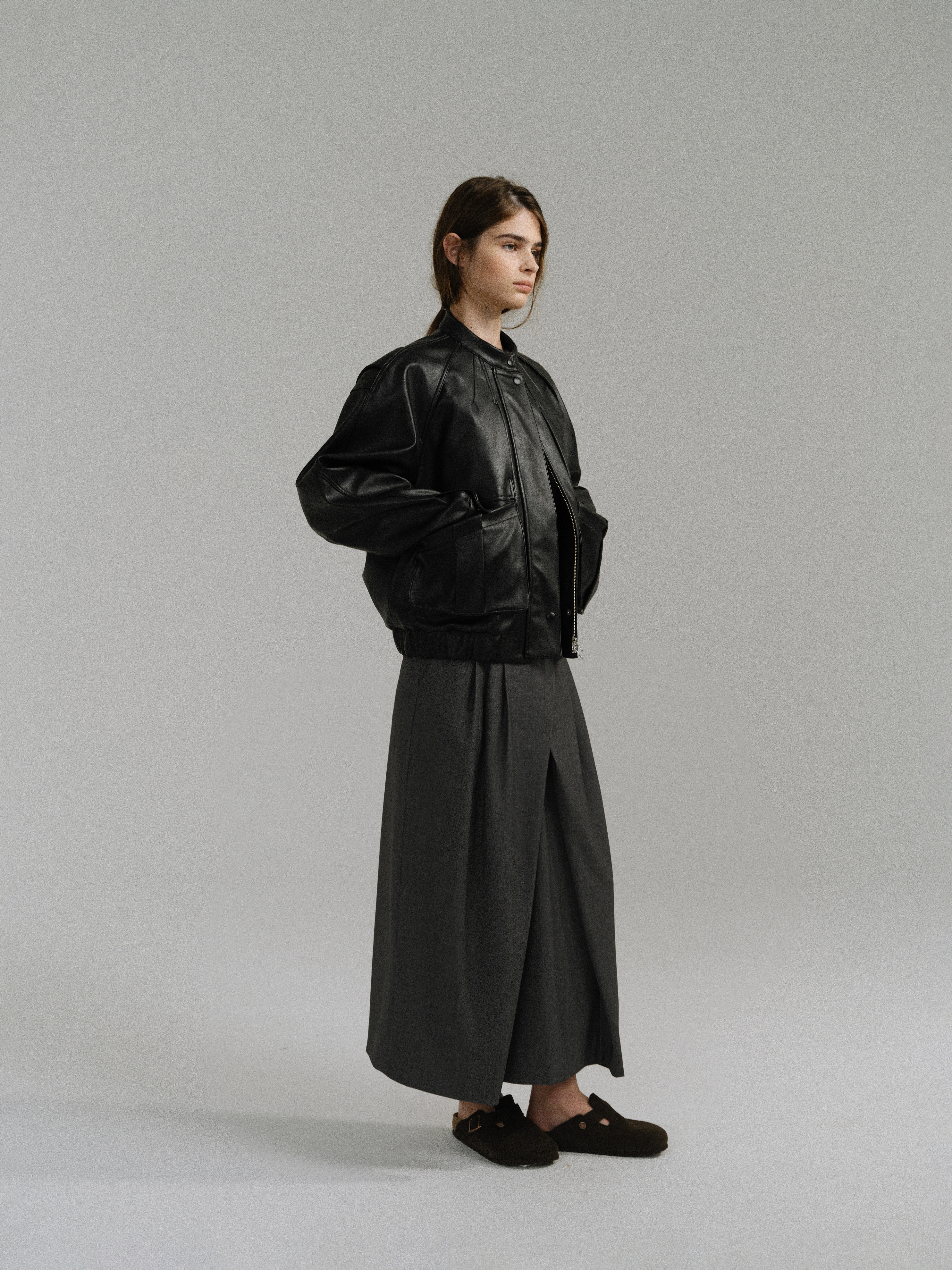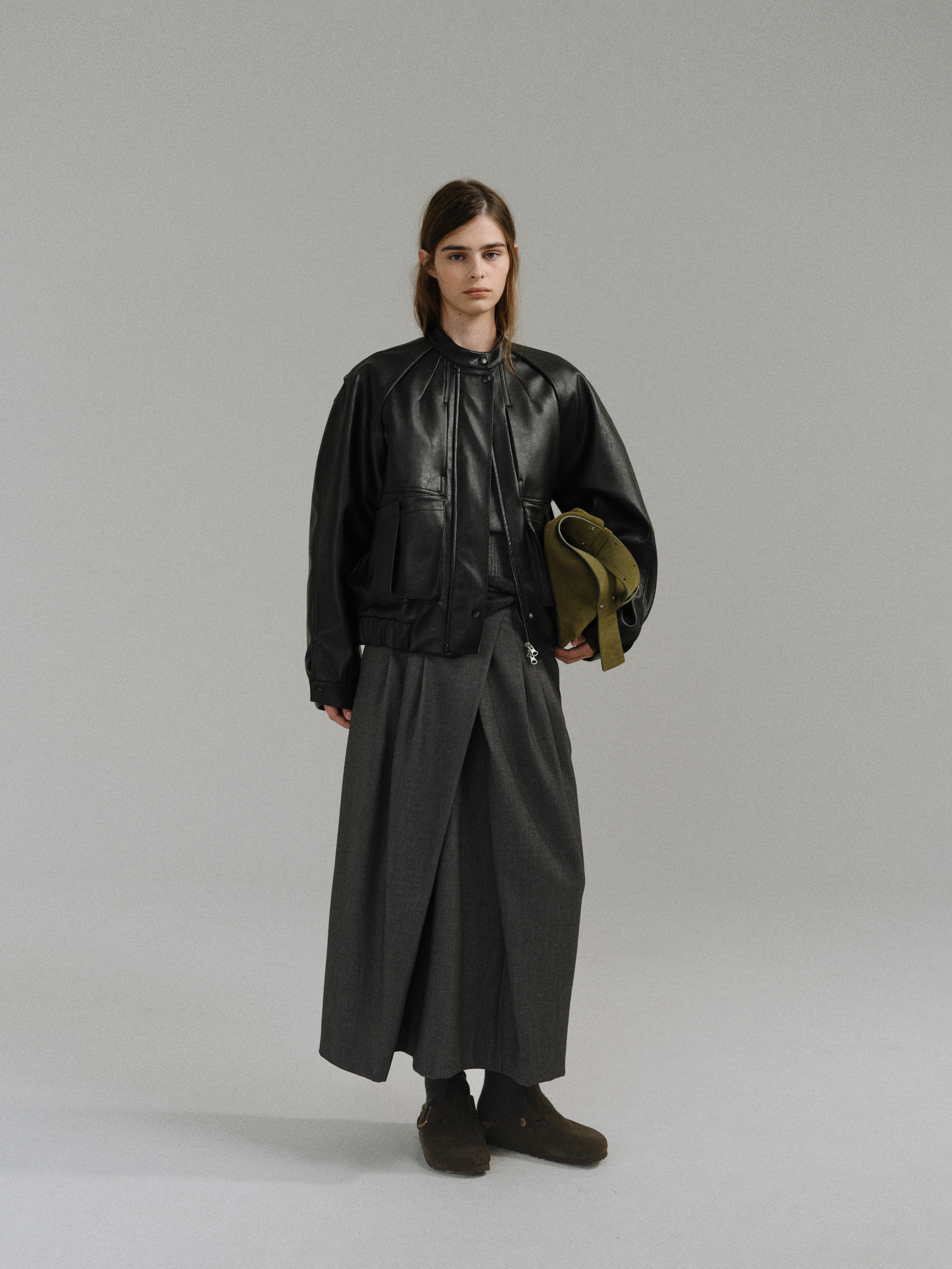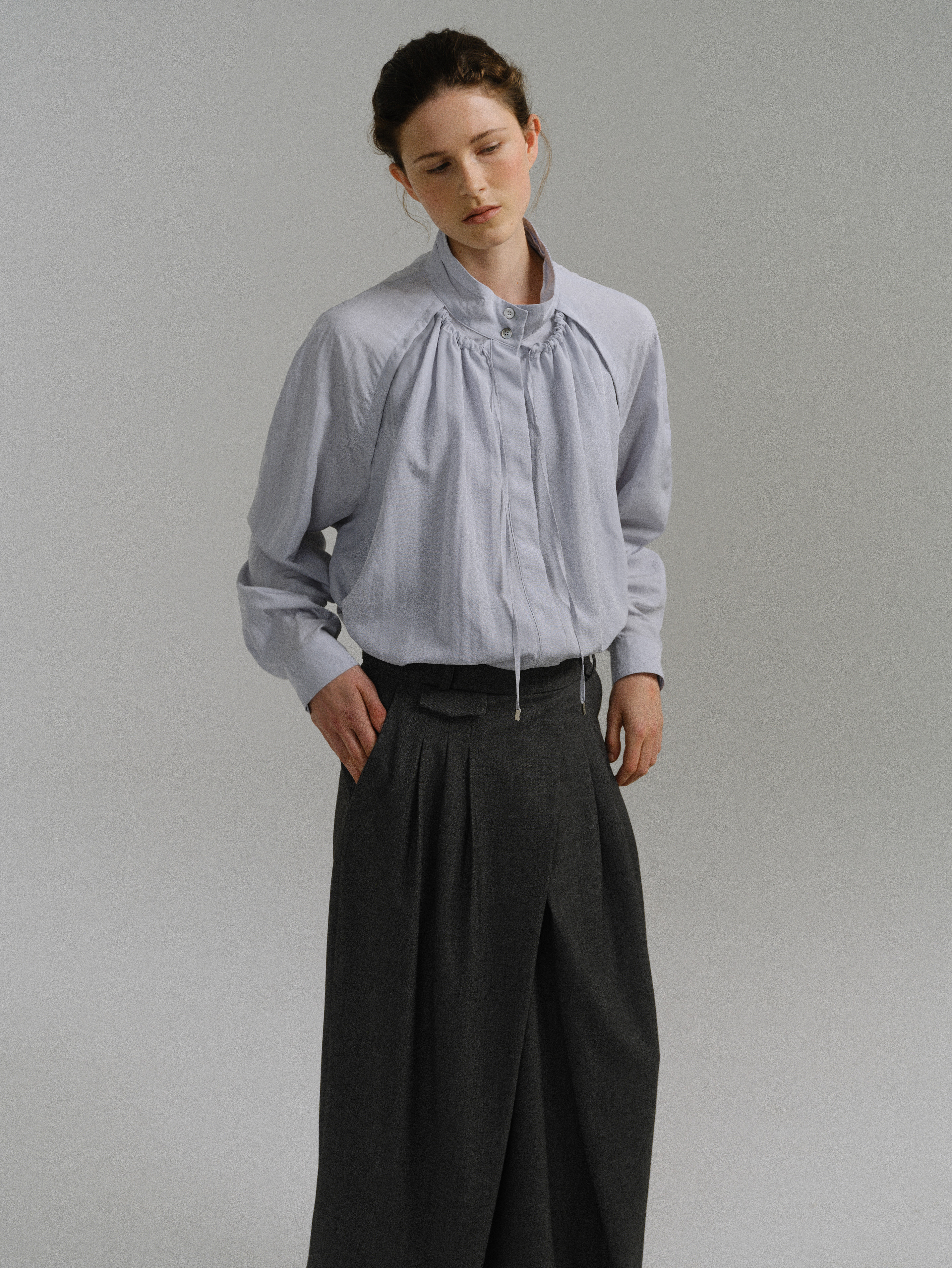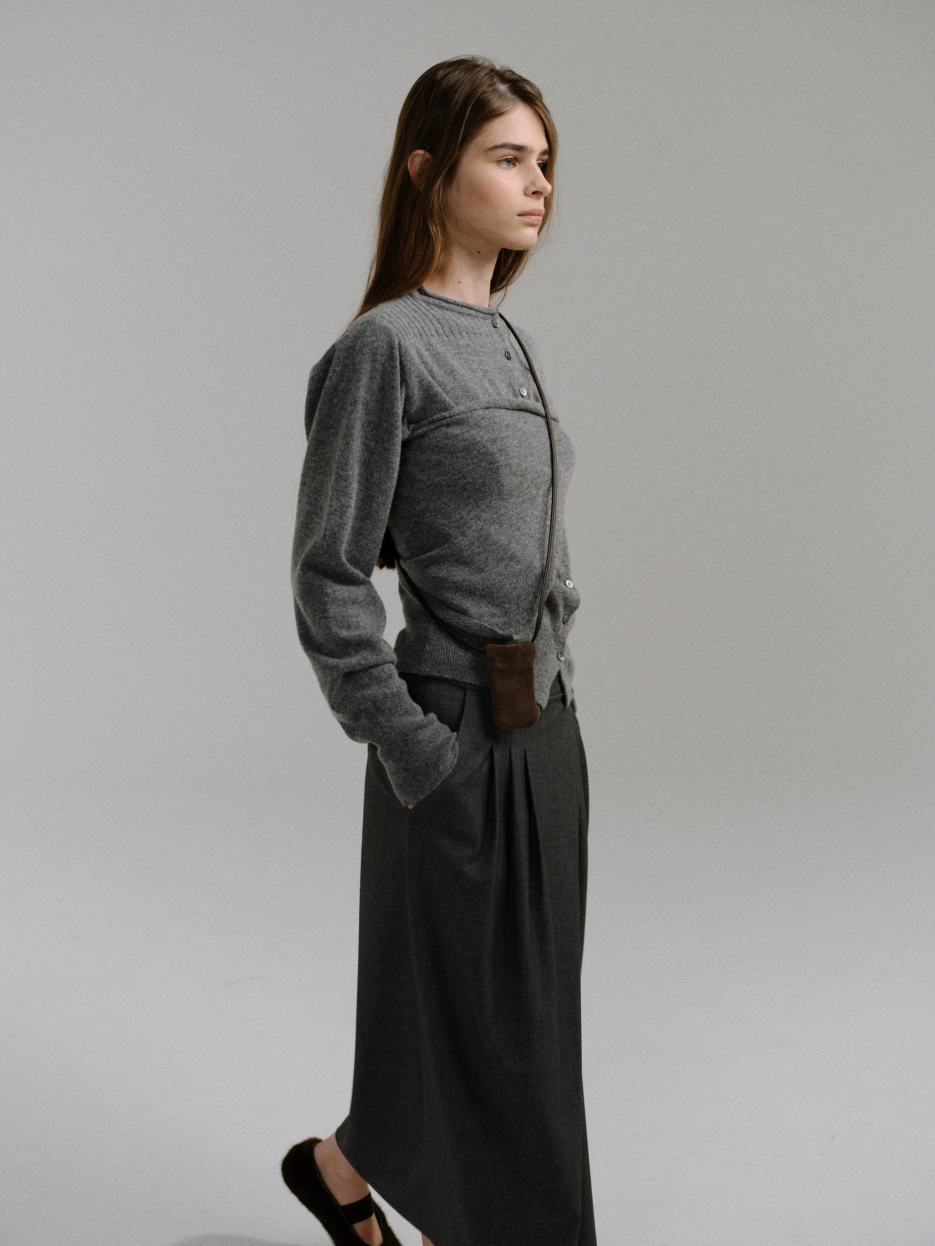 - 사선으로 겹쳐지는 앞판 라인은 조형적인 특징을 강조하며, 움직임에 따라 실루엣이 유연하게 흐릅니다.