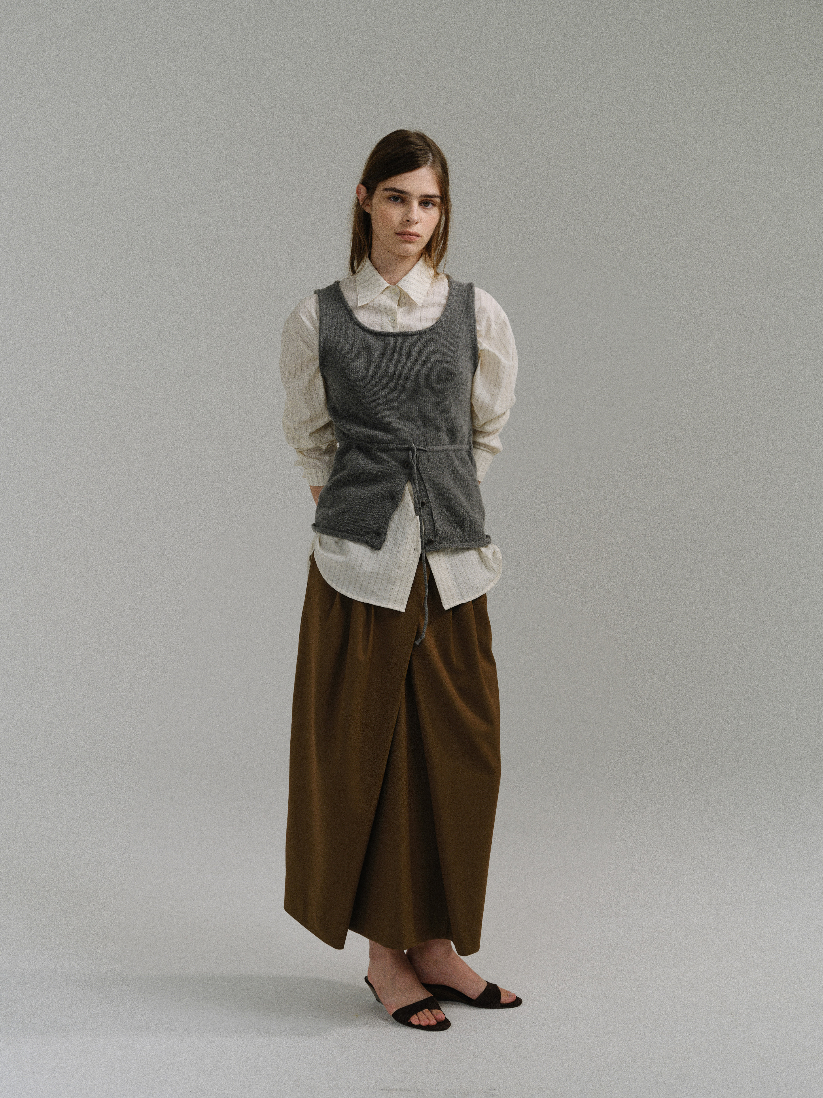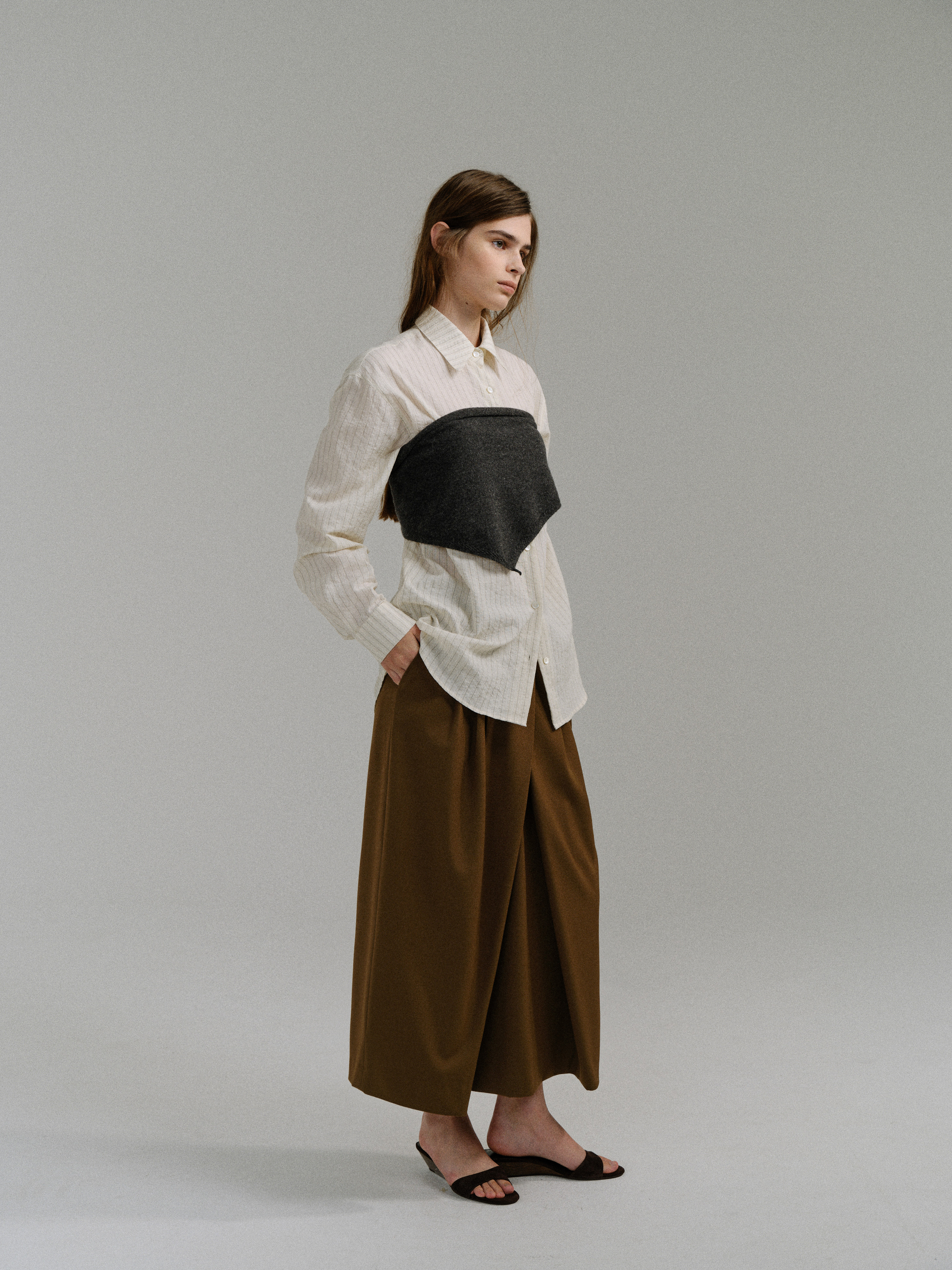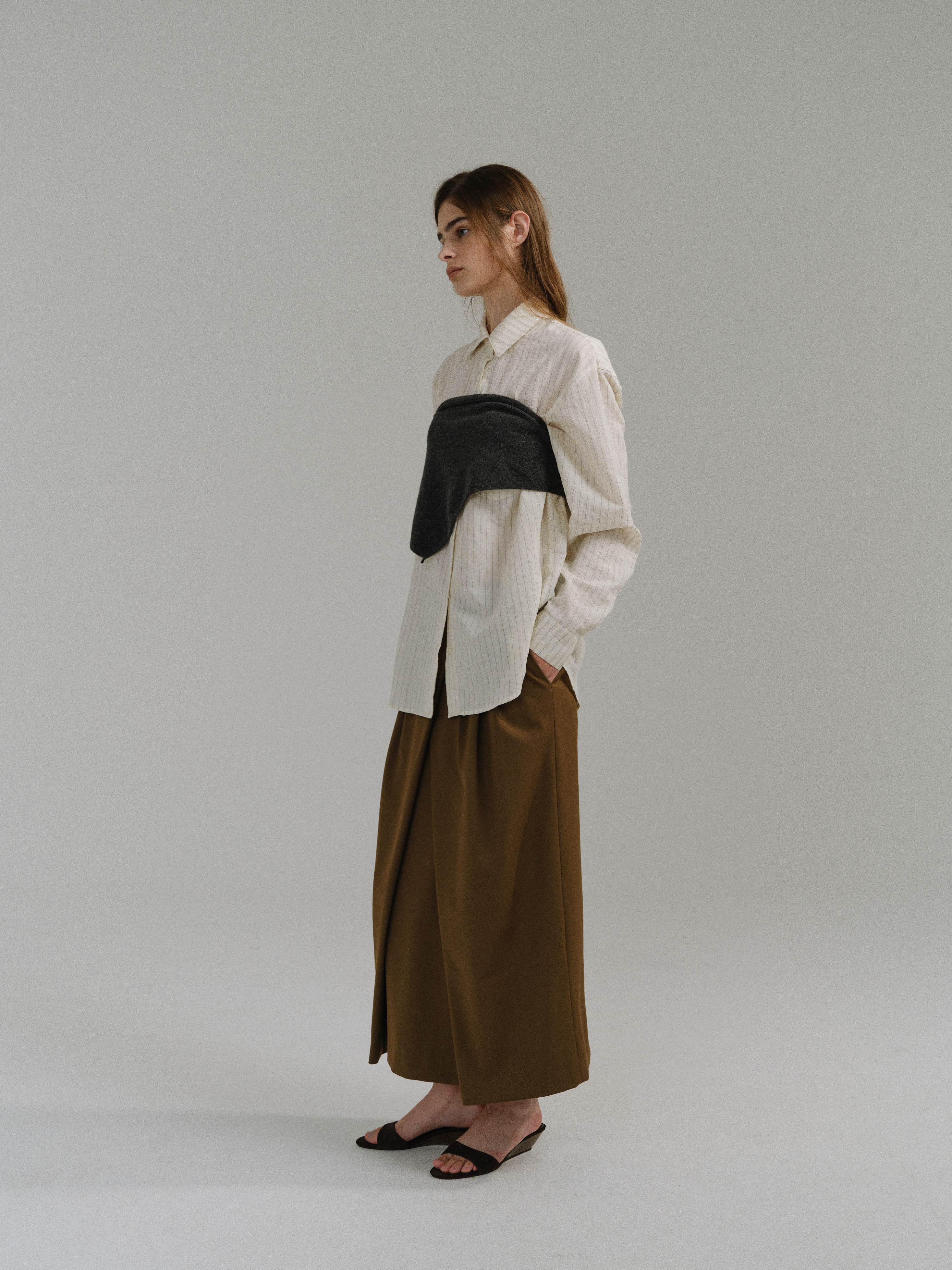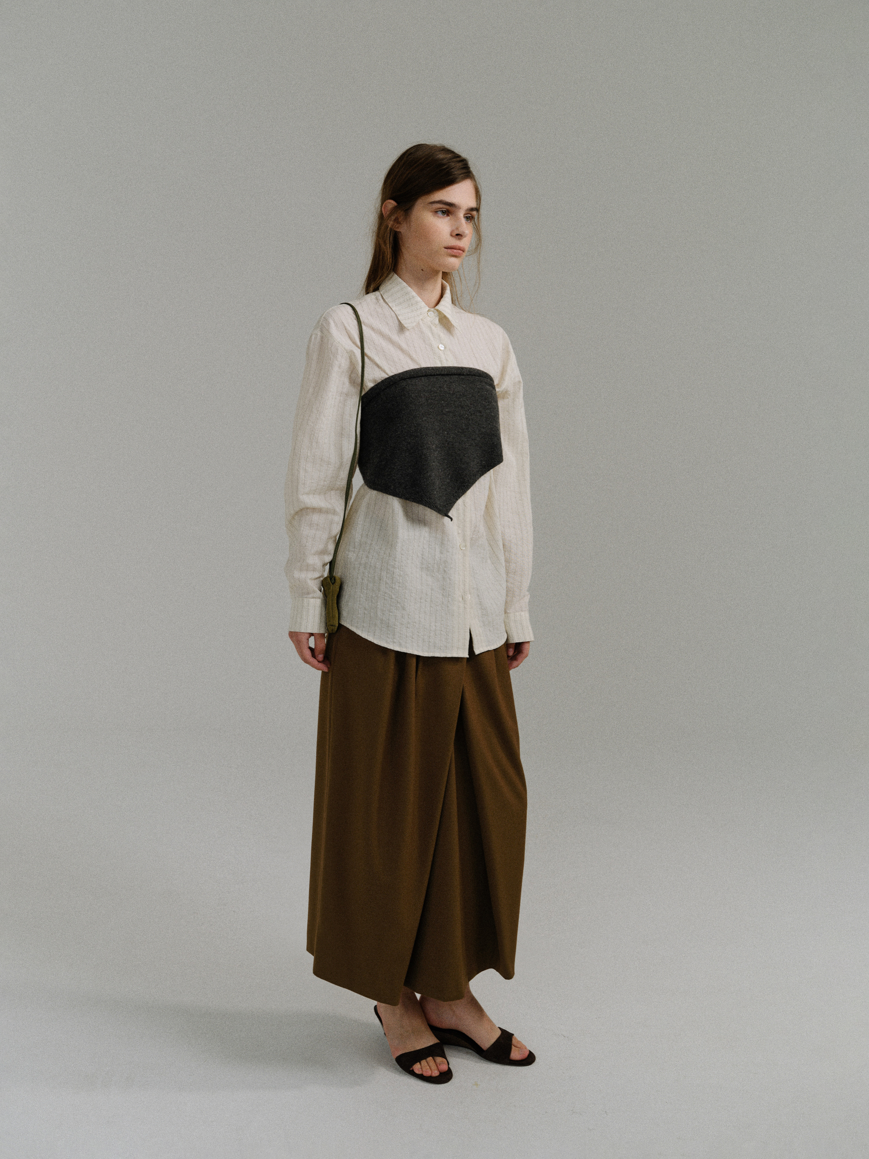- 사선으로 겹쳐지는 앞판 라인은 조형적인 특징을 강조하며, 움직임에 따라 실루엣이 유연하게 흐릅니다.