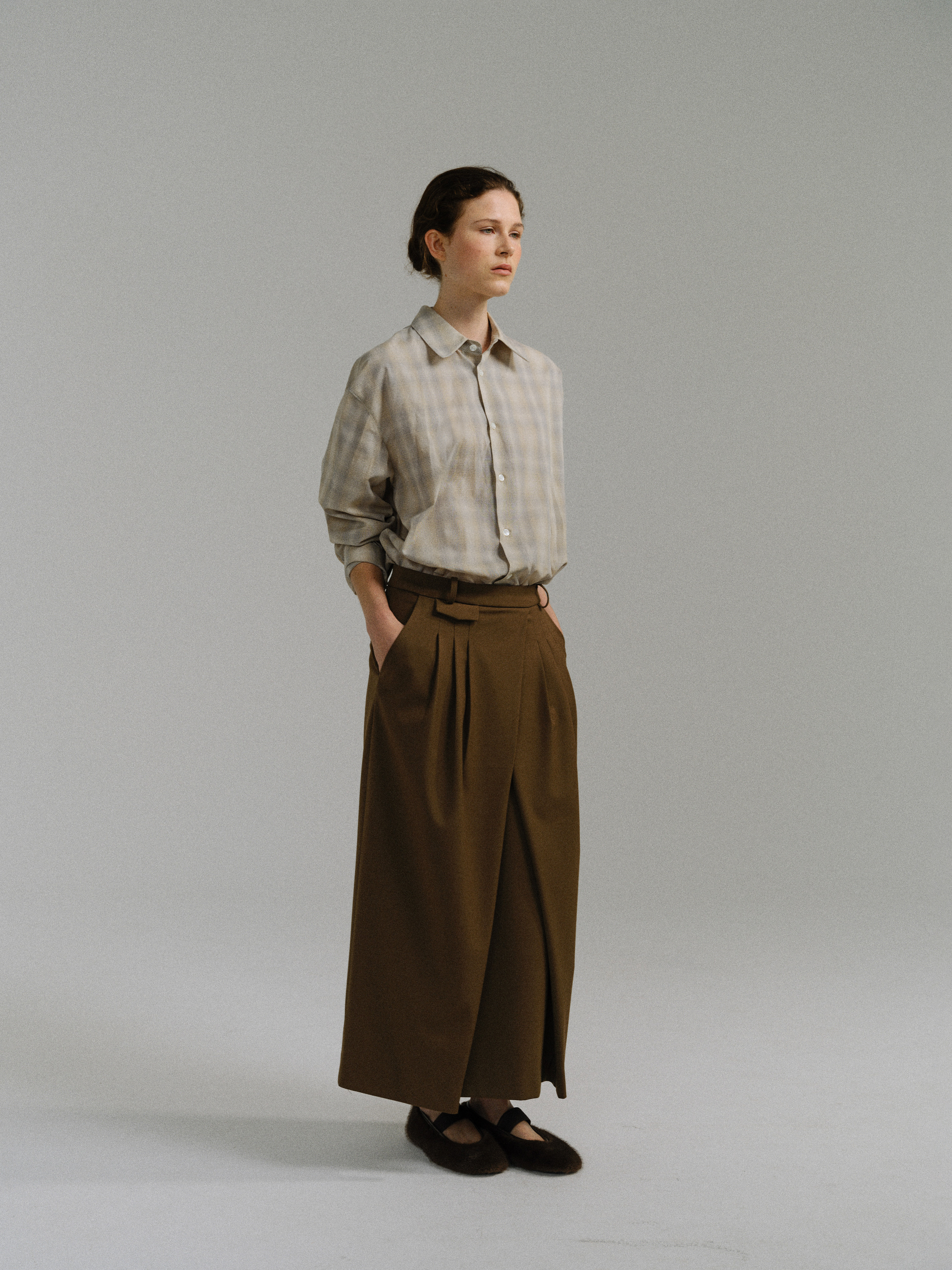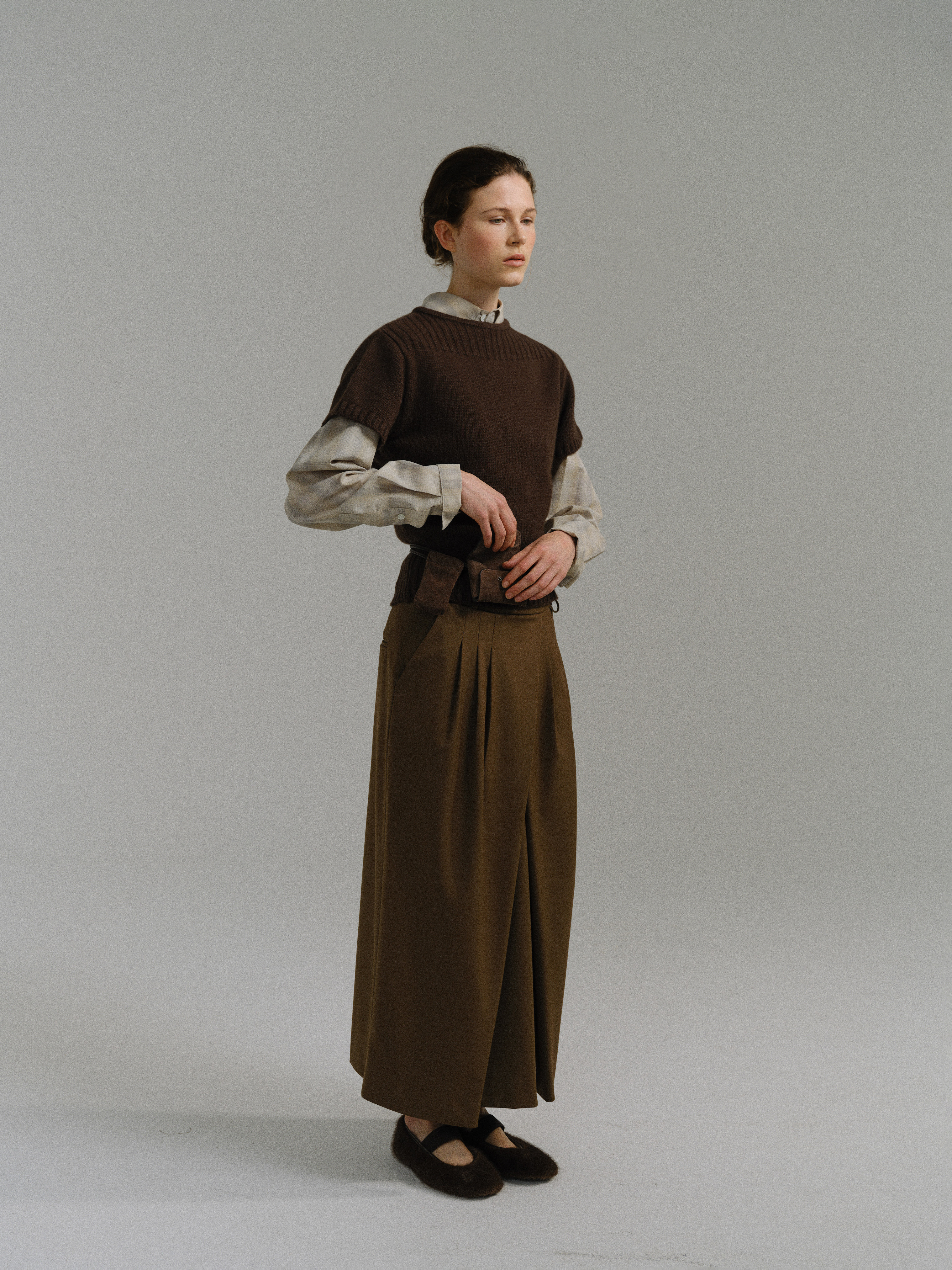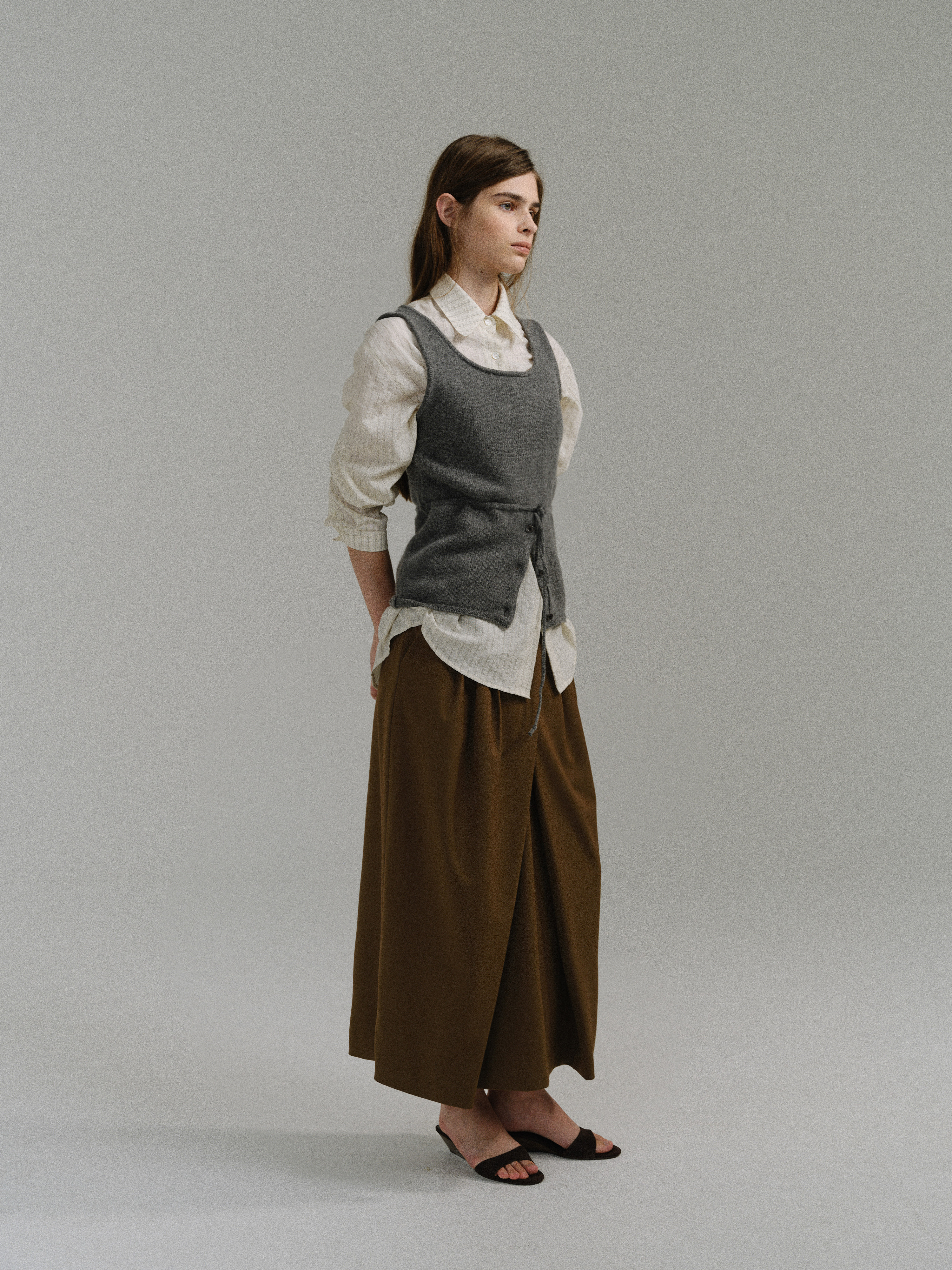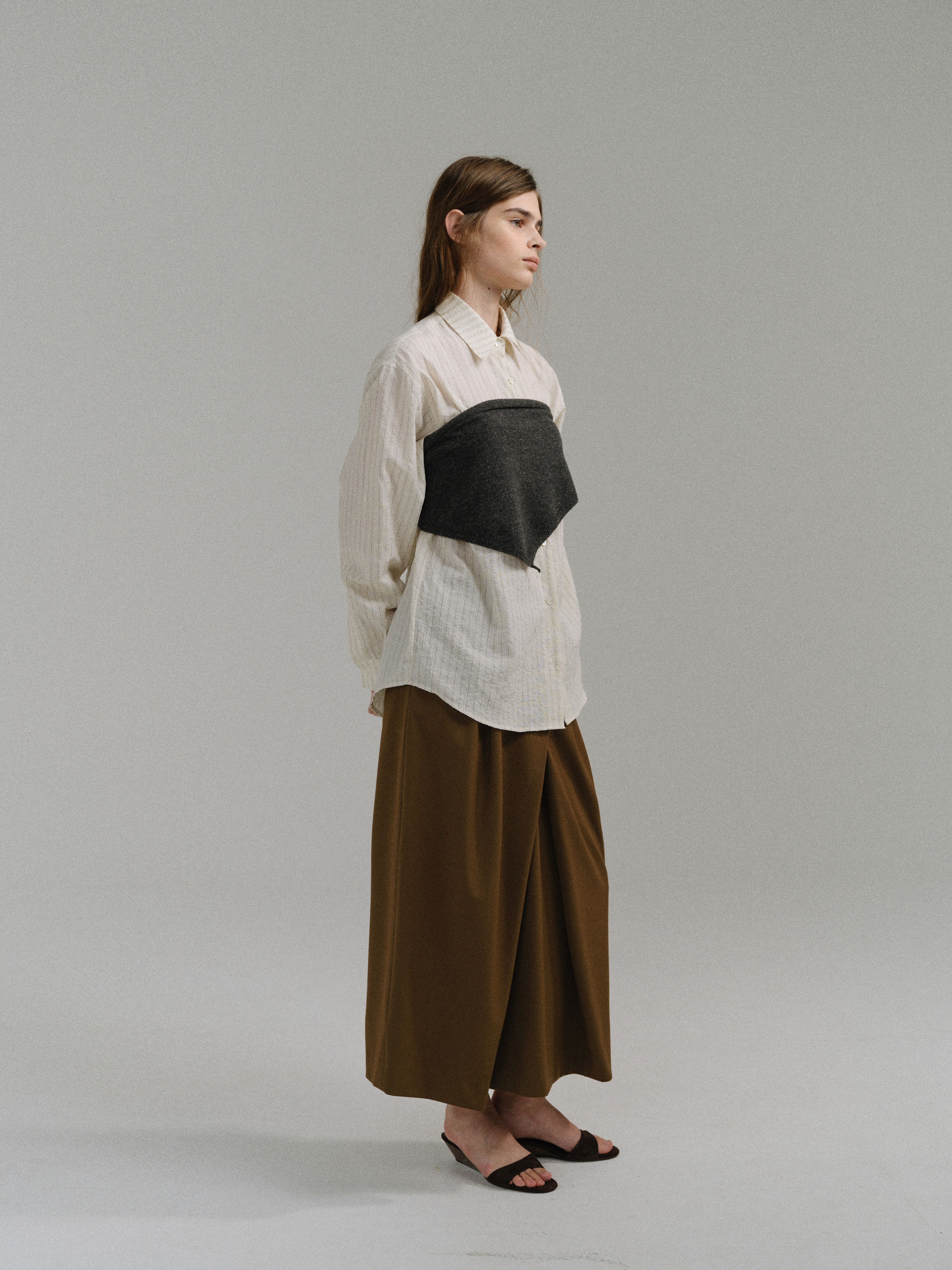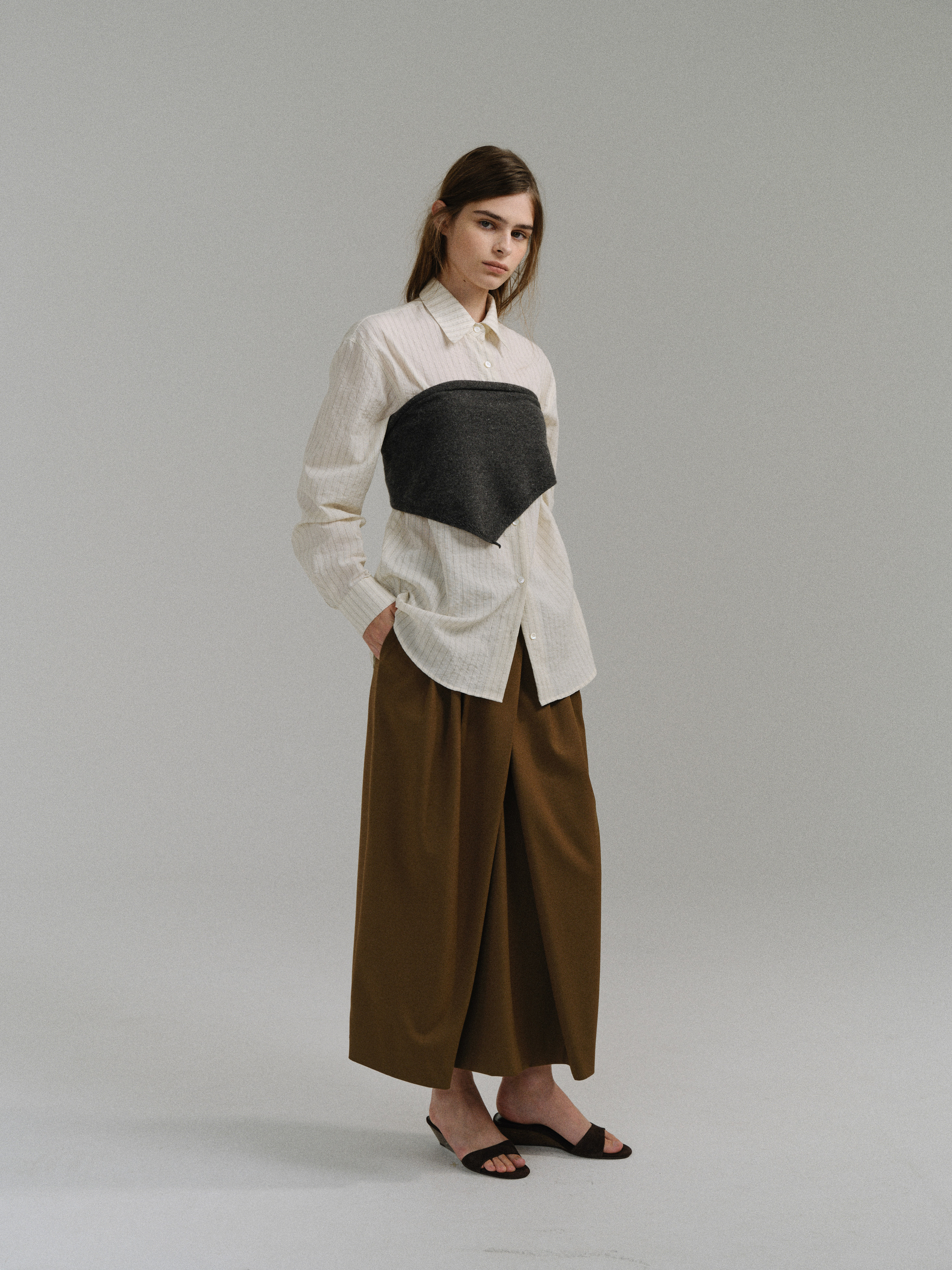 - 사선으로 겹쳐지는 앞판 라인은 조형적인 특징을 강조하며, 움직임에 따라 실루엣이 유연하게 흐릅니다.