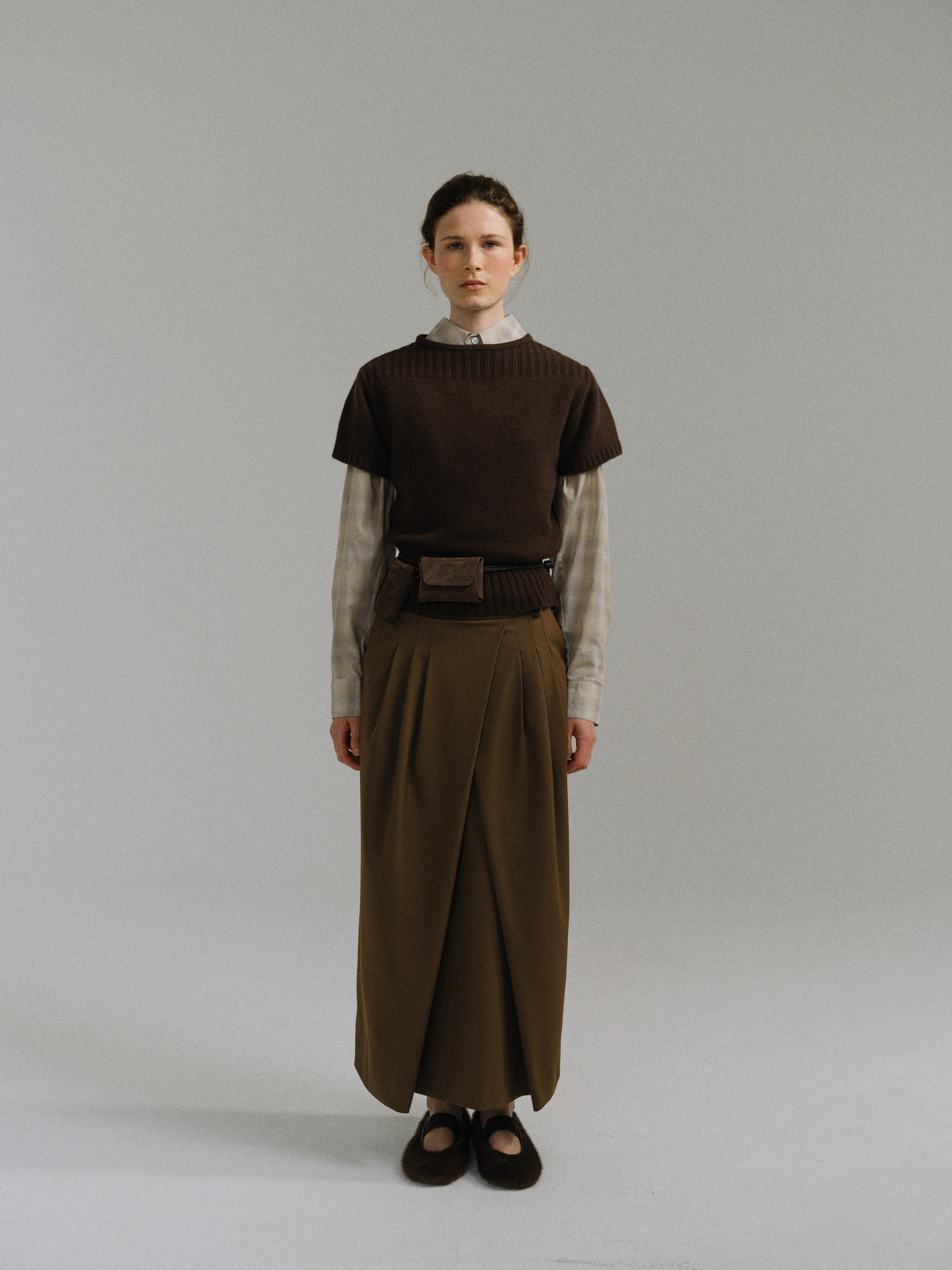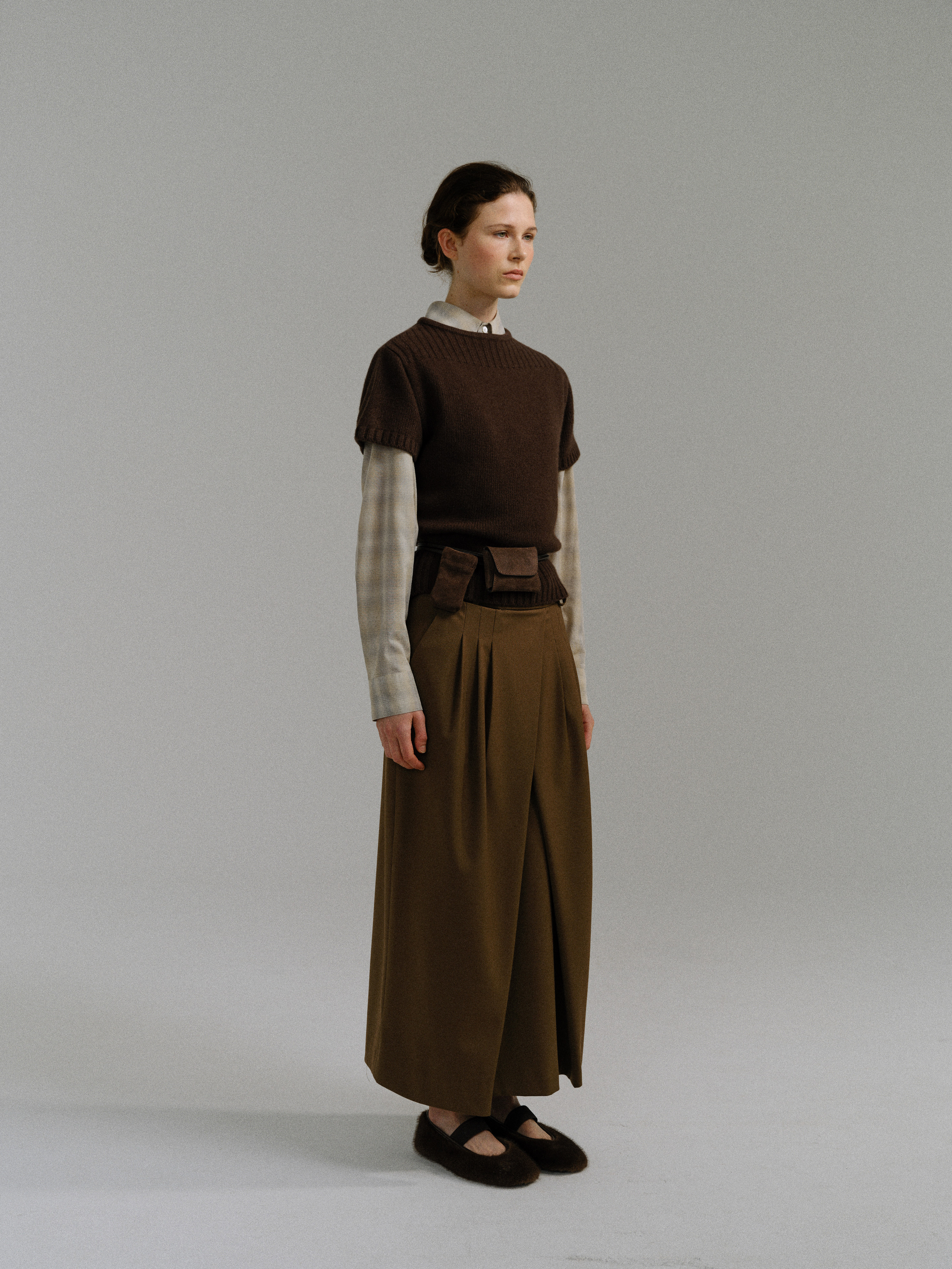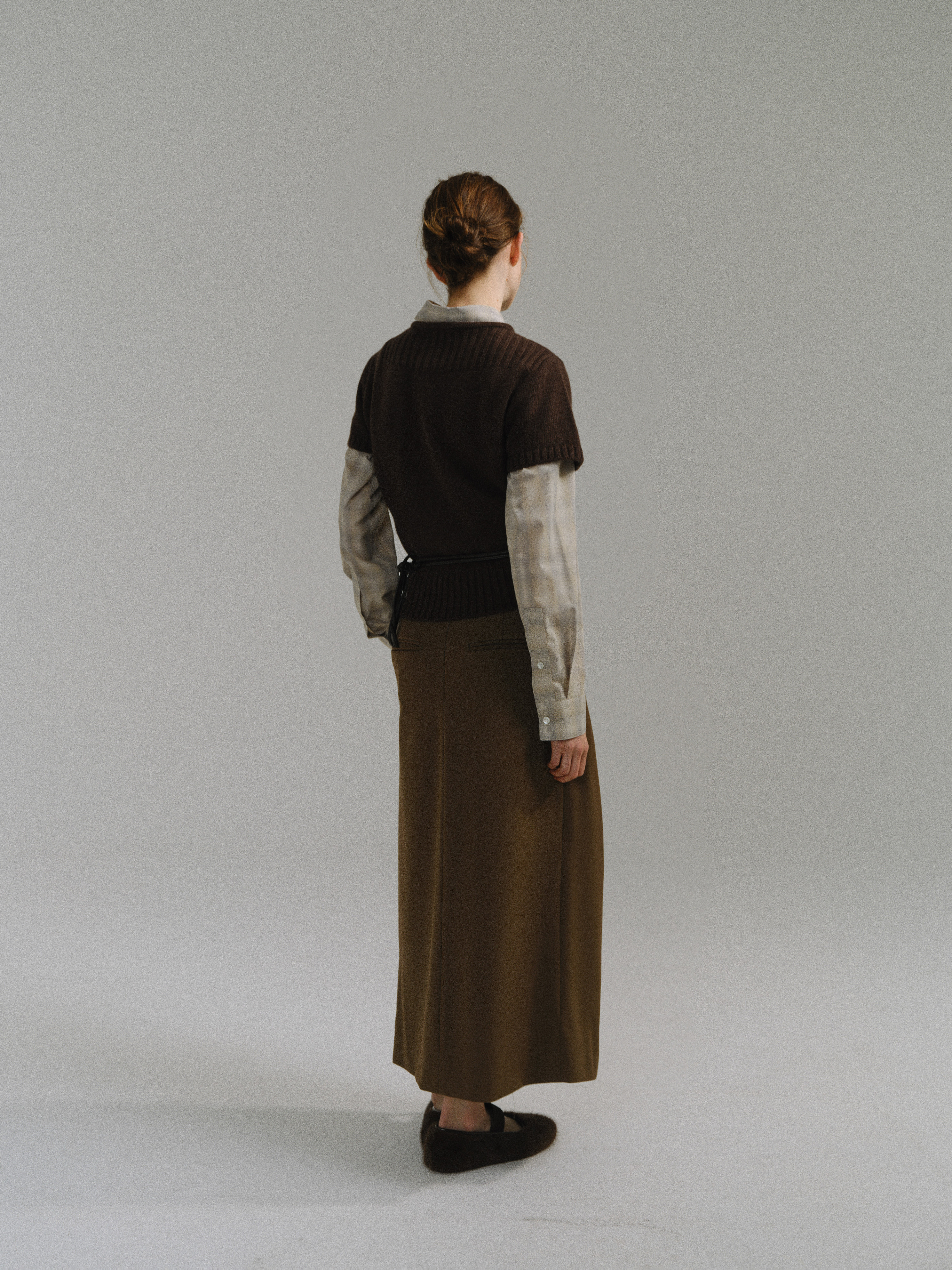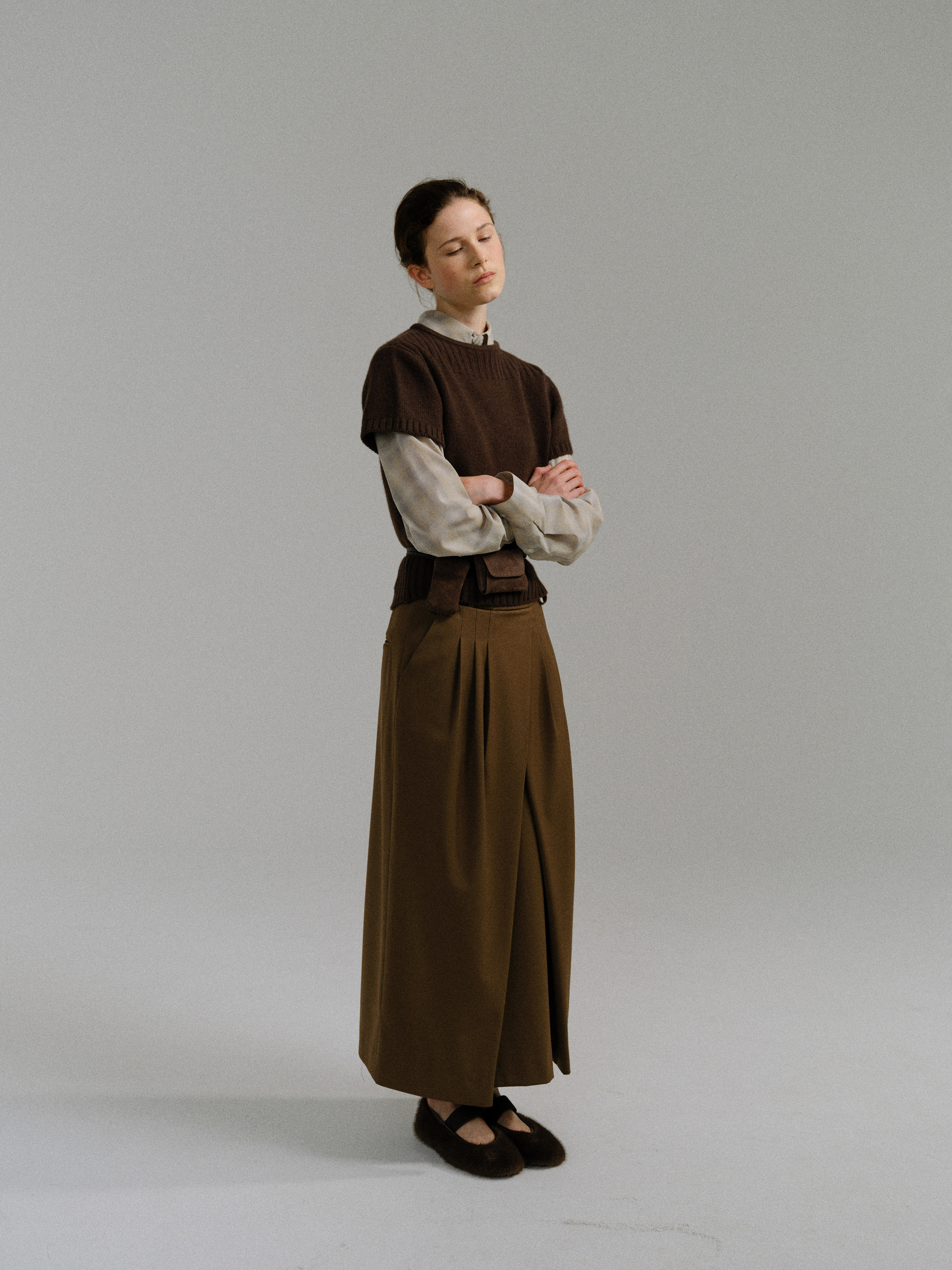 - 사선으로 겹쳐지는 앞판 라인은 조형적인 특징을 강조하며, 움직임에 따라 실루엣이 유연하게 흐릅니다.