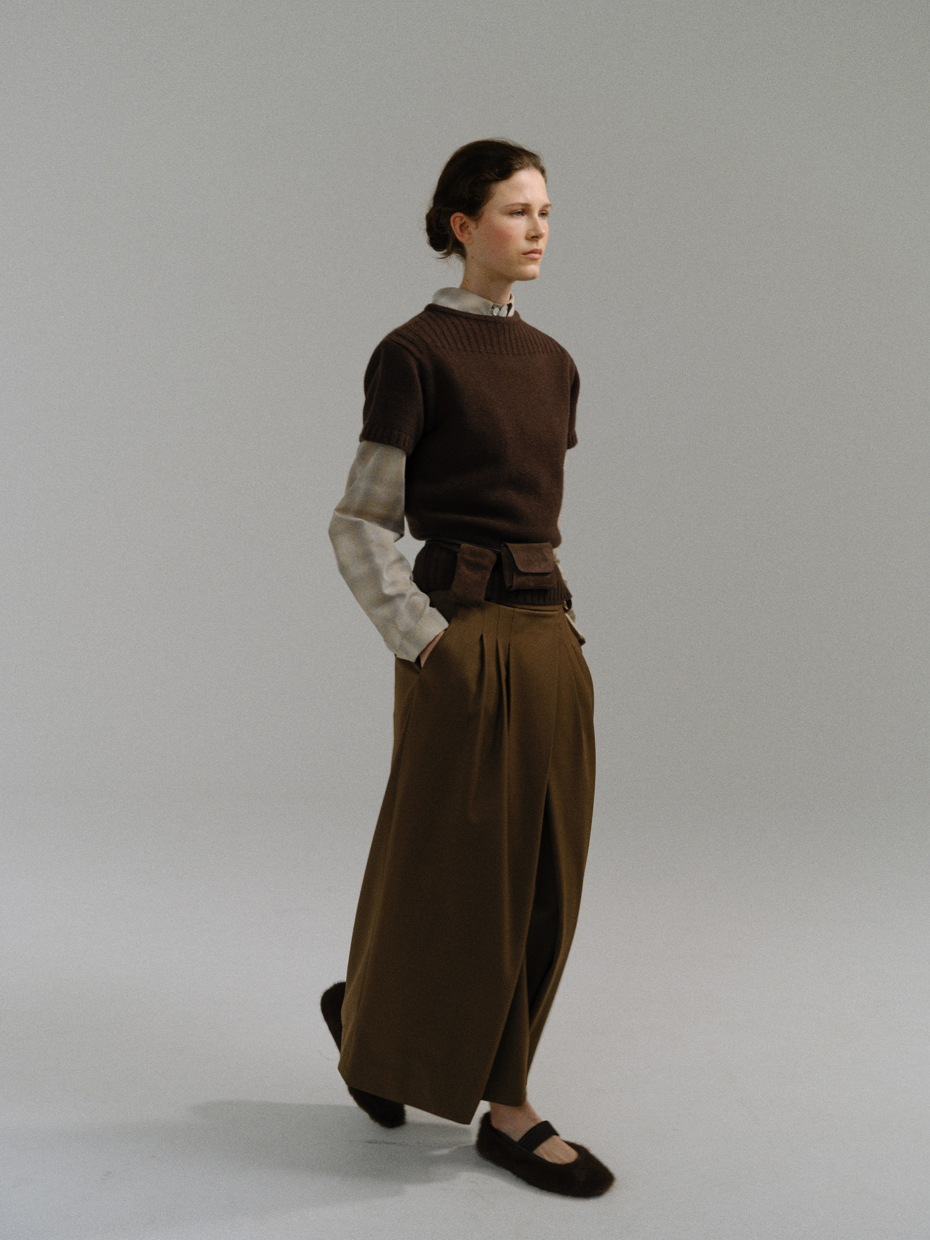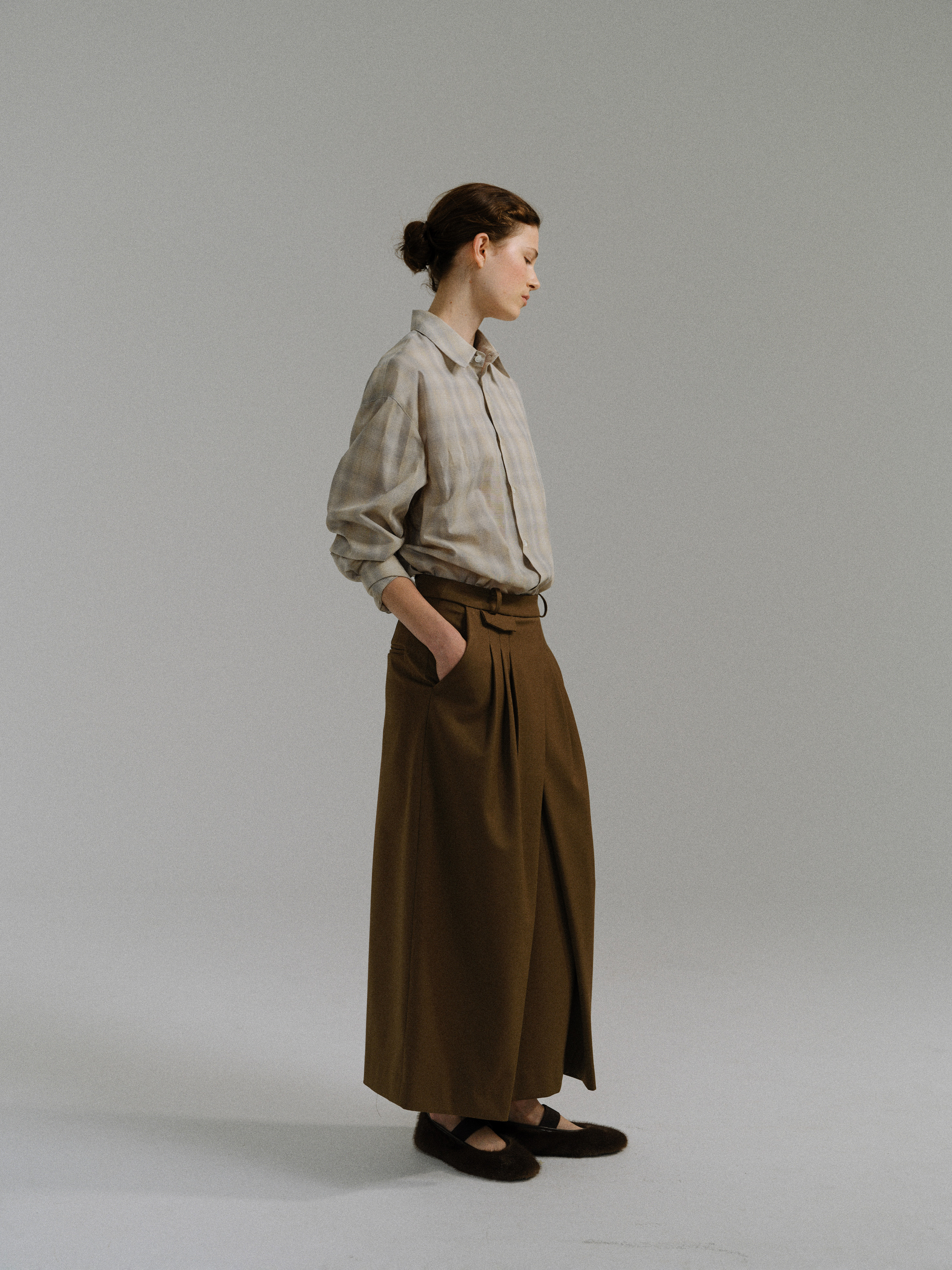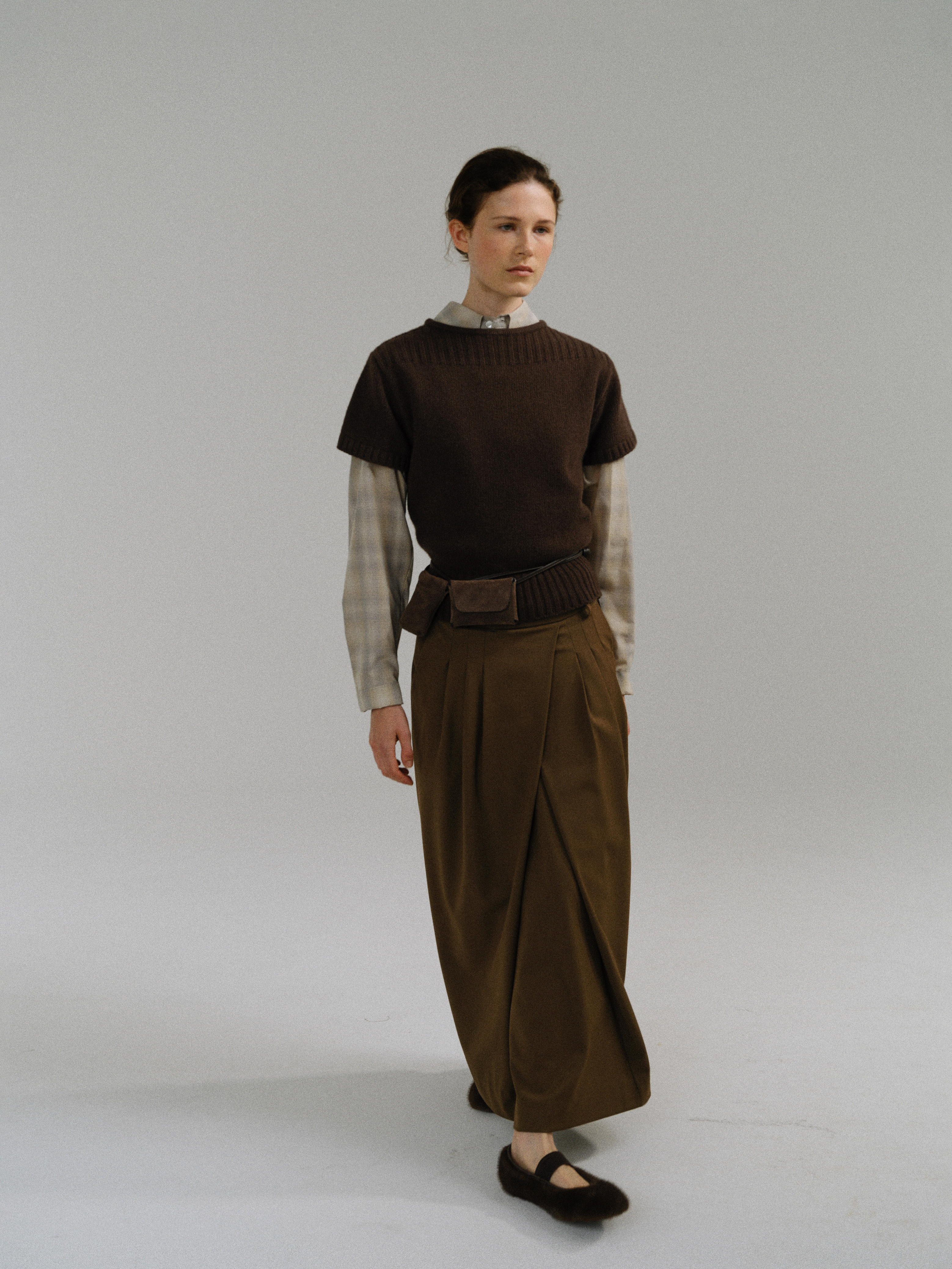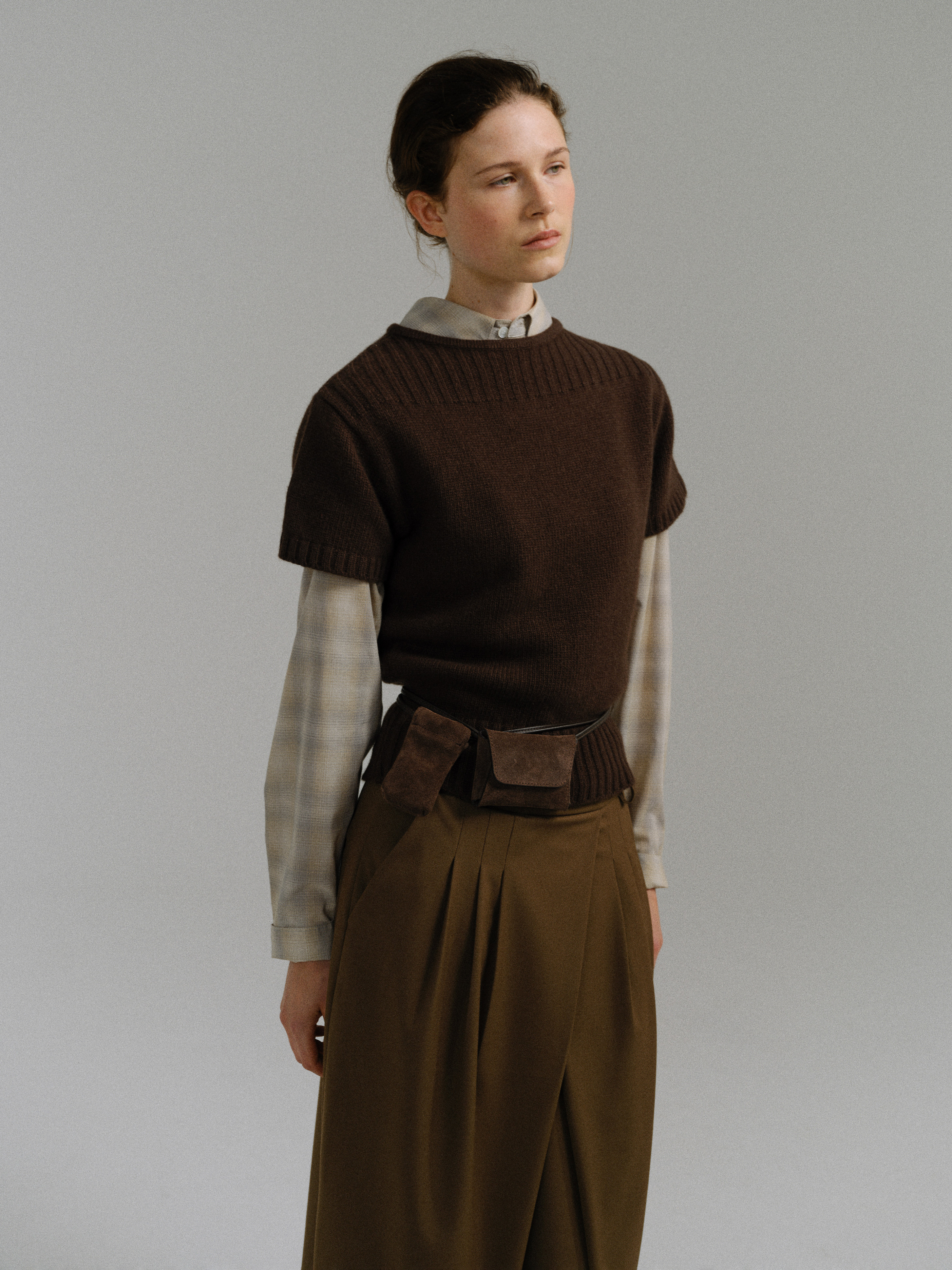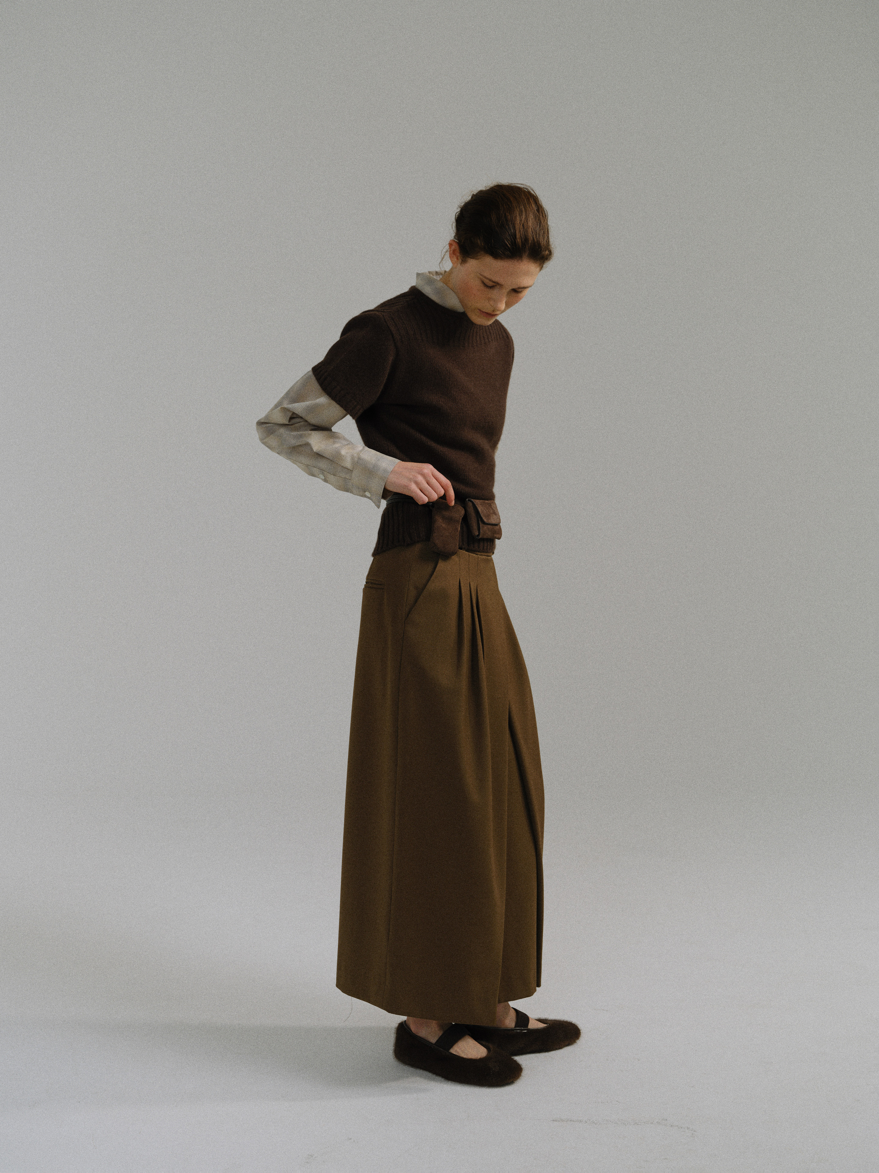 - 사선으로 겹쳐지는 앞판 라인은 조형적인 특징을 강조하며, 움직임에 따라 실루엣이 유연하게 흐릅니다.