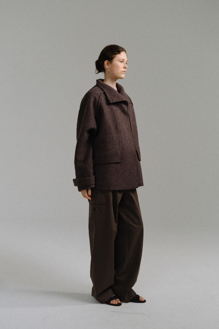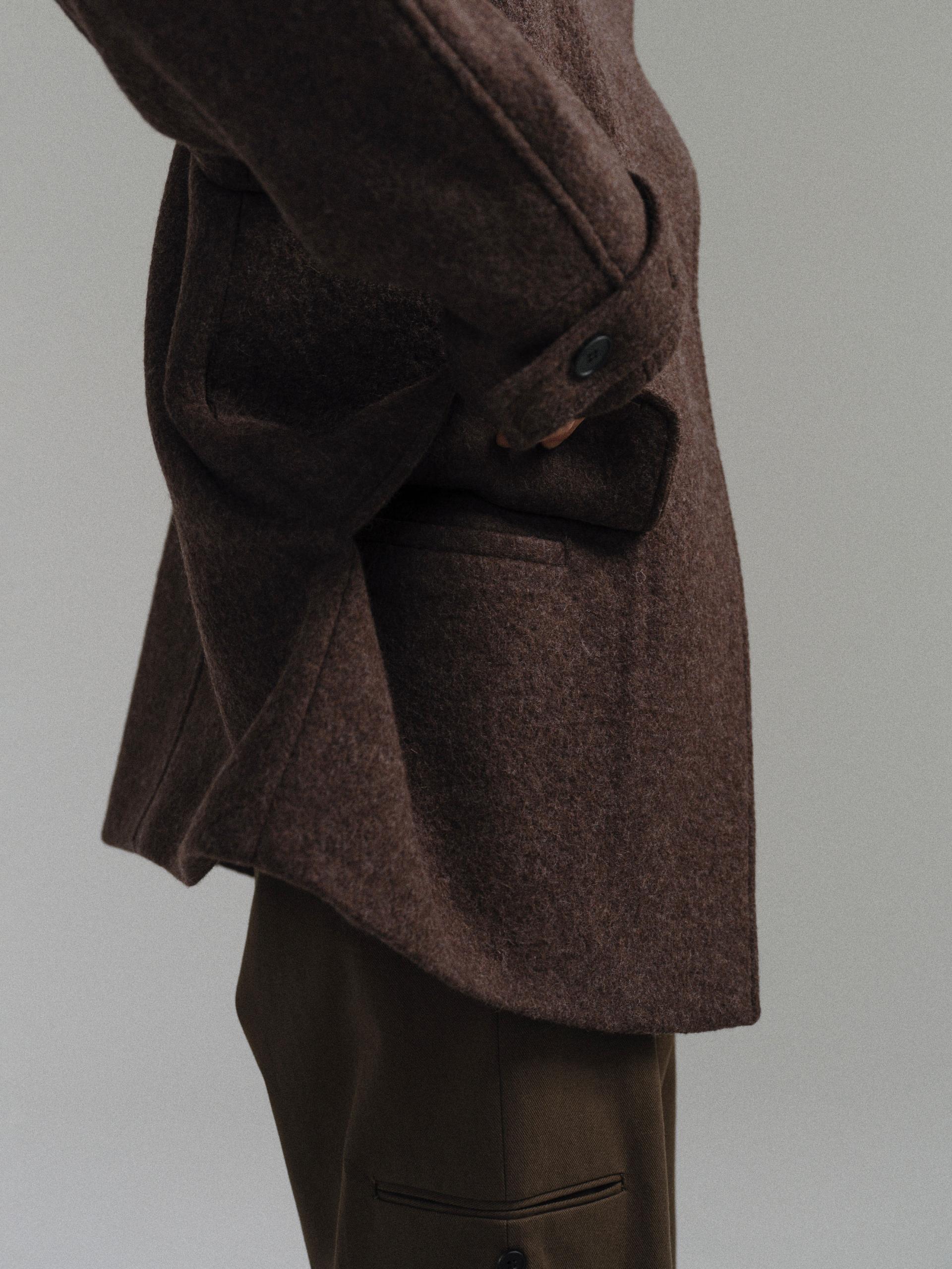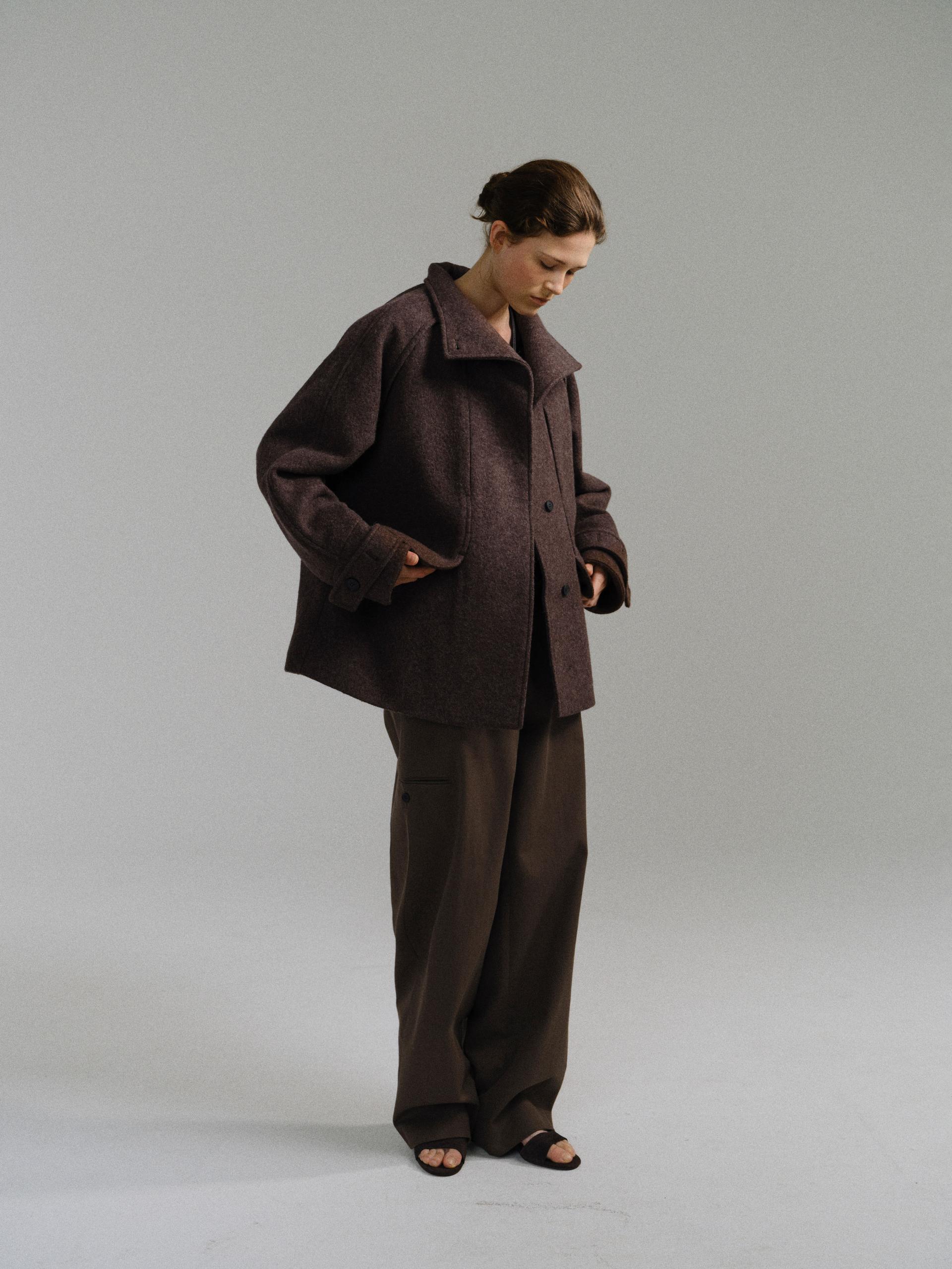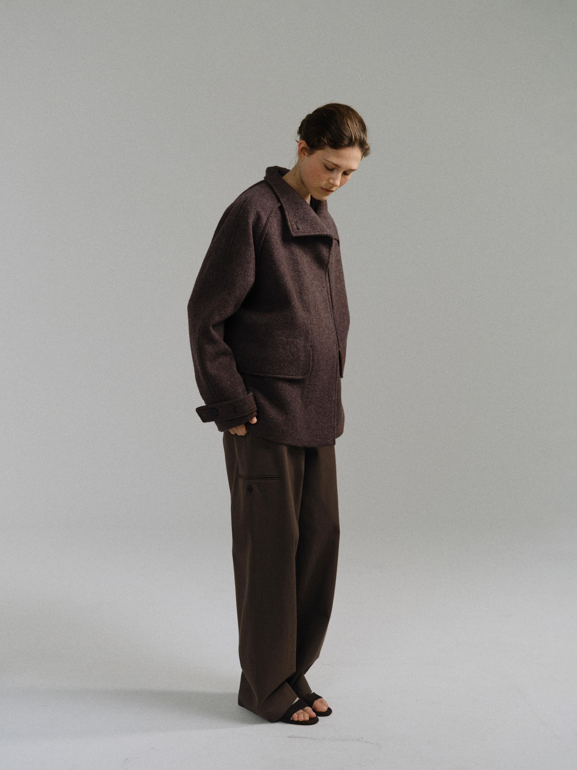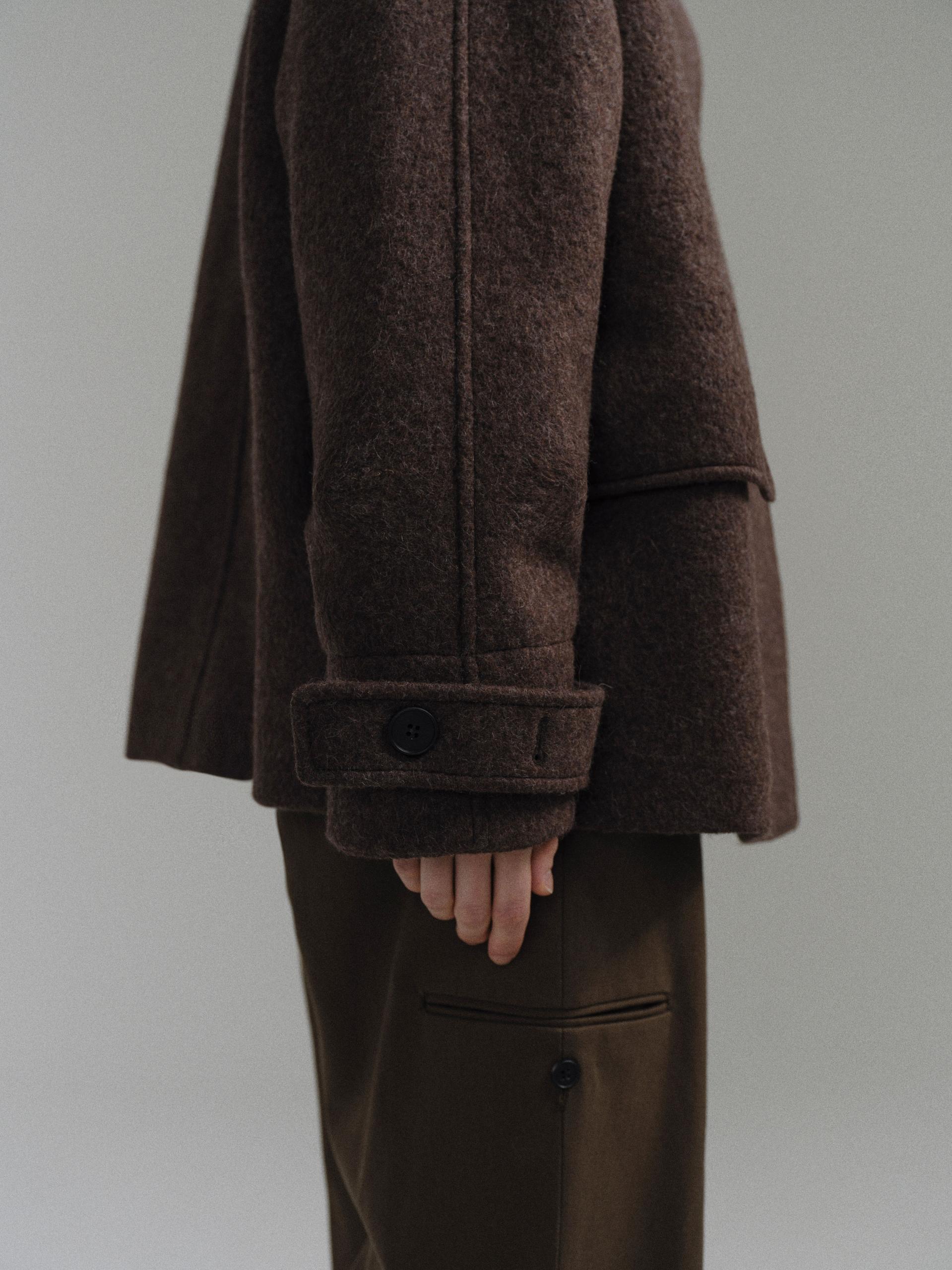 -울 혼방 원단 특유의 헤어리한 텍스처가 돋보이며, 차분하게 톤 다운된 컬러가 특징입니다.