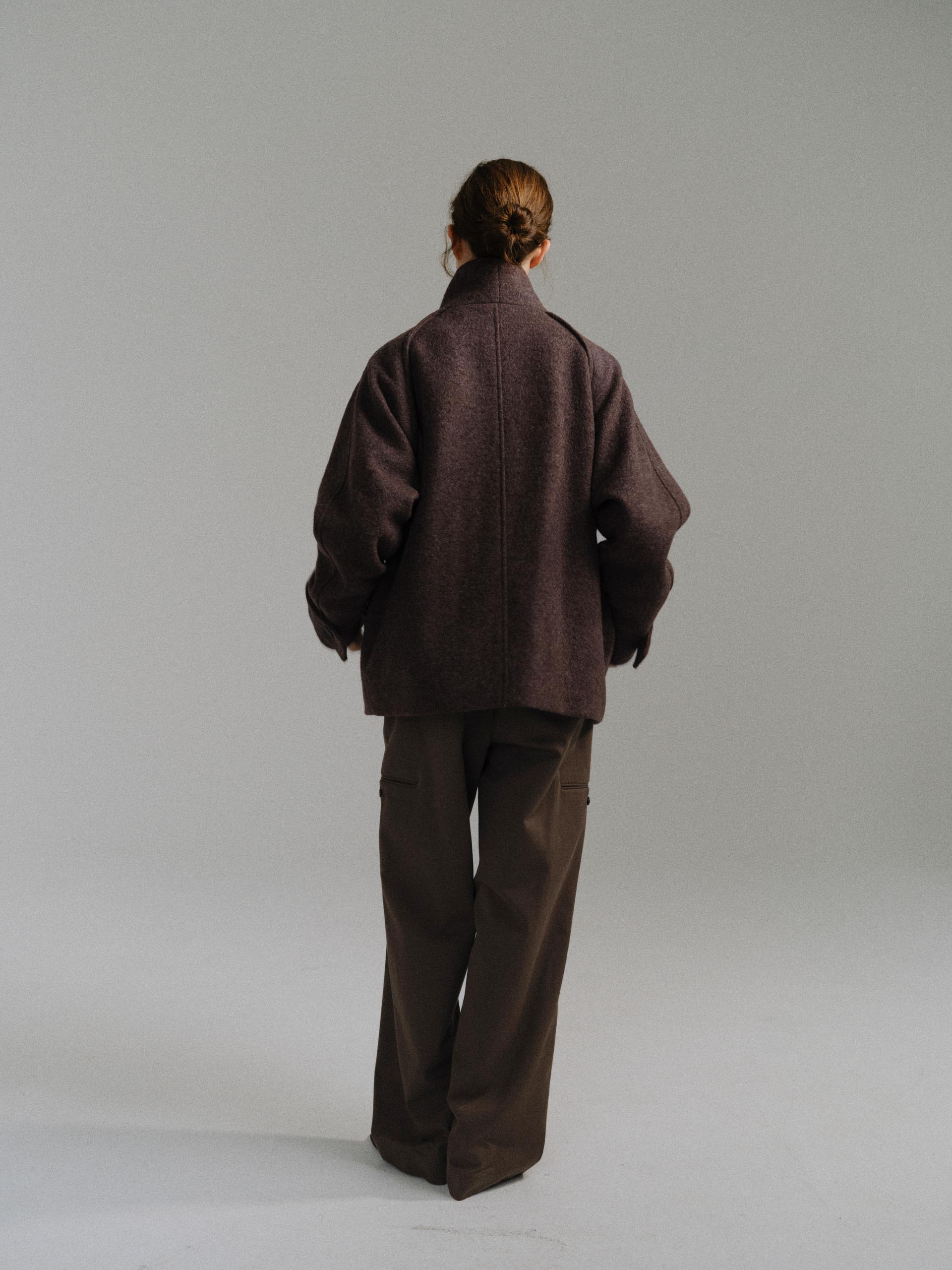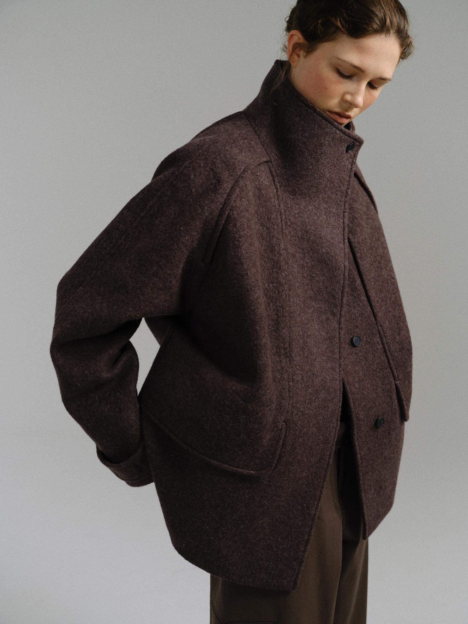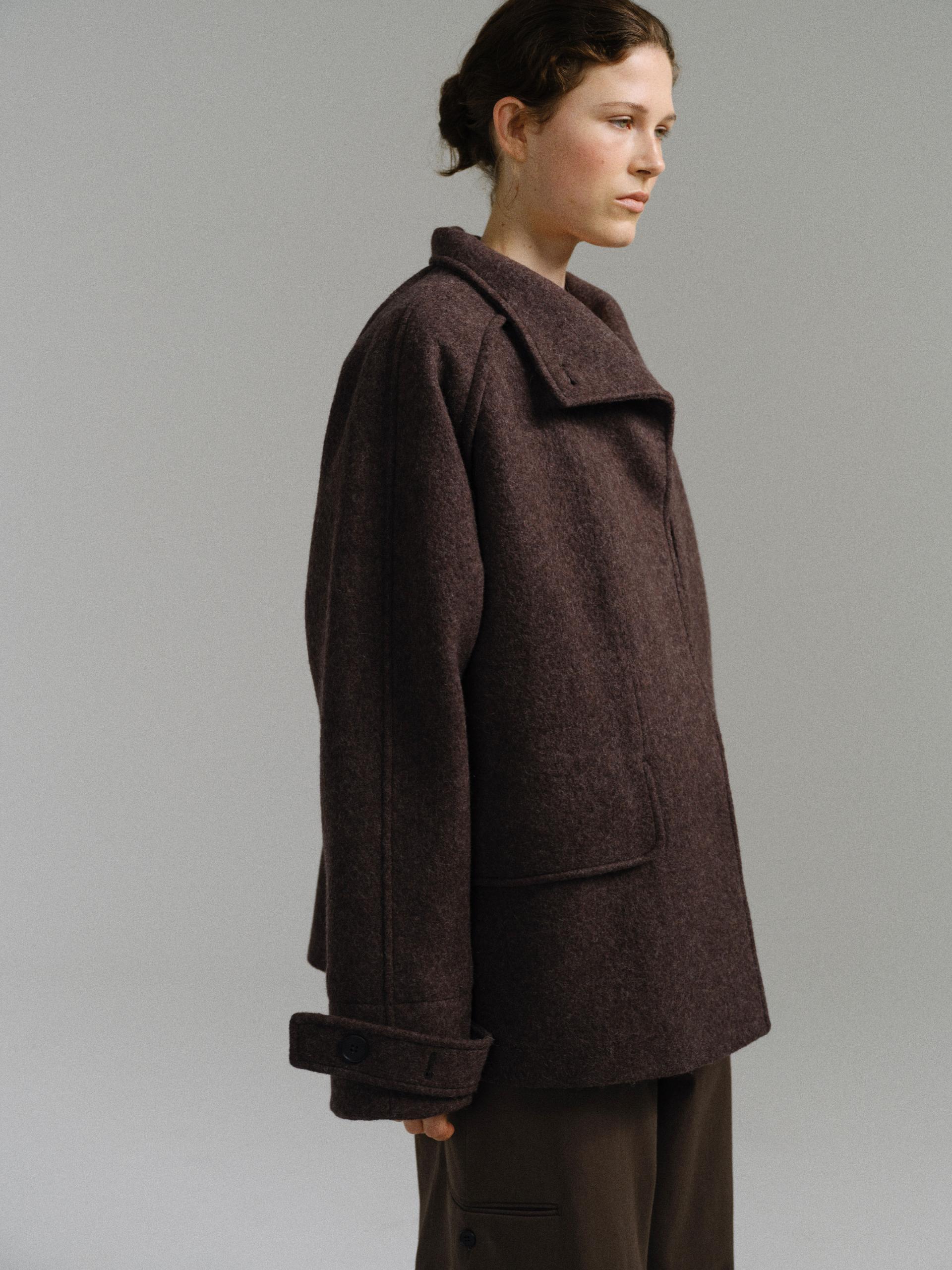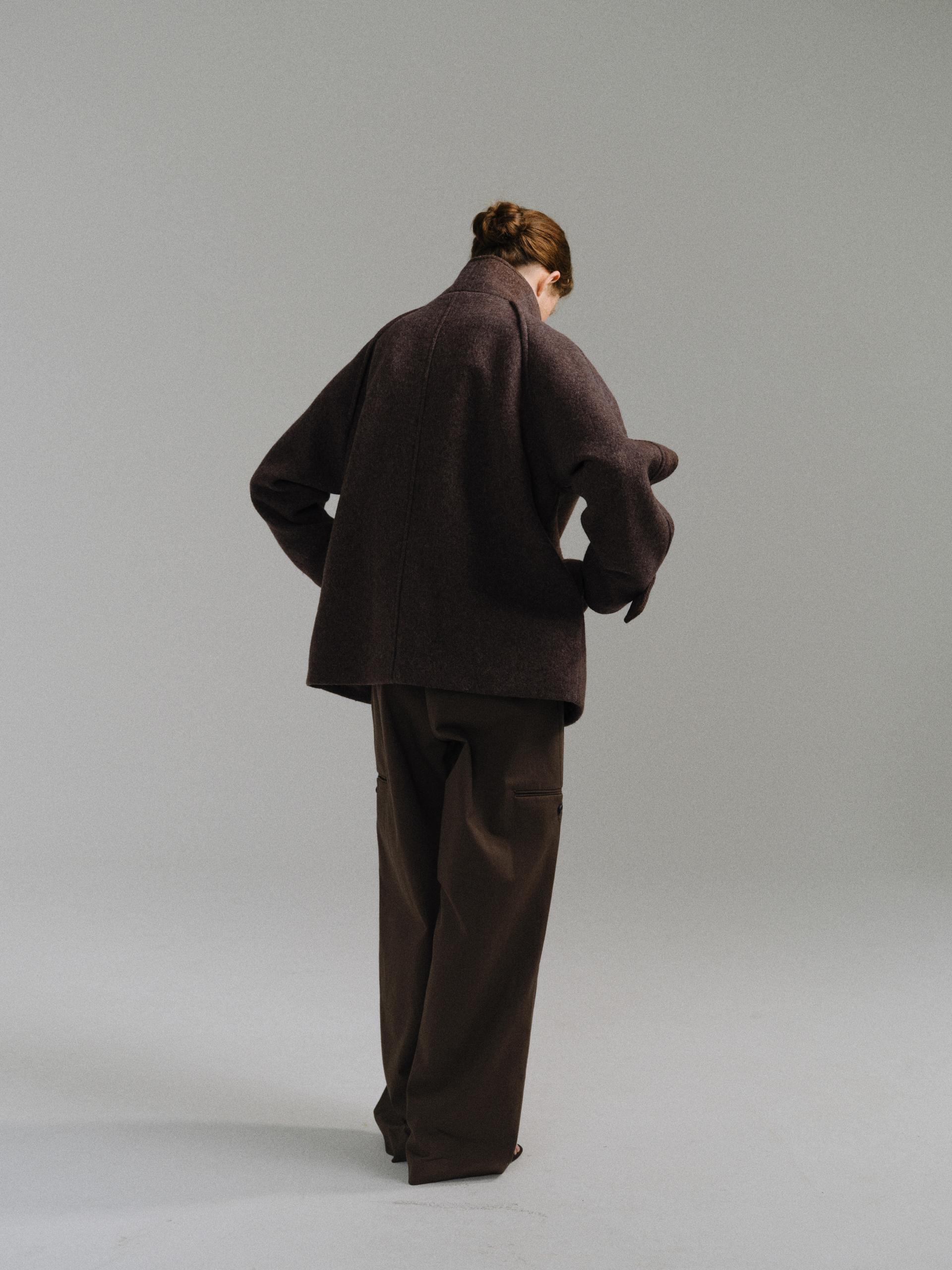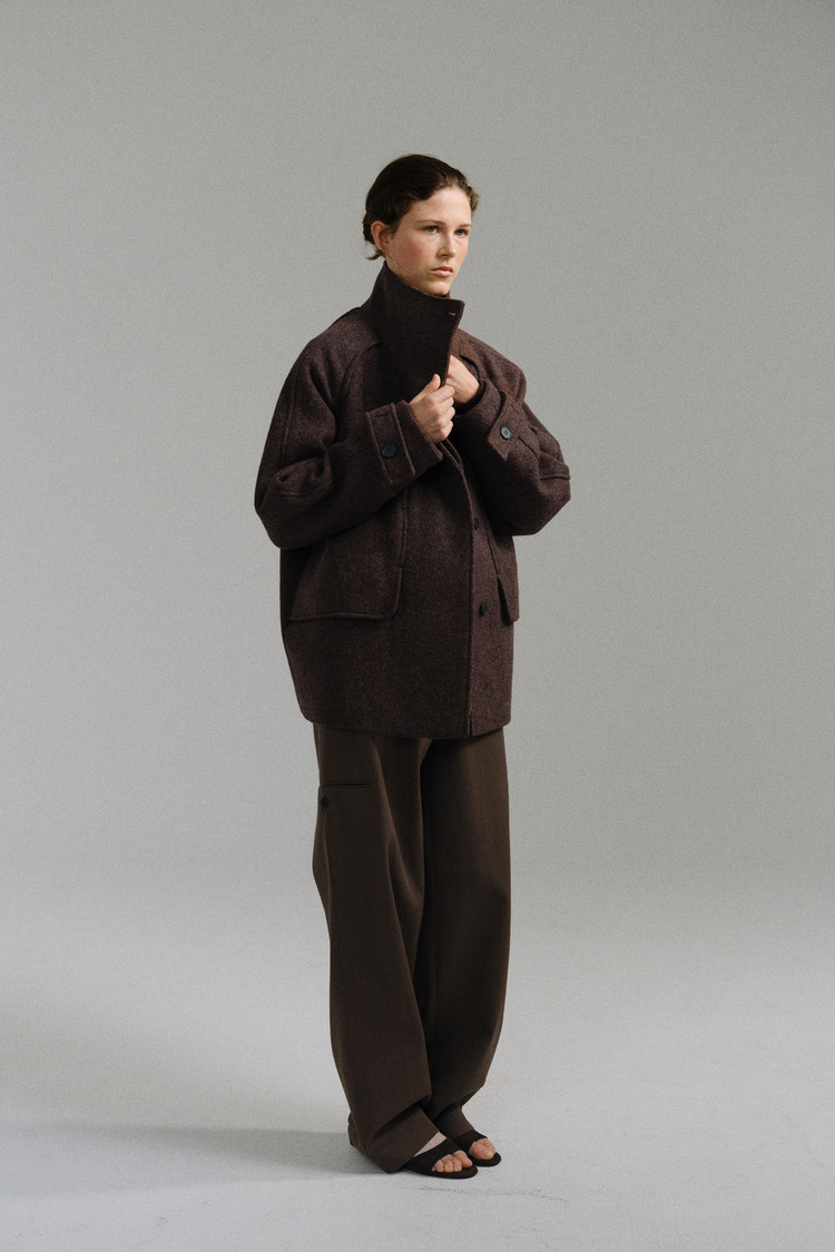 -울 혼방 원단 특유의 헤어리한 텍스처가 돋보이며, 차분하게 톤 다운된 컬러가 특징입니다.