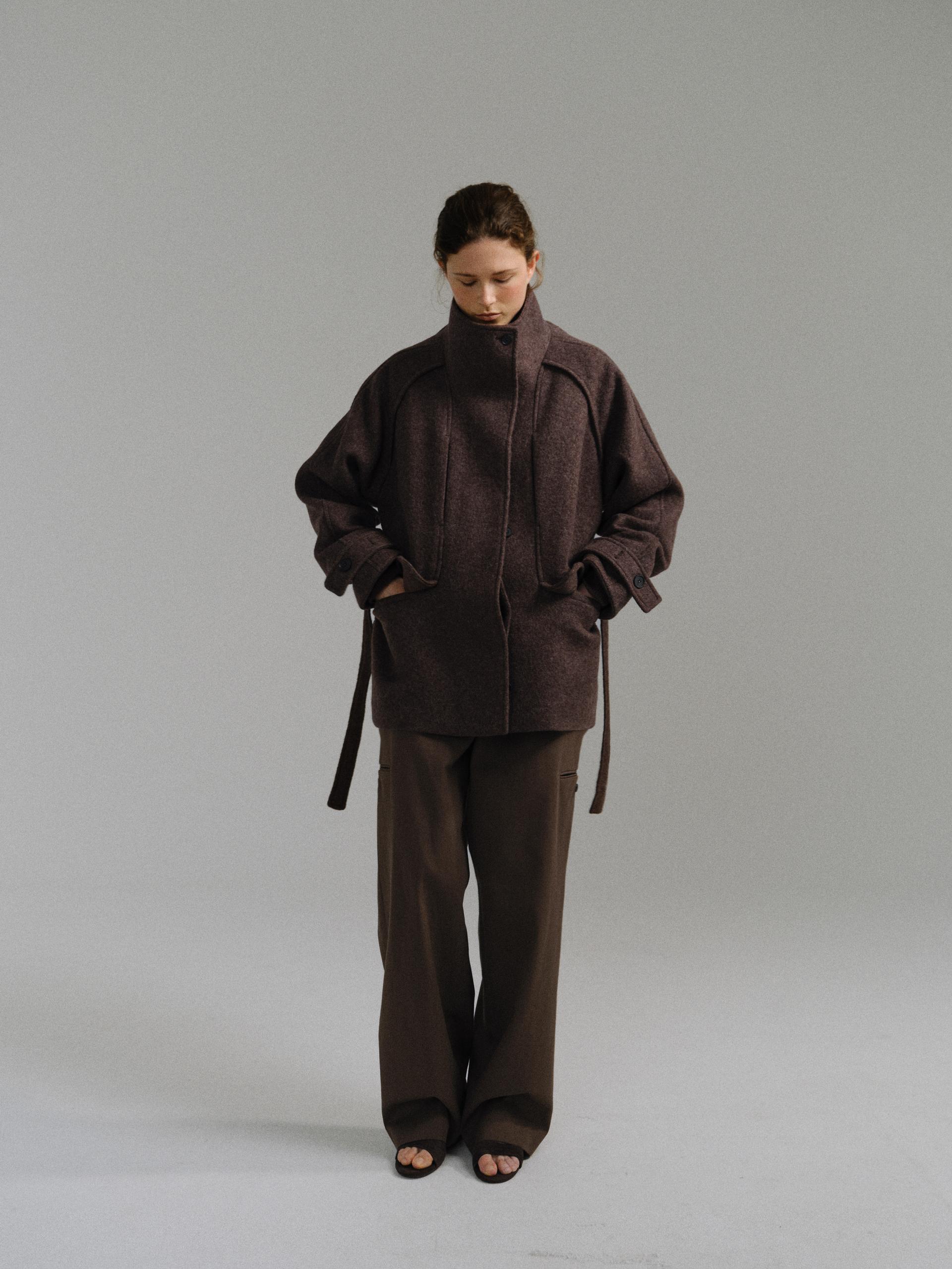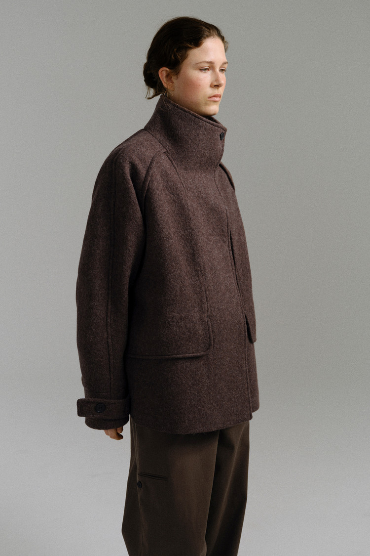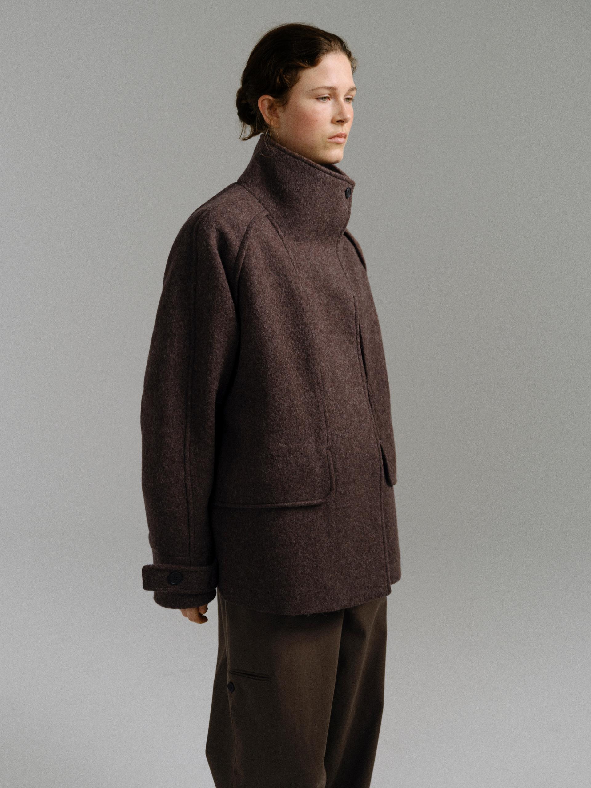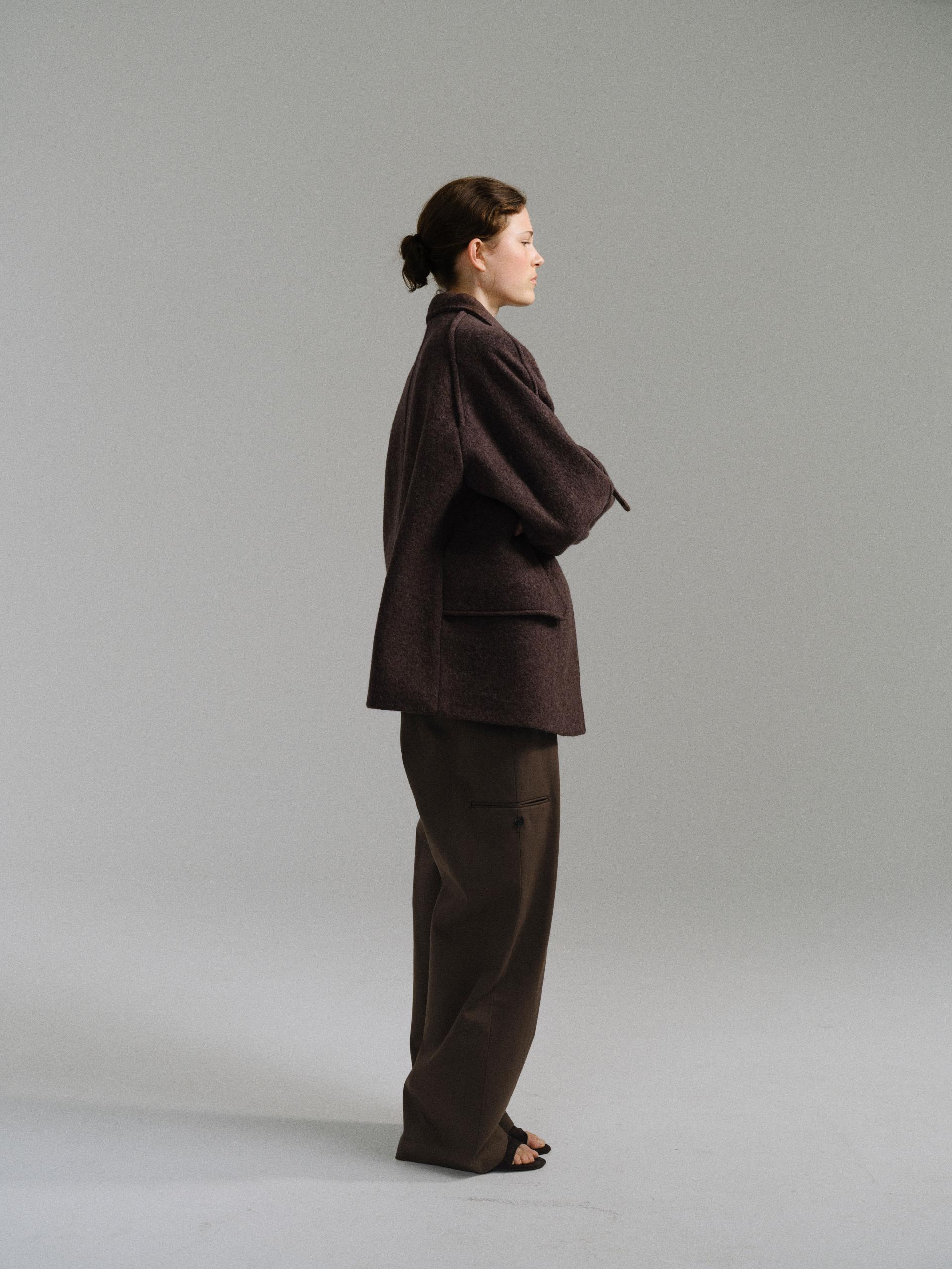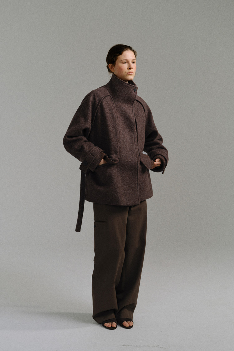 -울 혼방 원단 특유의 헤어리한 텍스처가 돋보이며, 차분하게 톤 다운된 컬러가 특징입니다.