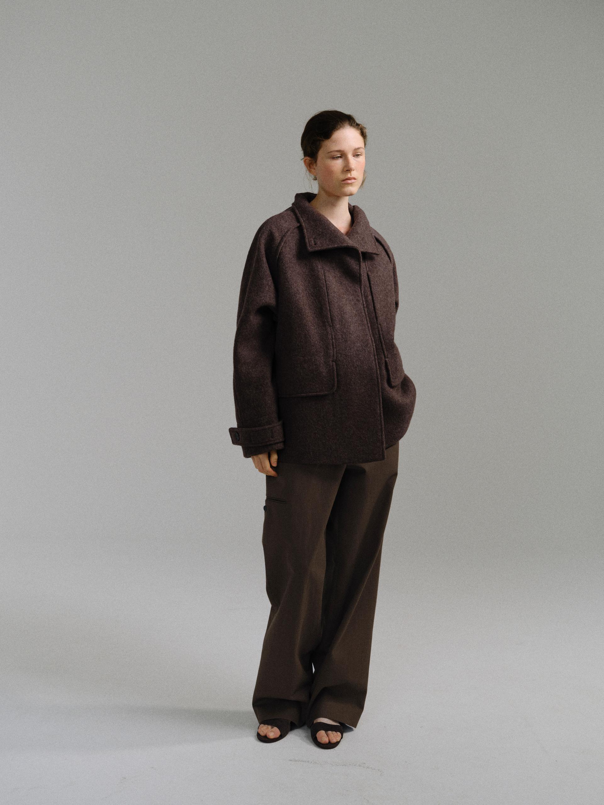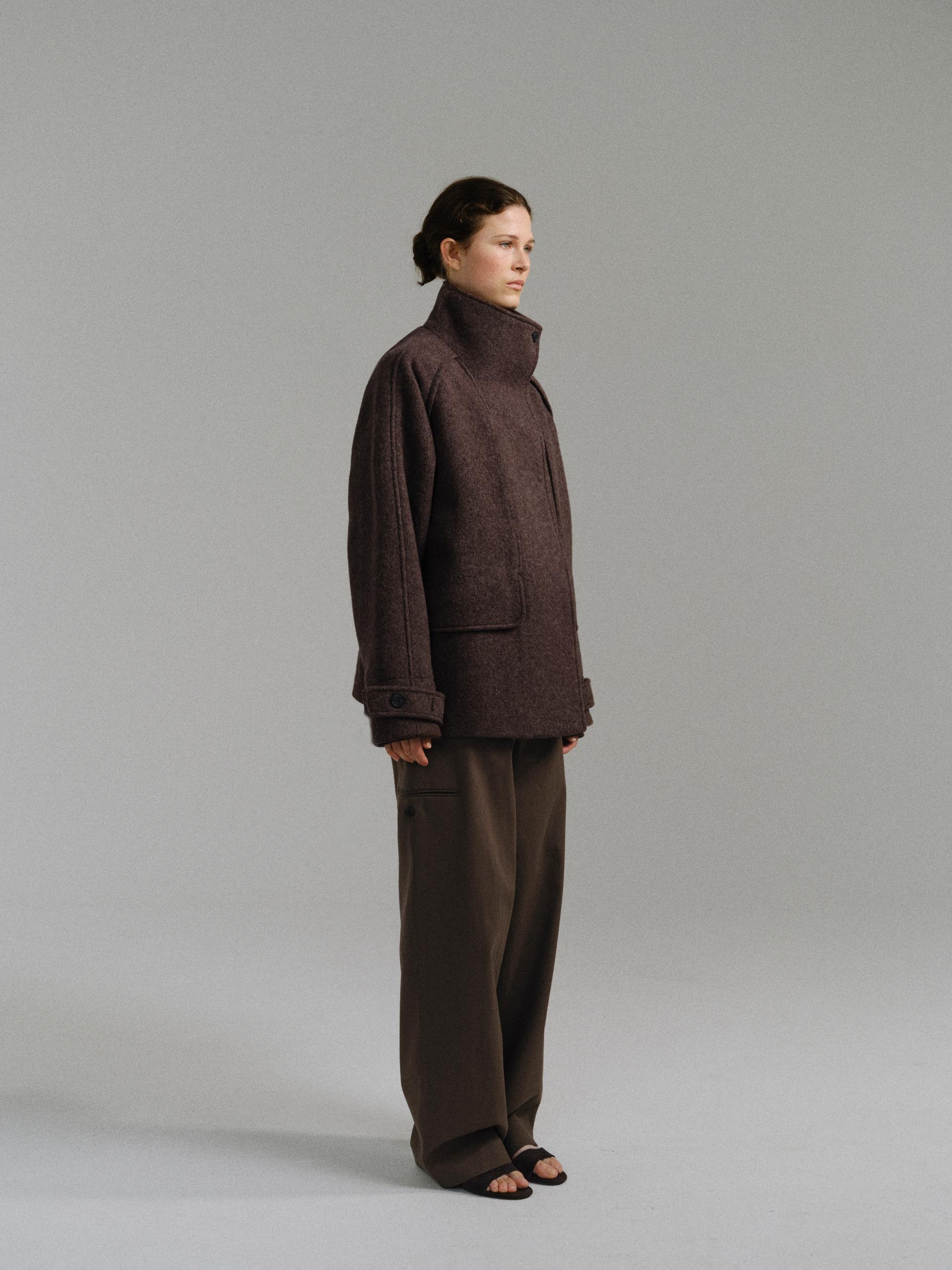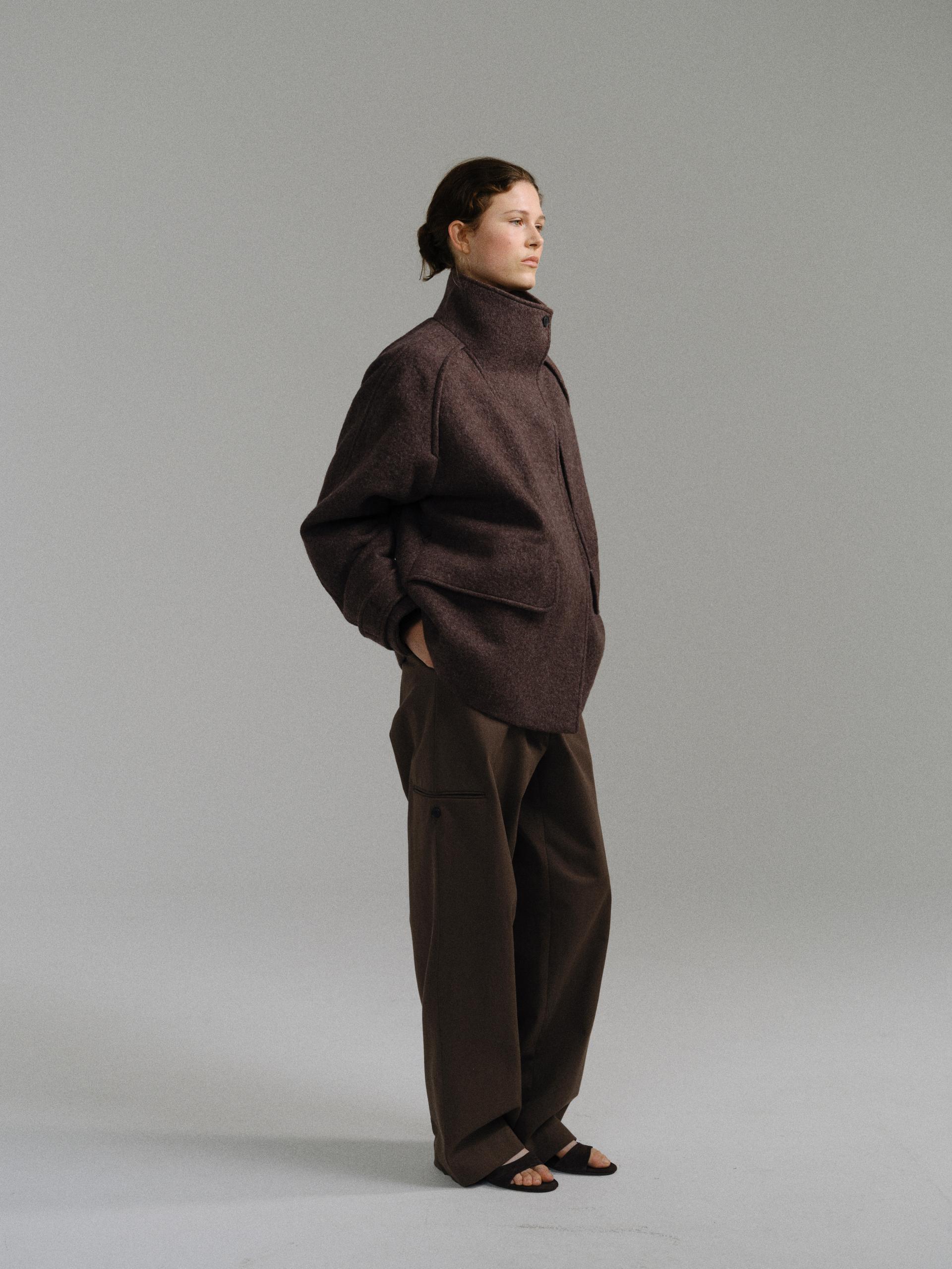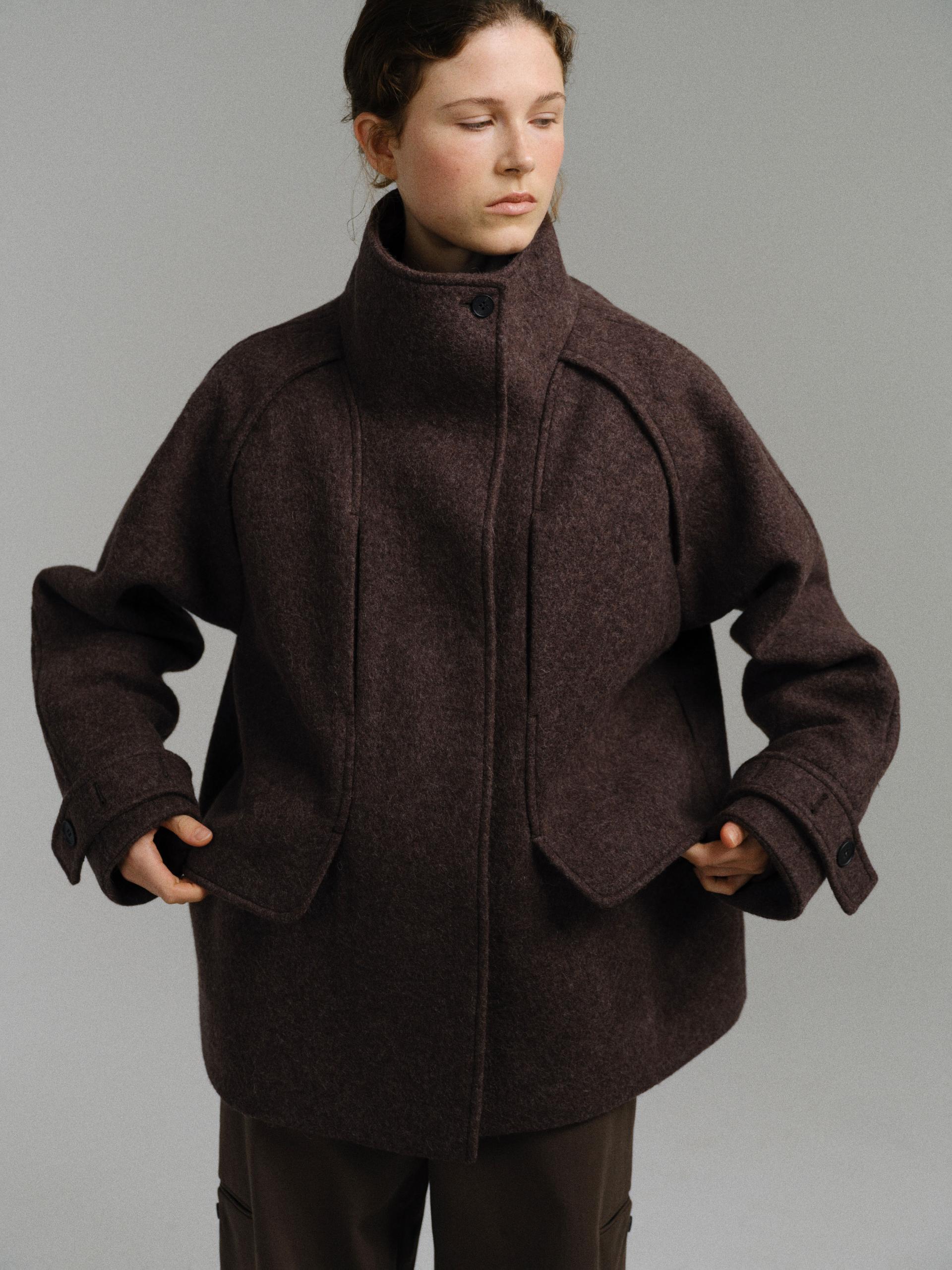 -울 혼방 원단 특유의 헤어리한 텍스처가 돋보이며, 차분하게 톤 다운된 컬러가 특징입니다.
