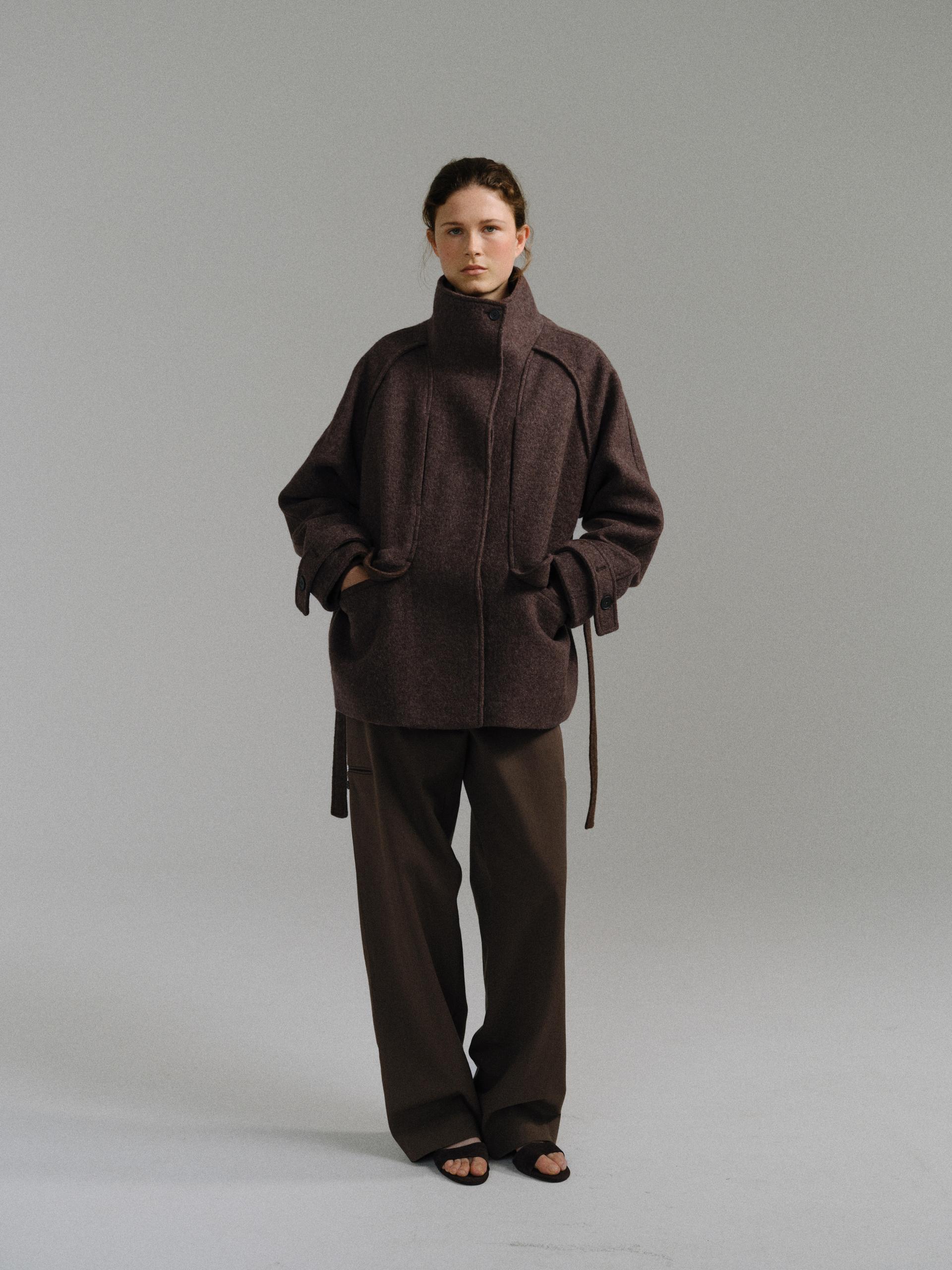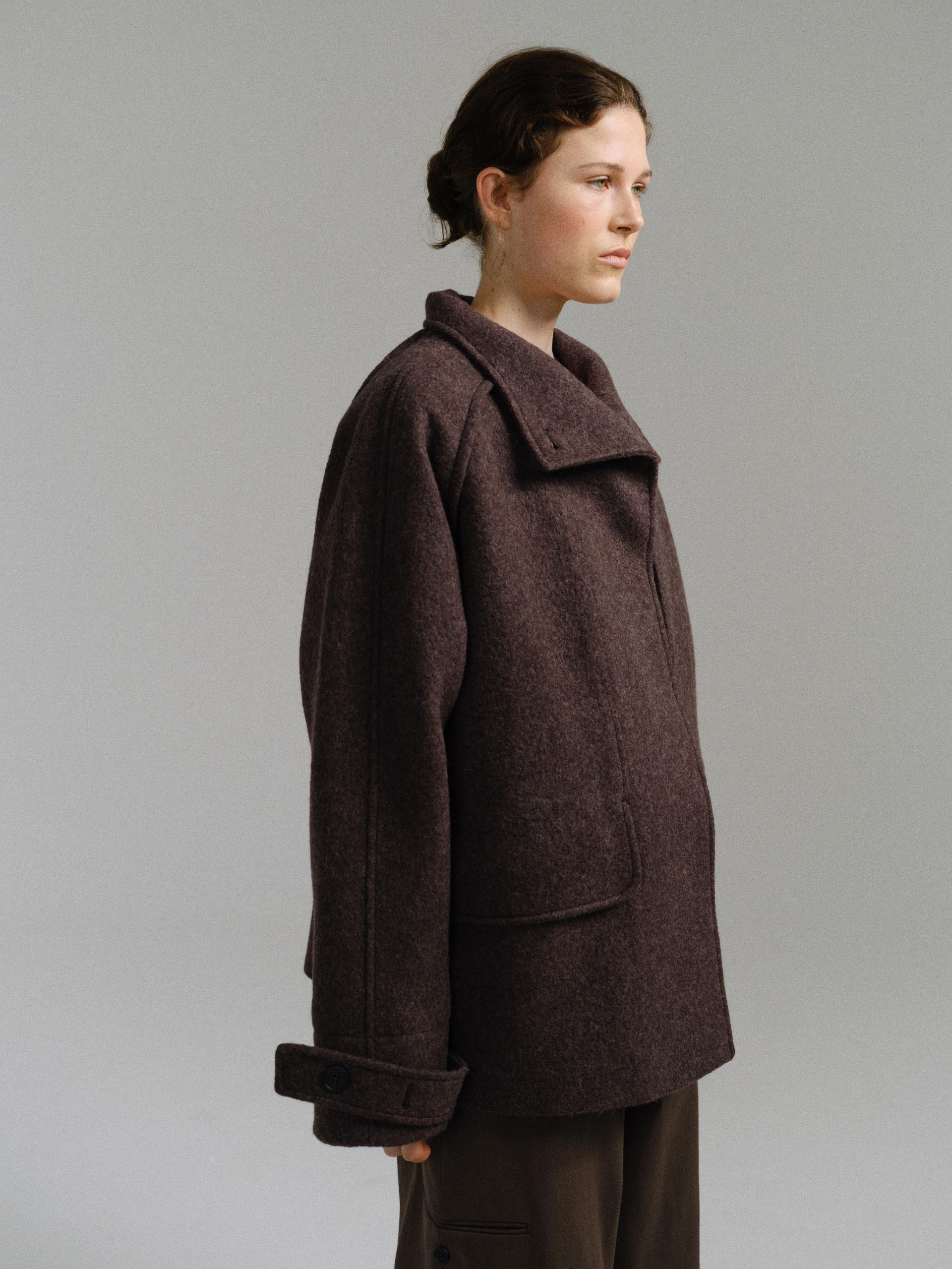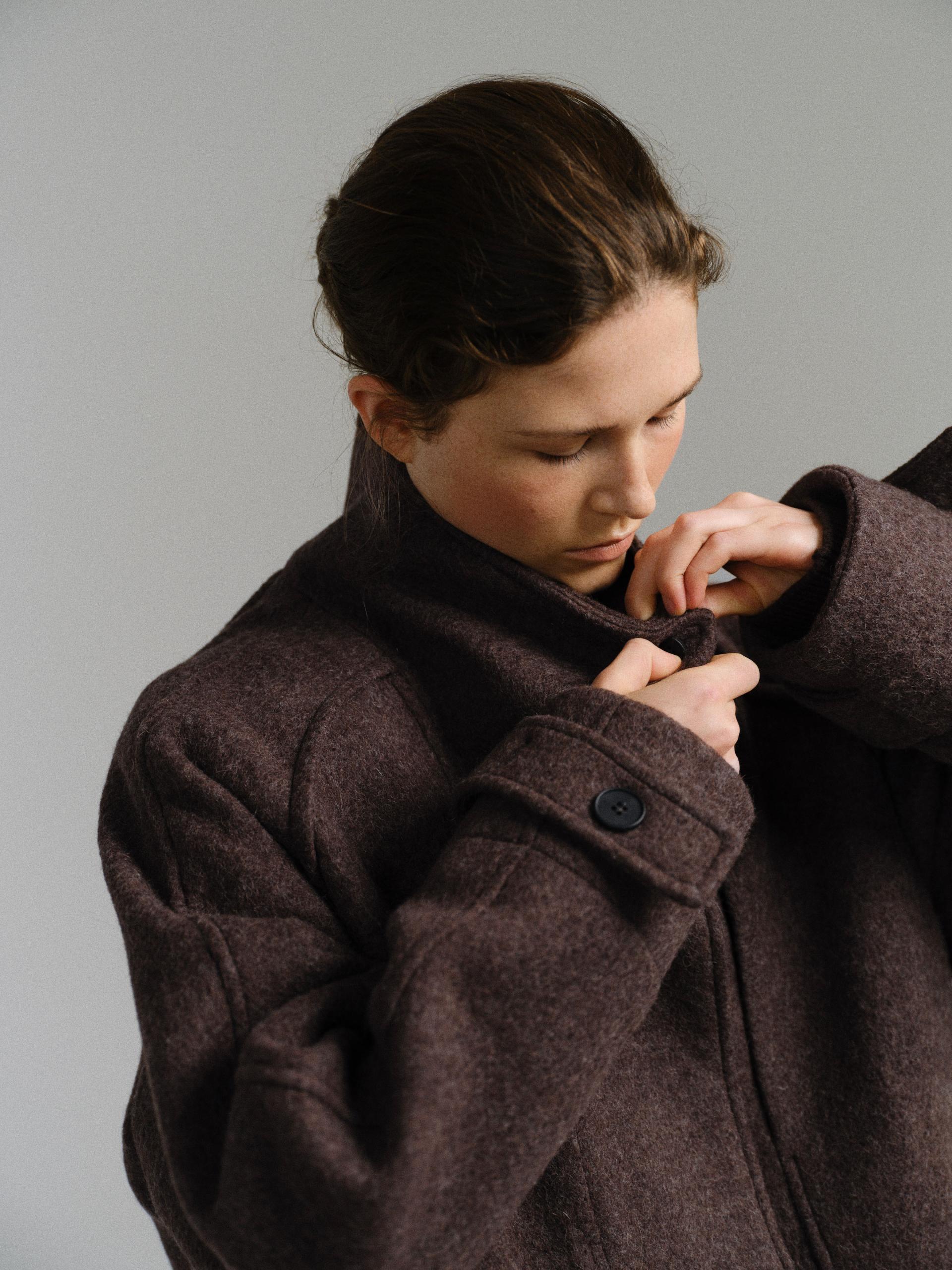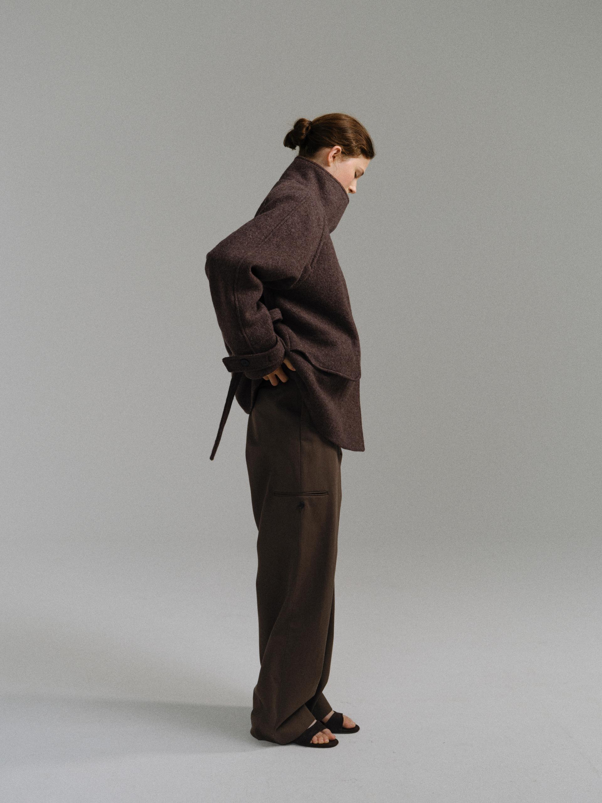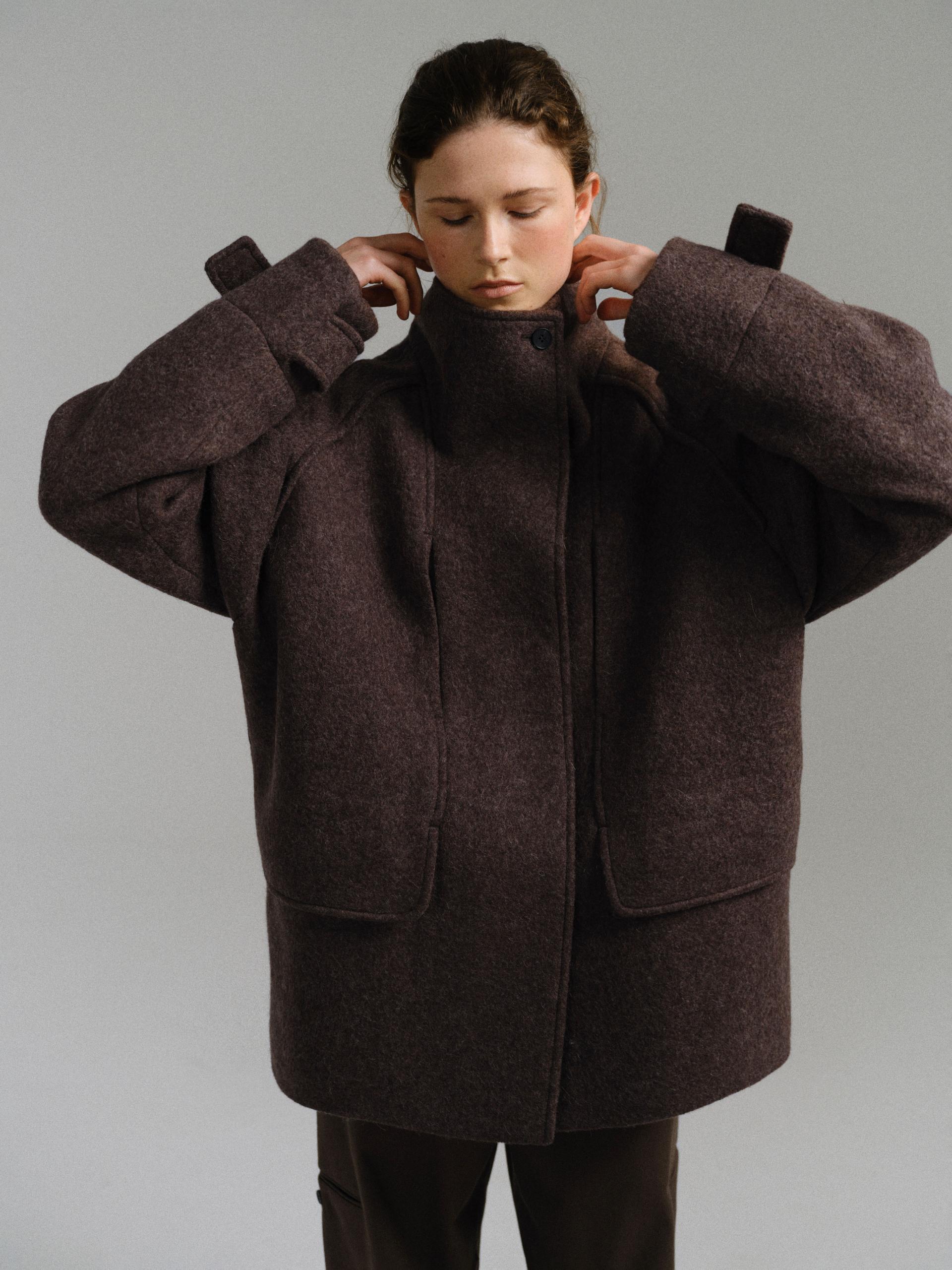 -울 혼방 원단 특유의 헤어리한 텍스처가 돋보이며, 차분하게 톤 다운된 컬러가 특징입니다.