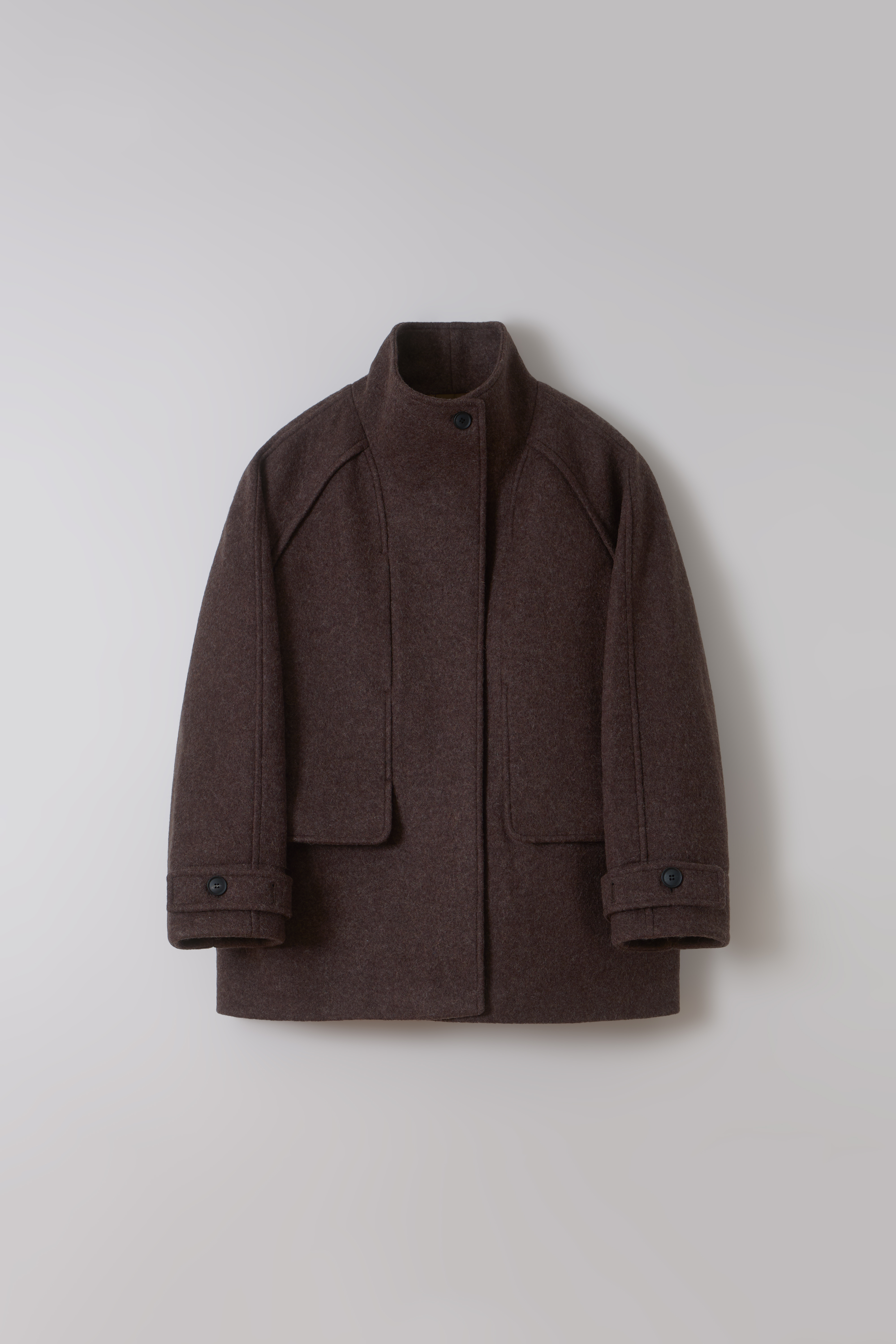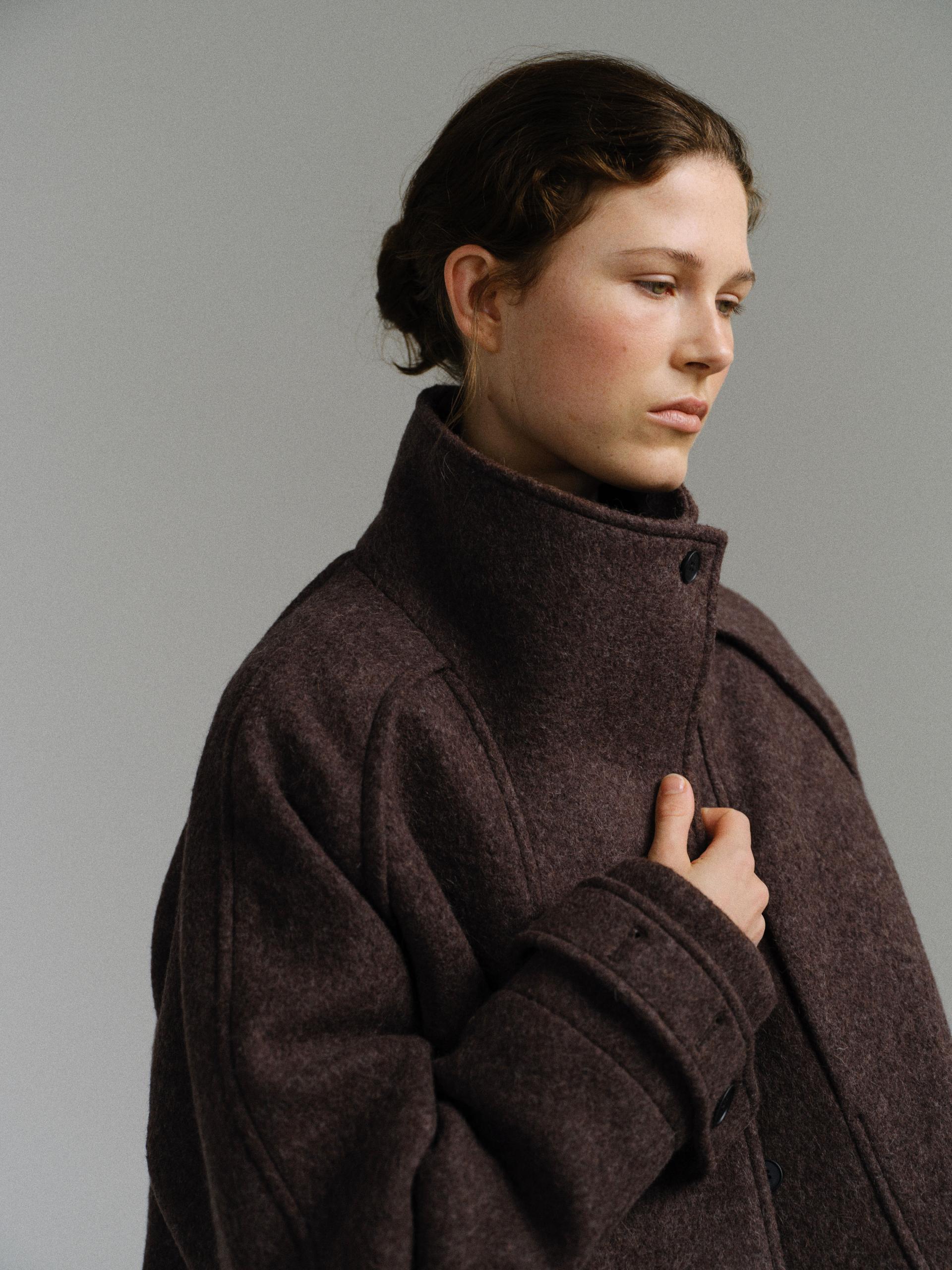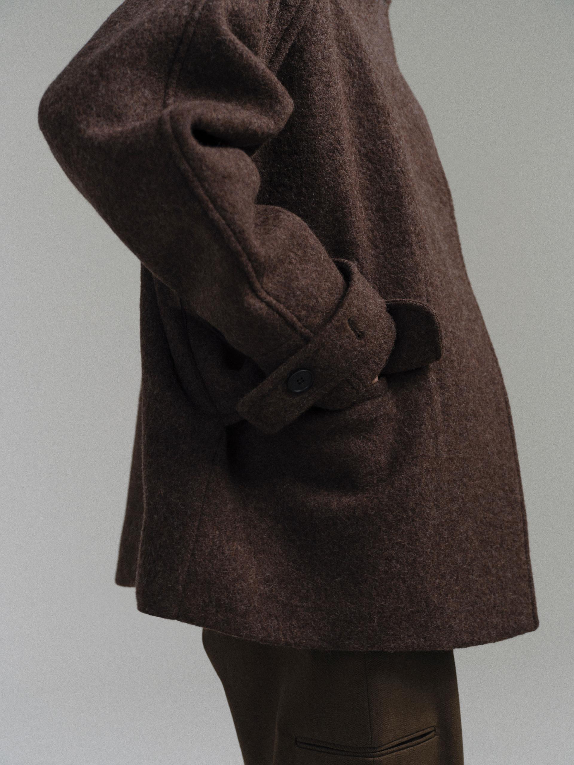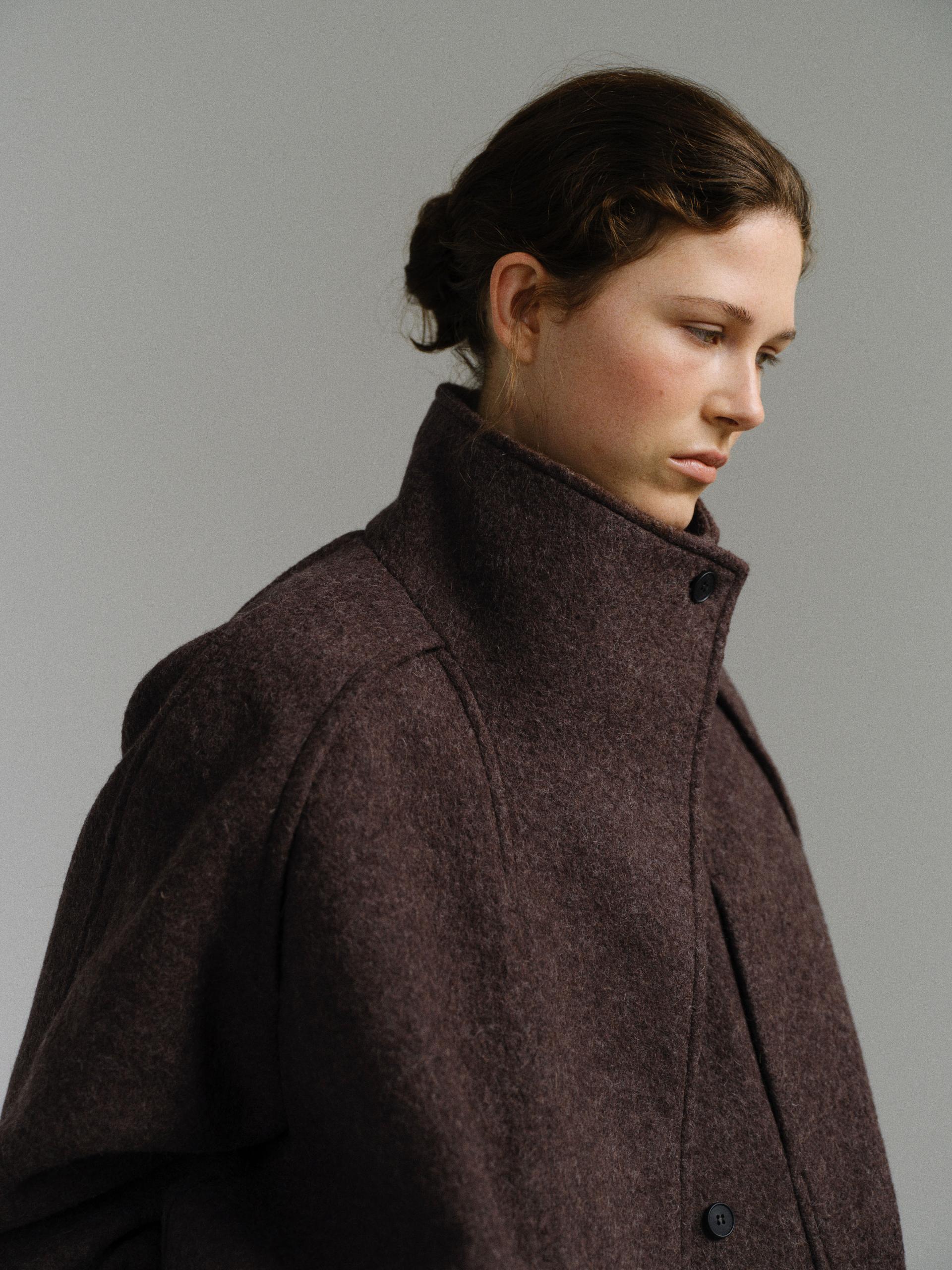 -울 혼방 원단 특유의 헤어리한 텍스처가 돋보이며, 차분하게 톤 다운된 컬러가 특징입니다.
