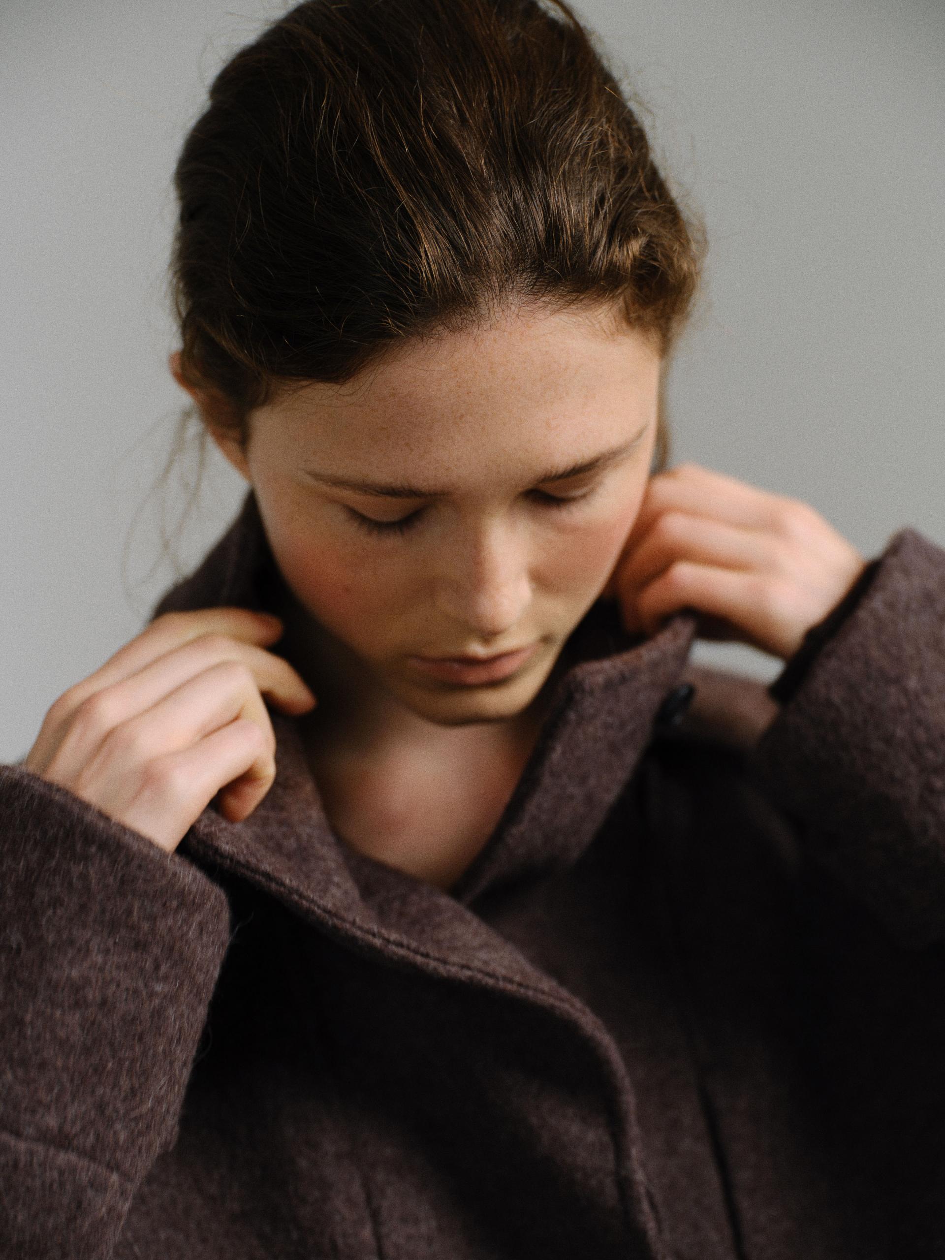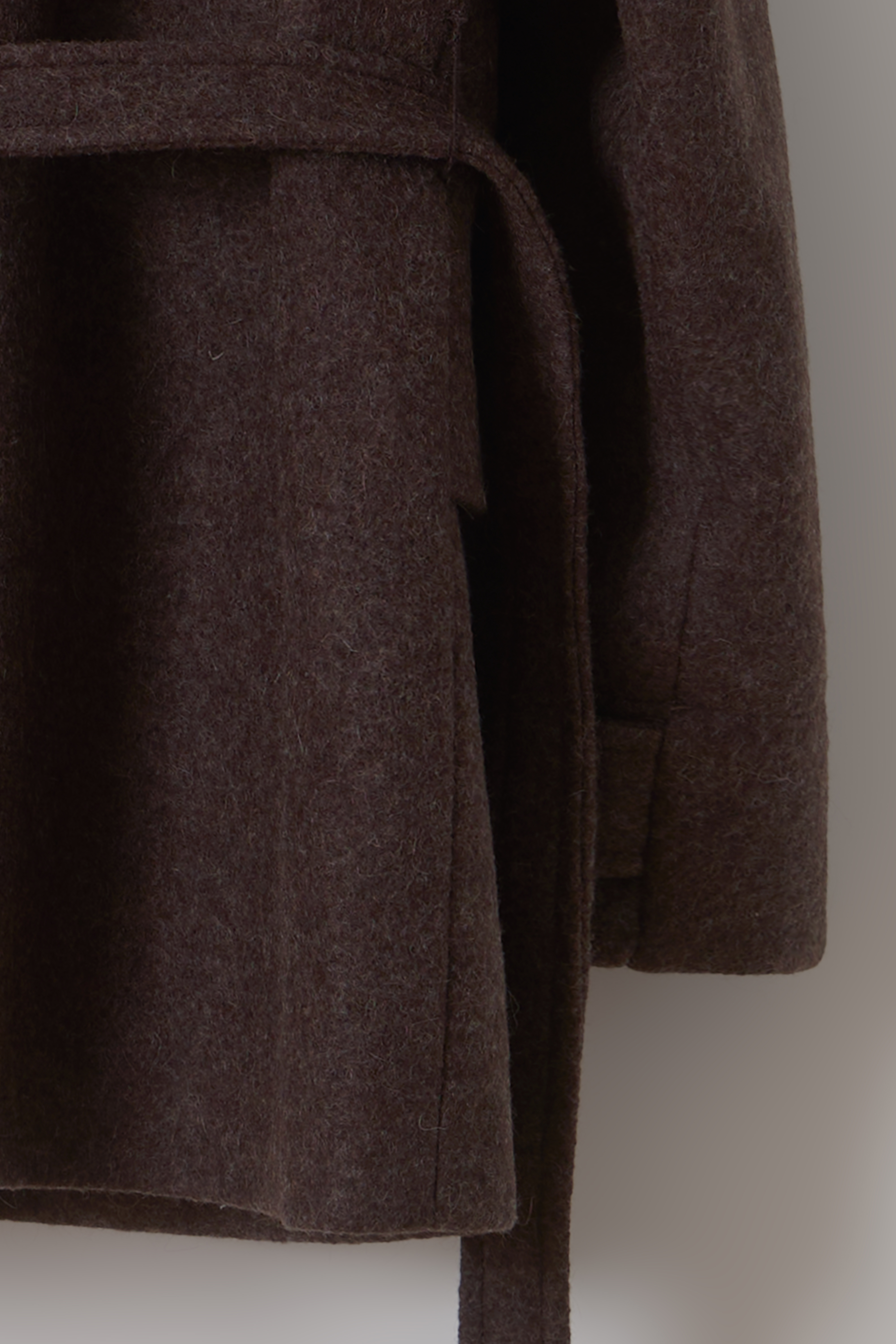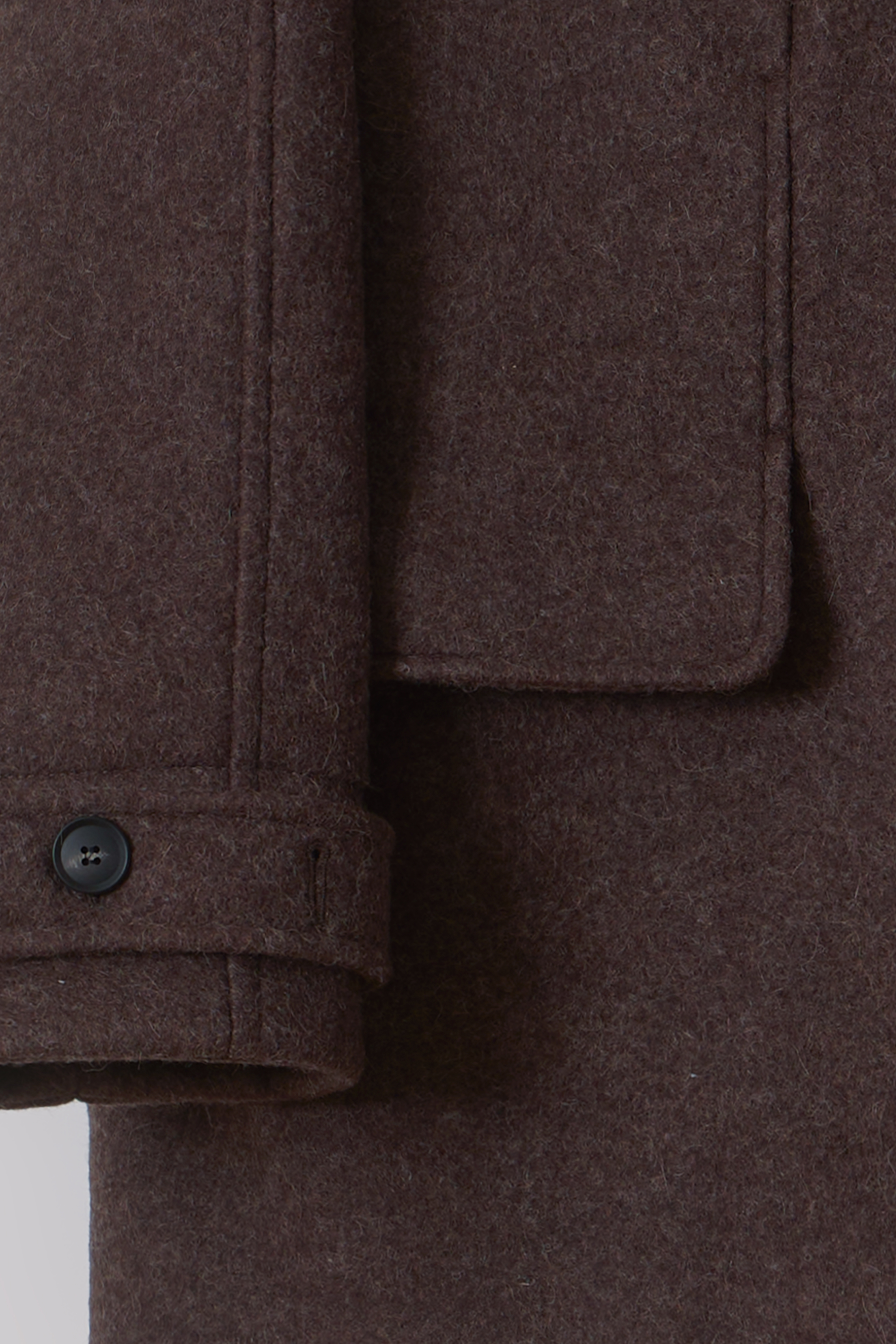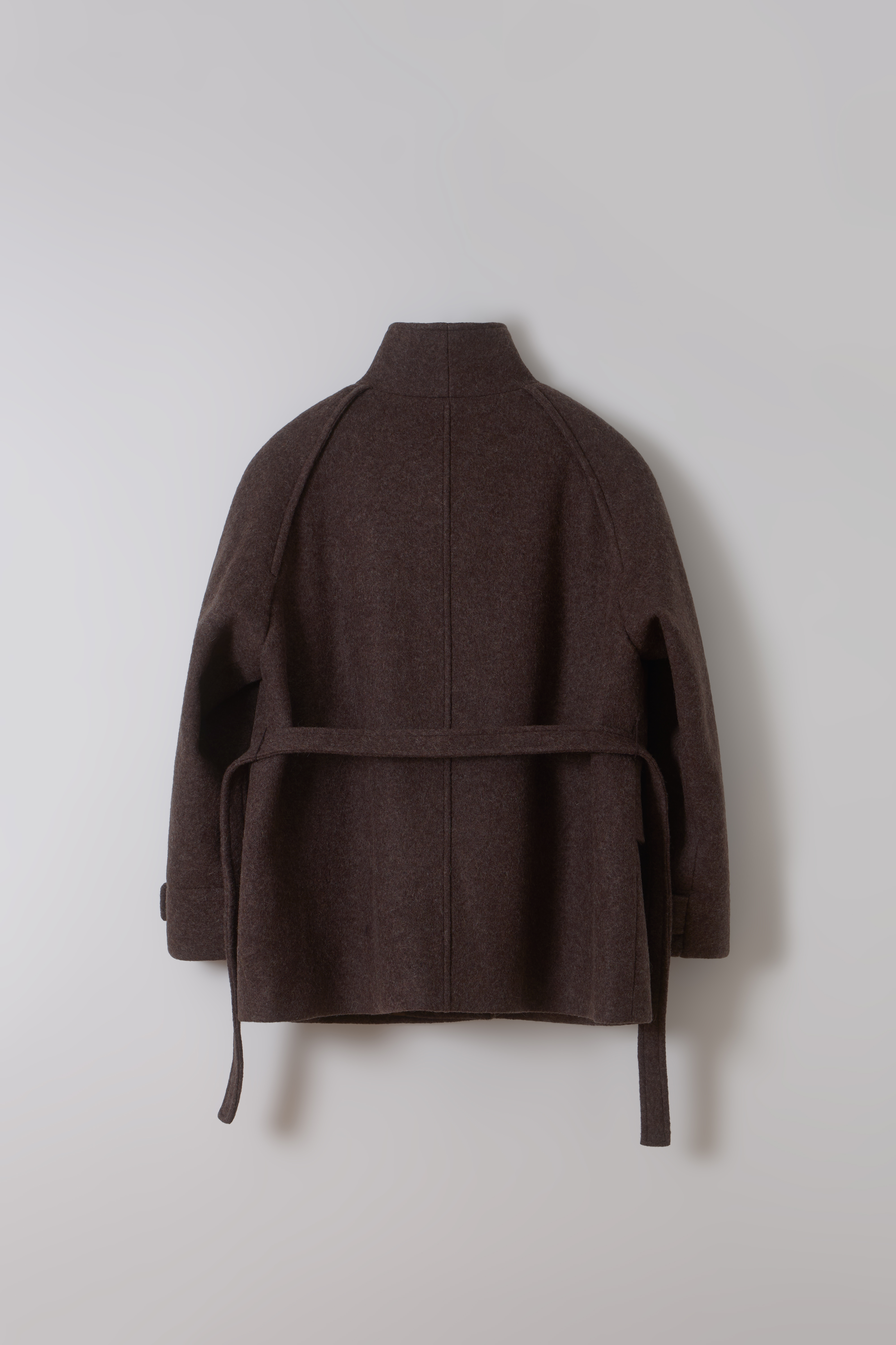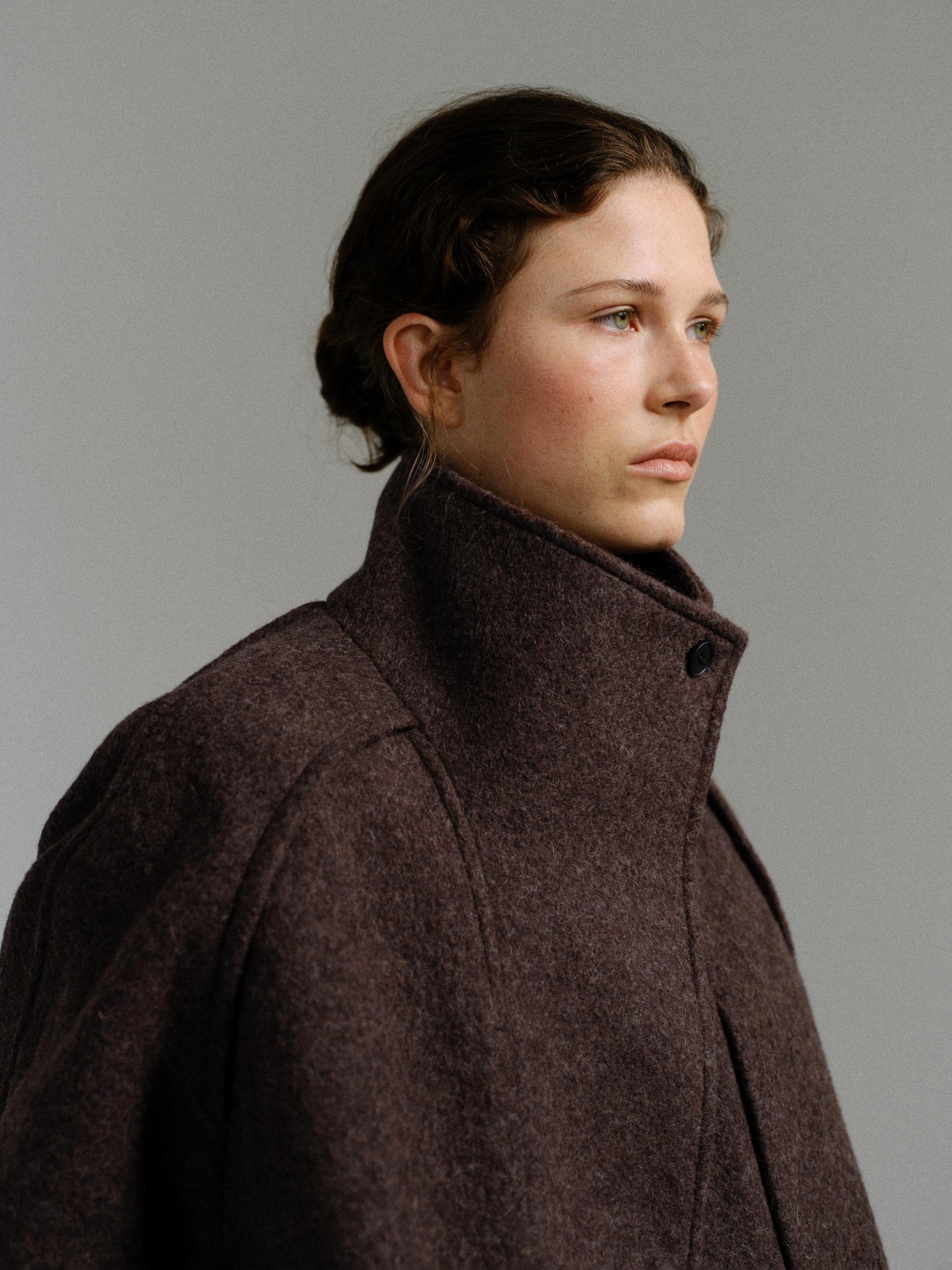 -울 혼방 원단 특유의 헤어리한 텍스처가 돋보이며, 차분하게 톤 다운된 컬러가 특징입니다.