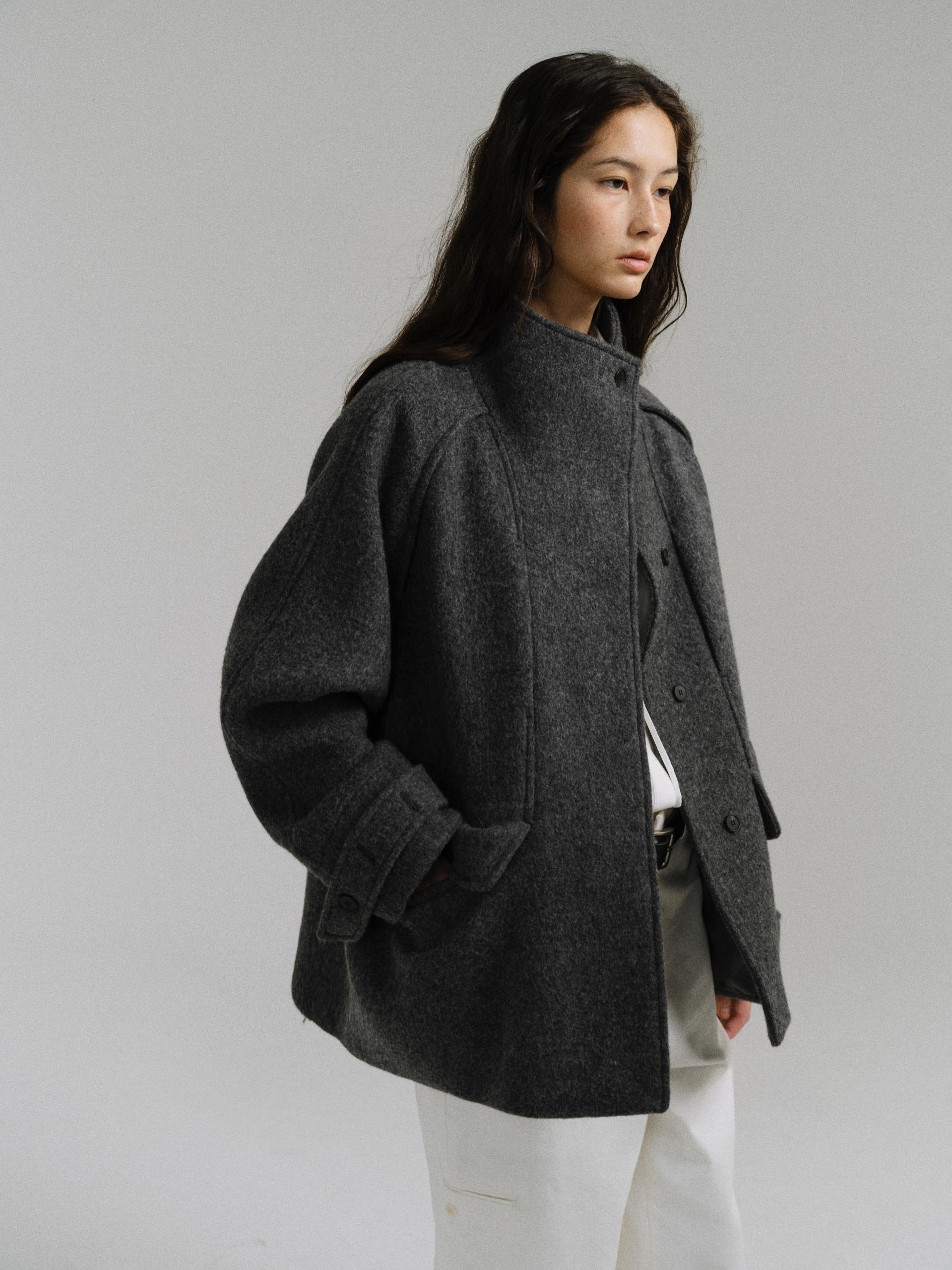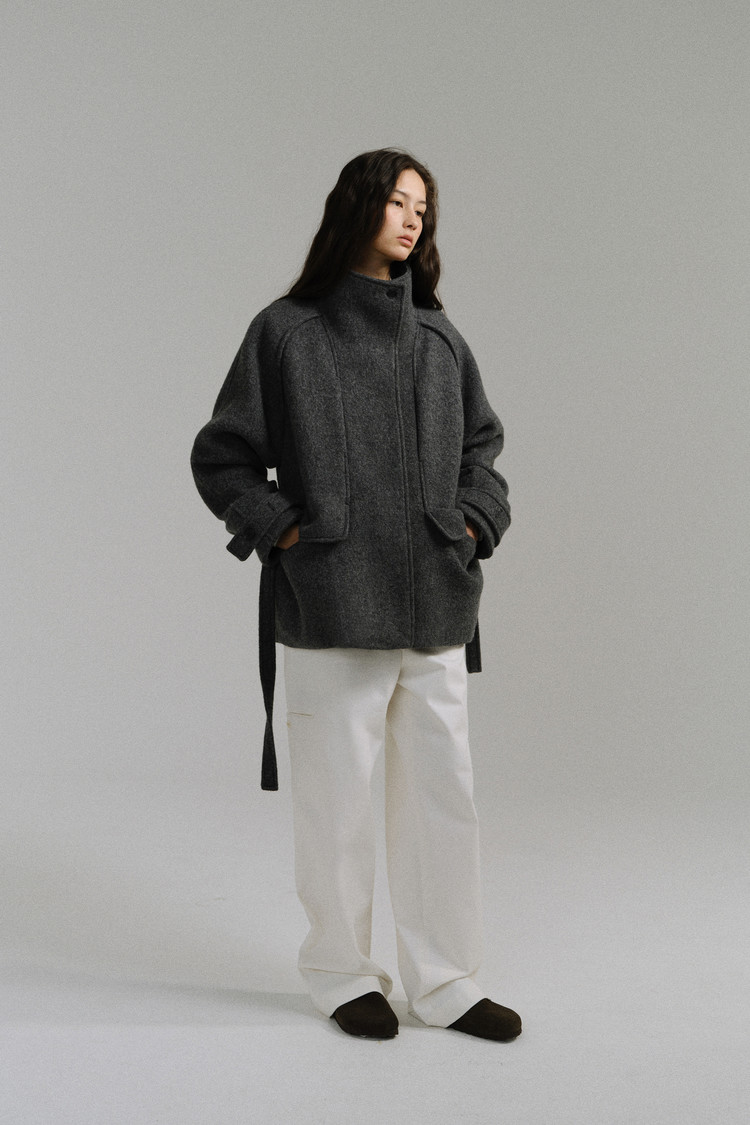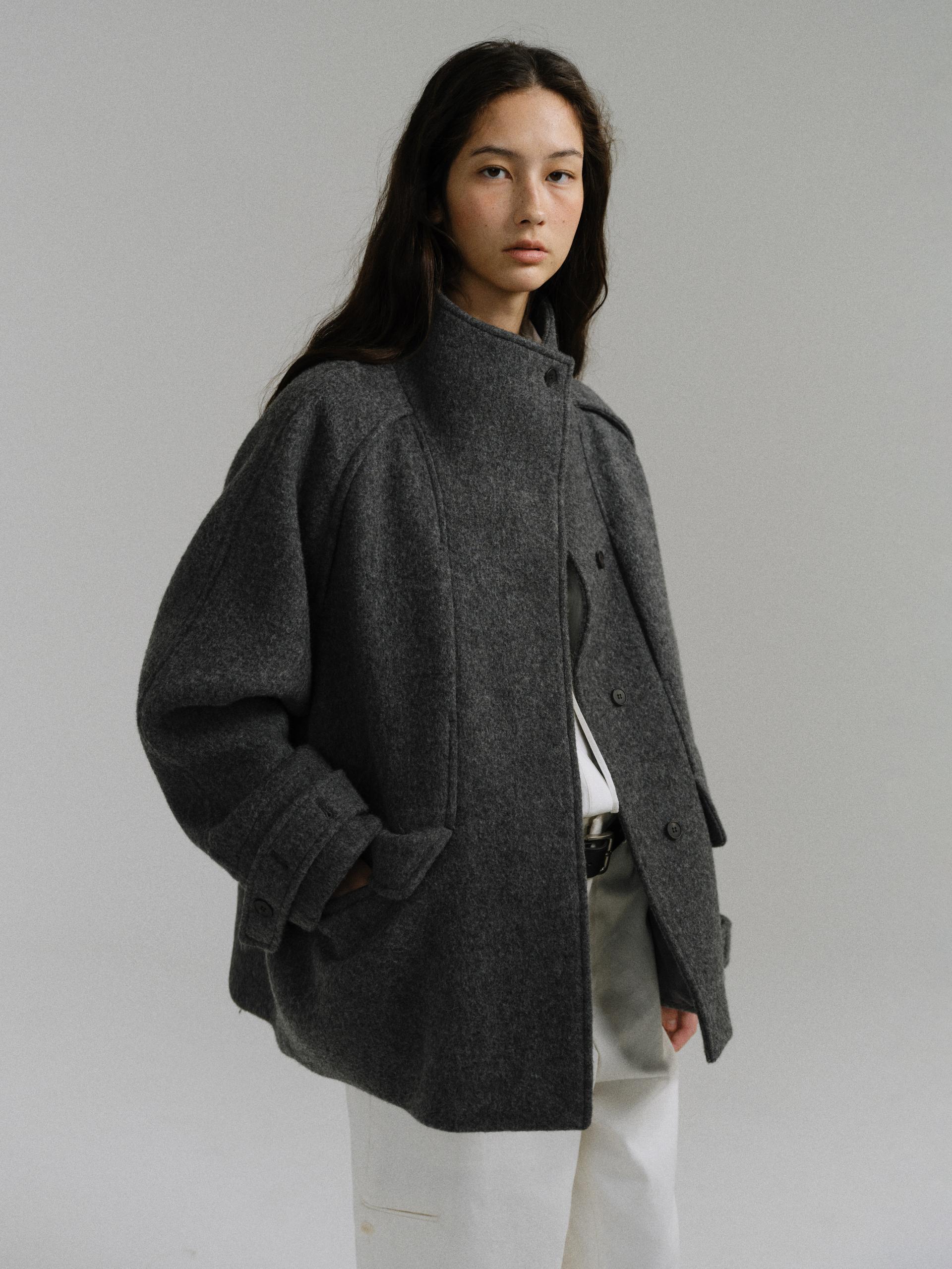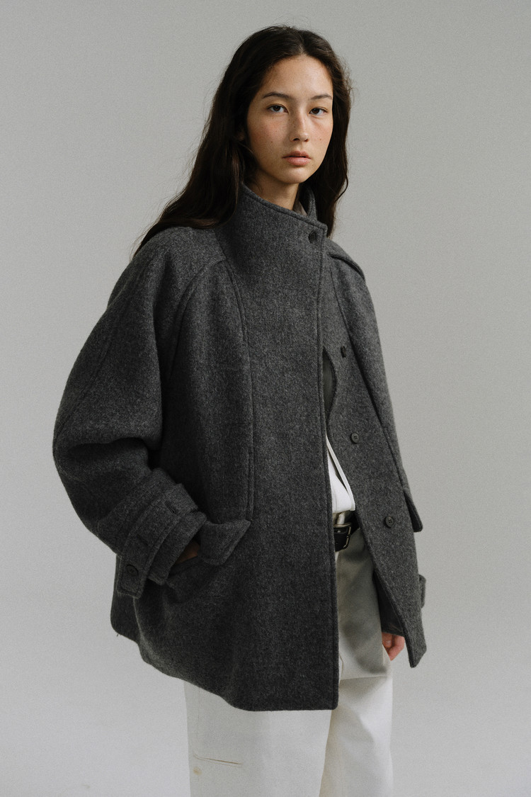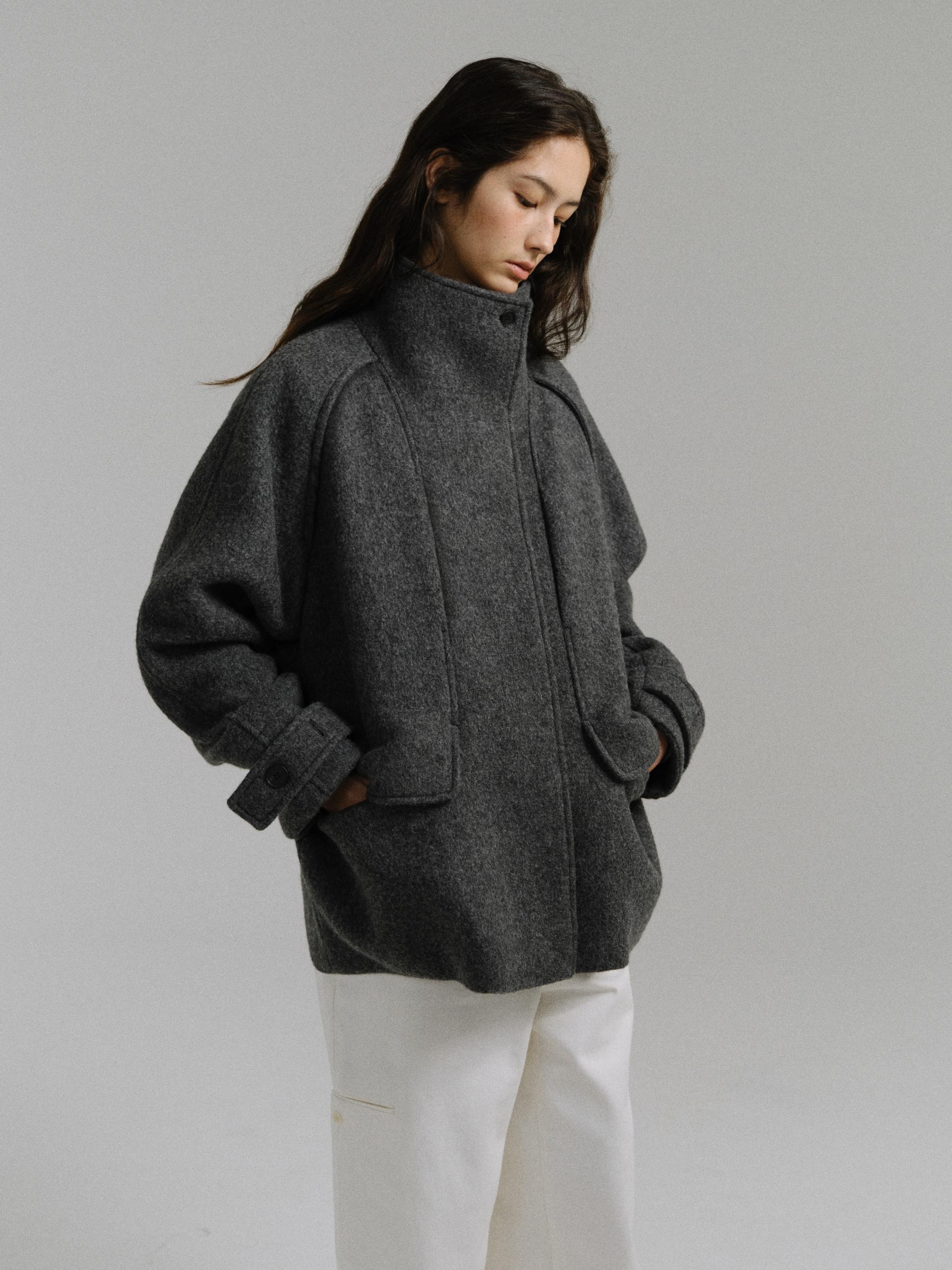 -울 원단 특유의 헤어리한 텍스처가 돋보이며, 차분하게 톤 다운된 컬러가 특징입니다.