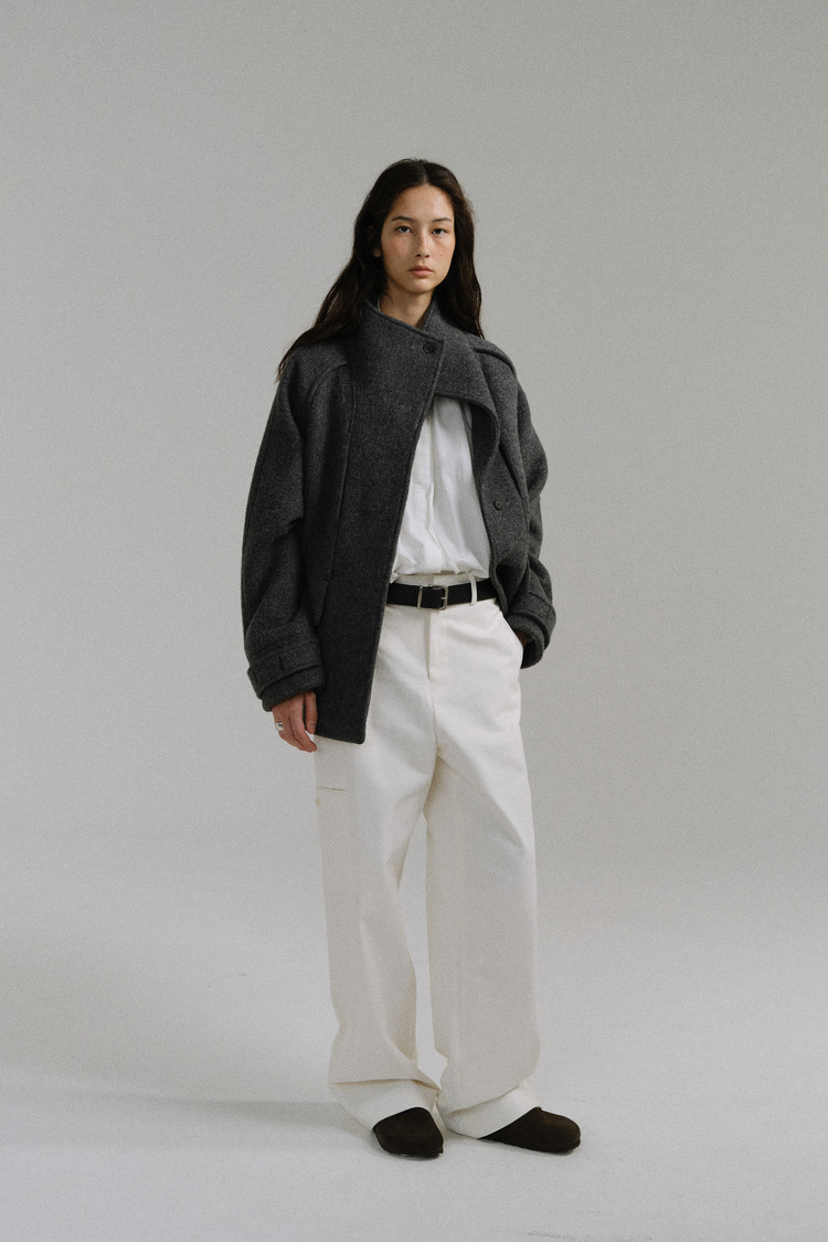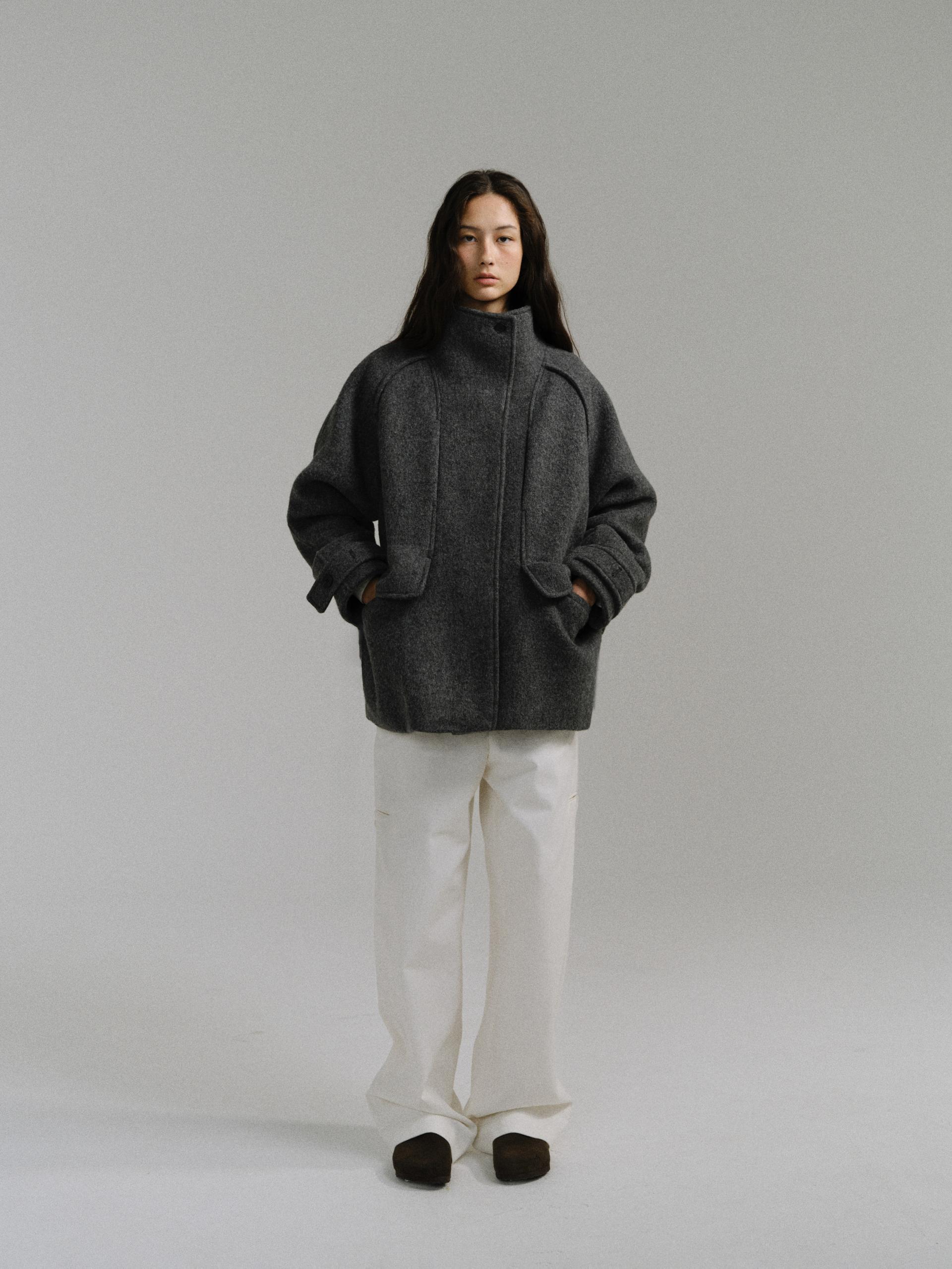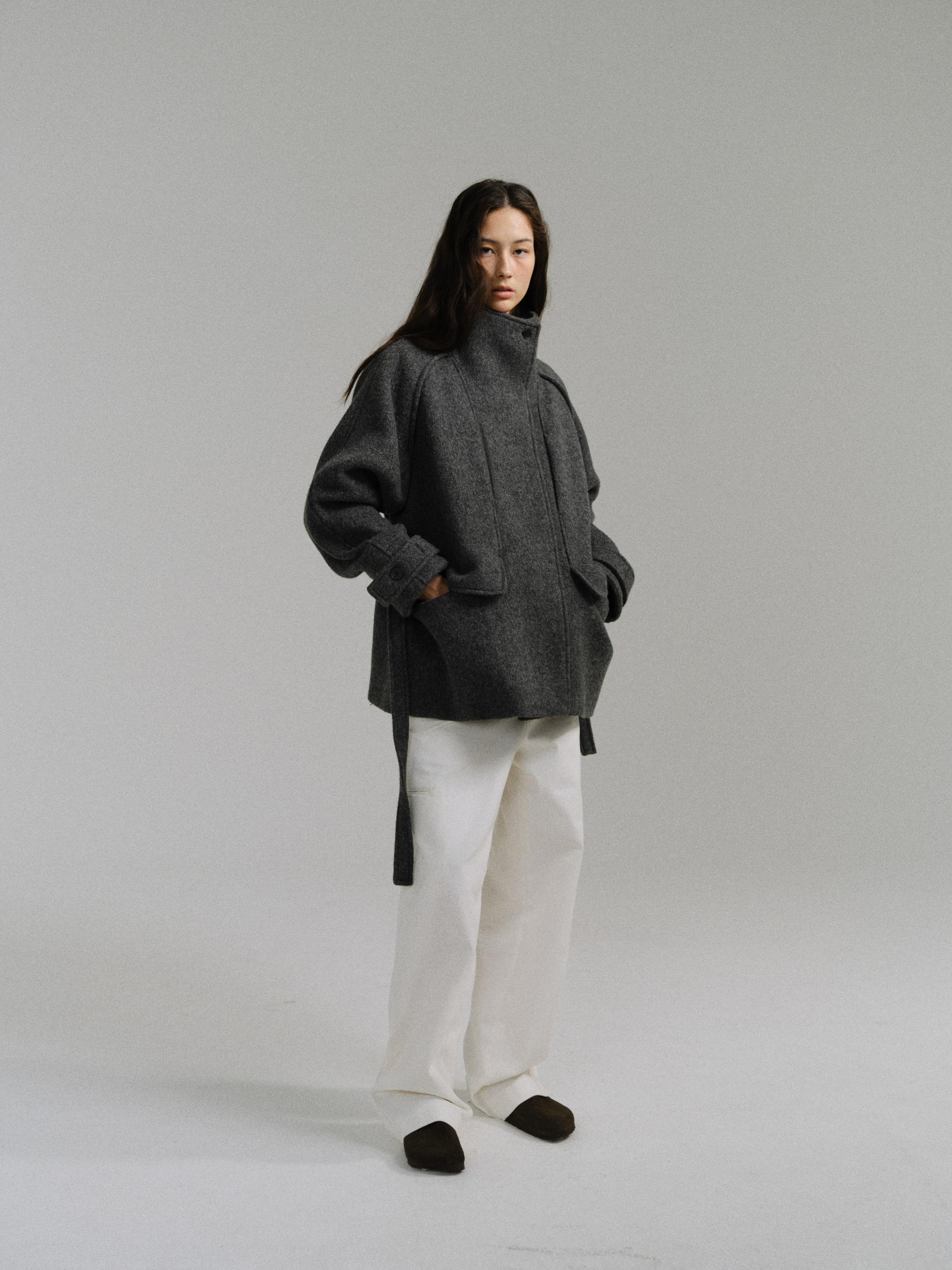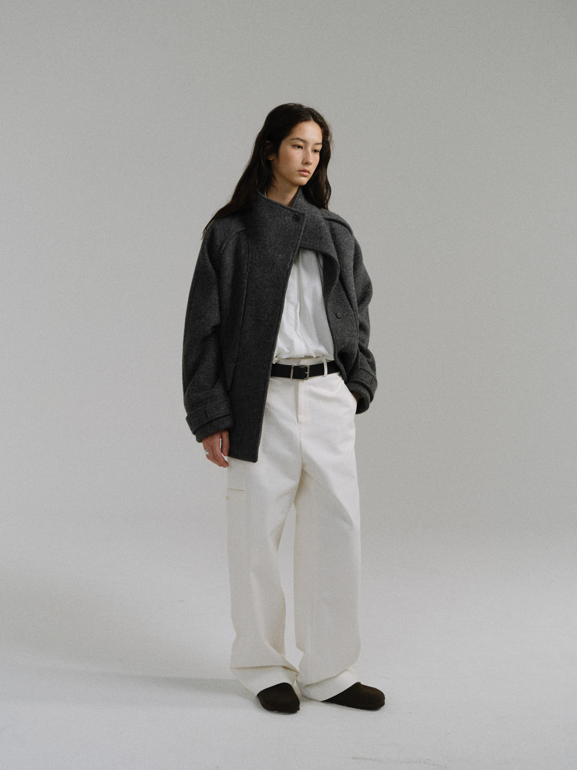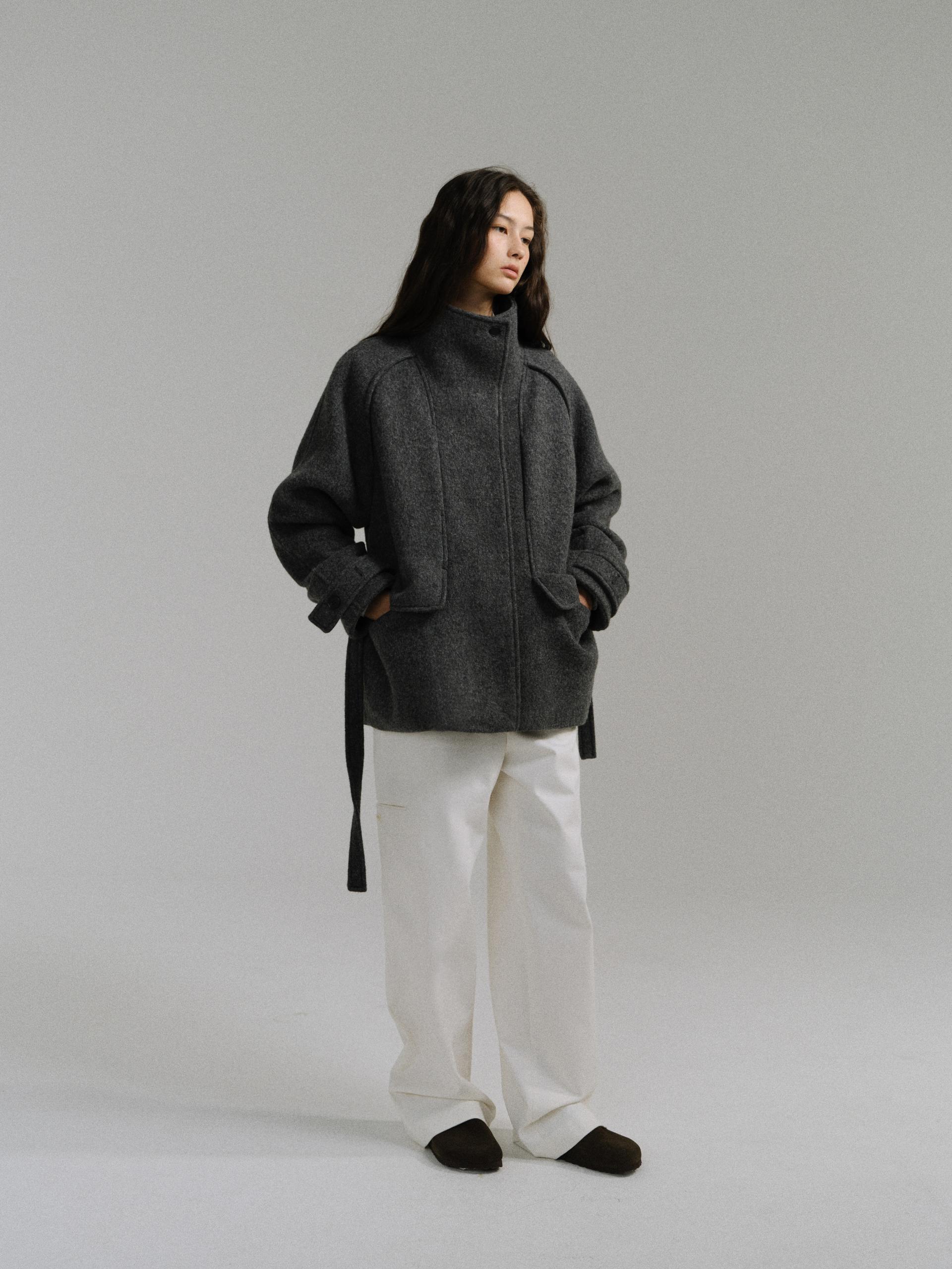 -울 원단 특유의 헤어리한 텍스처가 돋보이며, 차분하게 톤 다운된 컬러가 특징입니다.