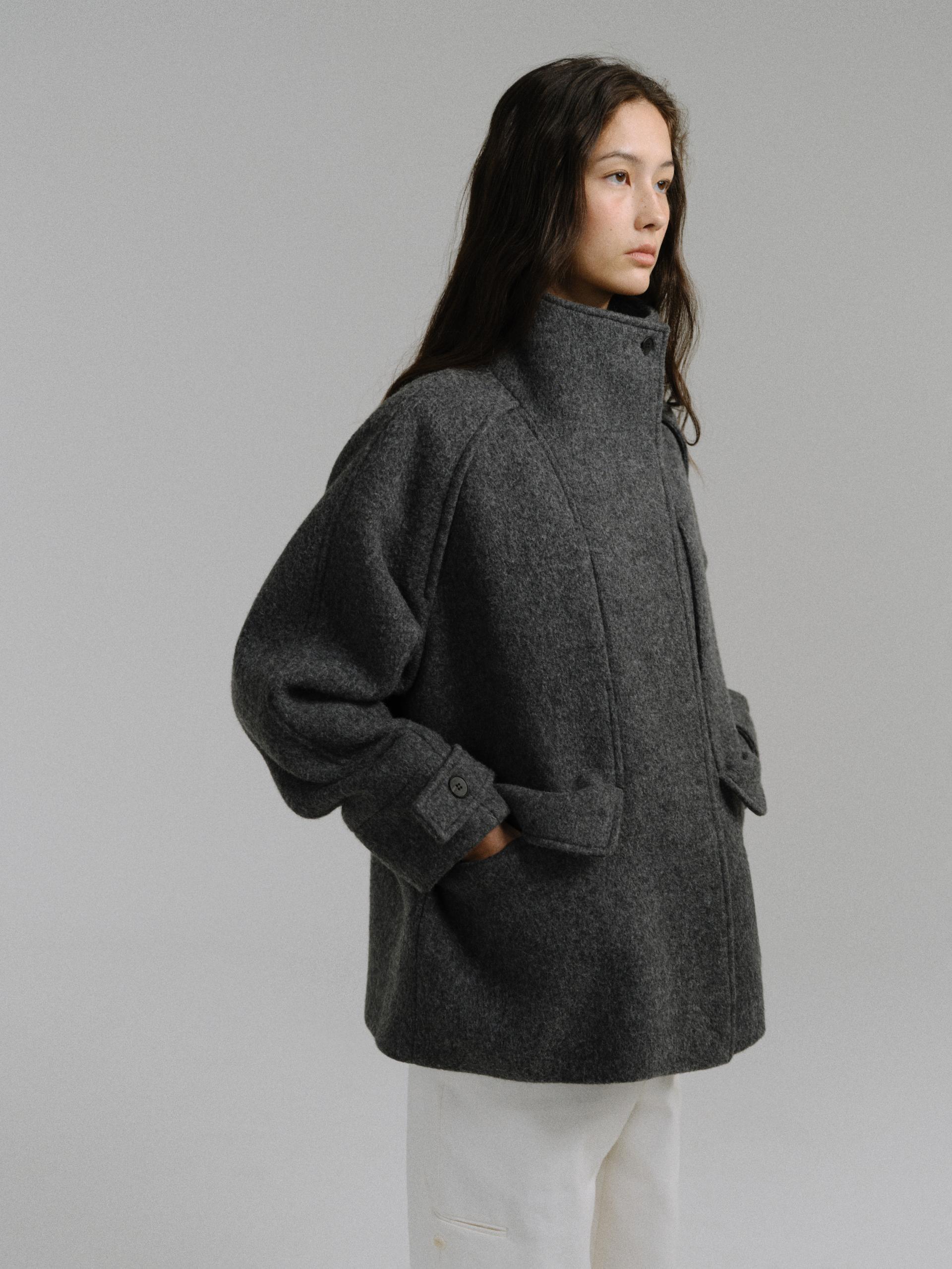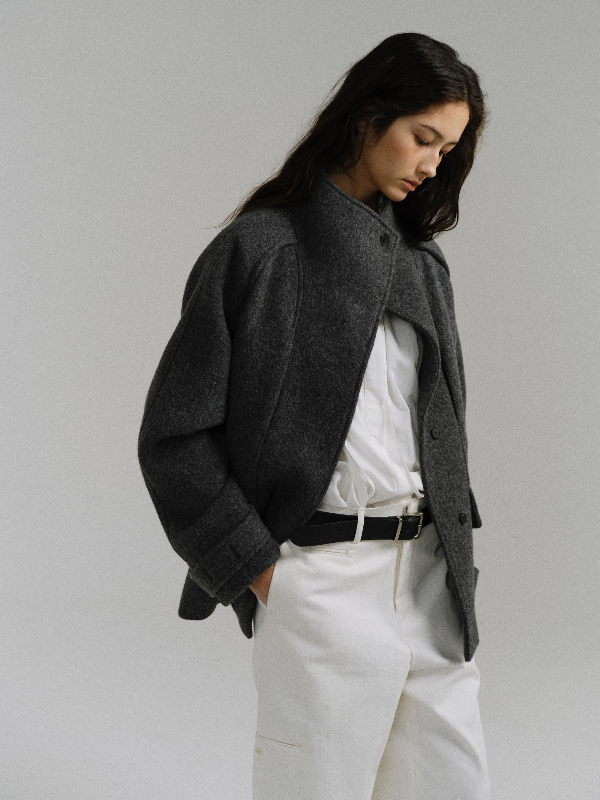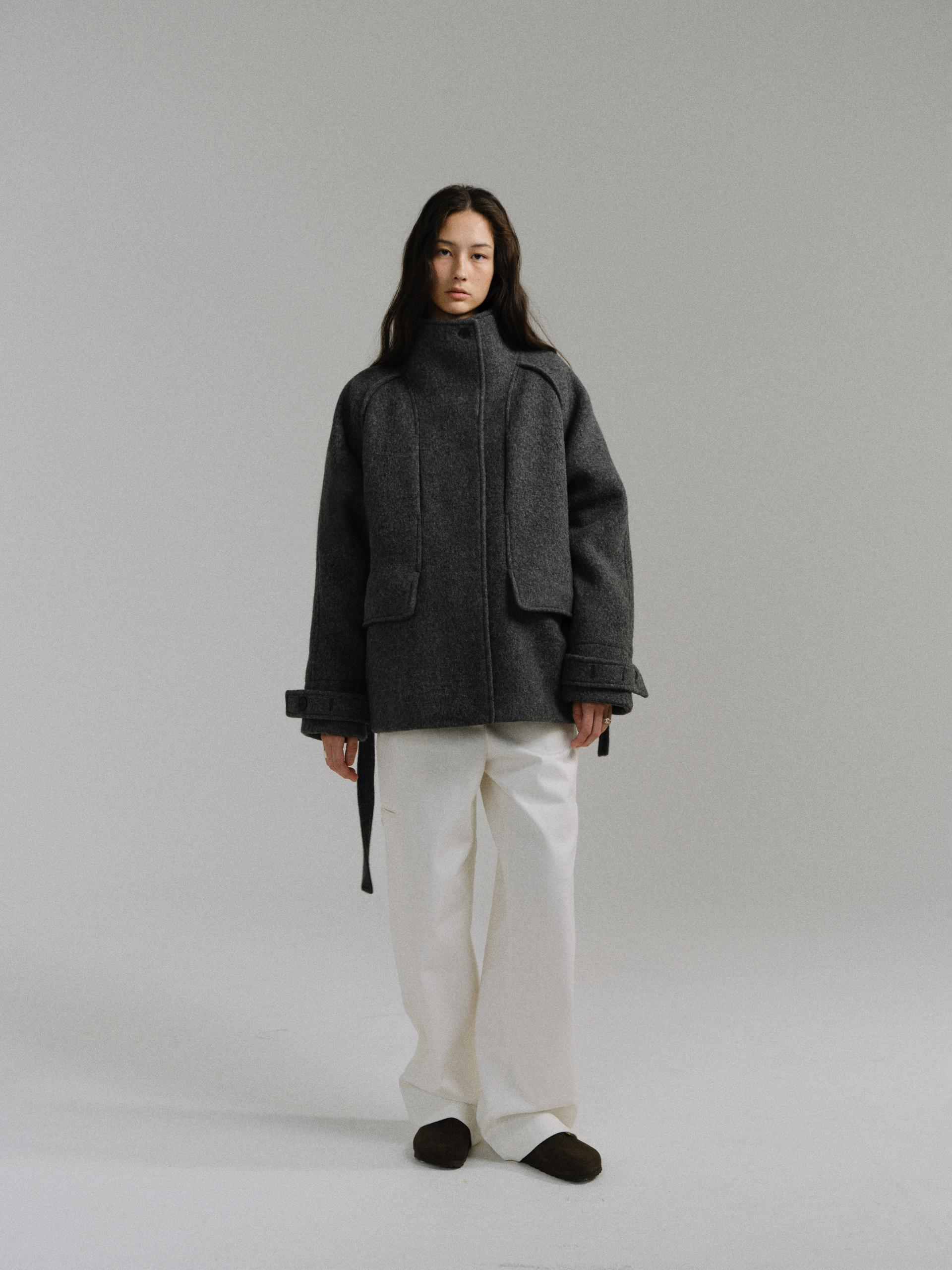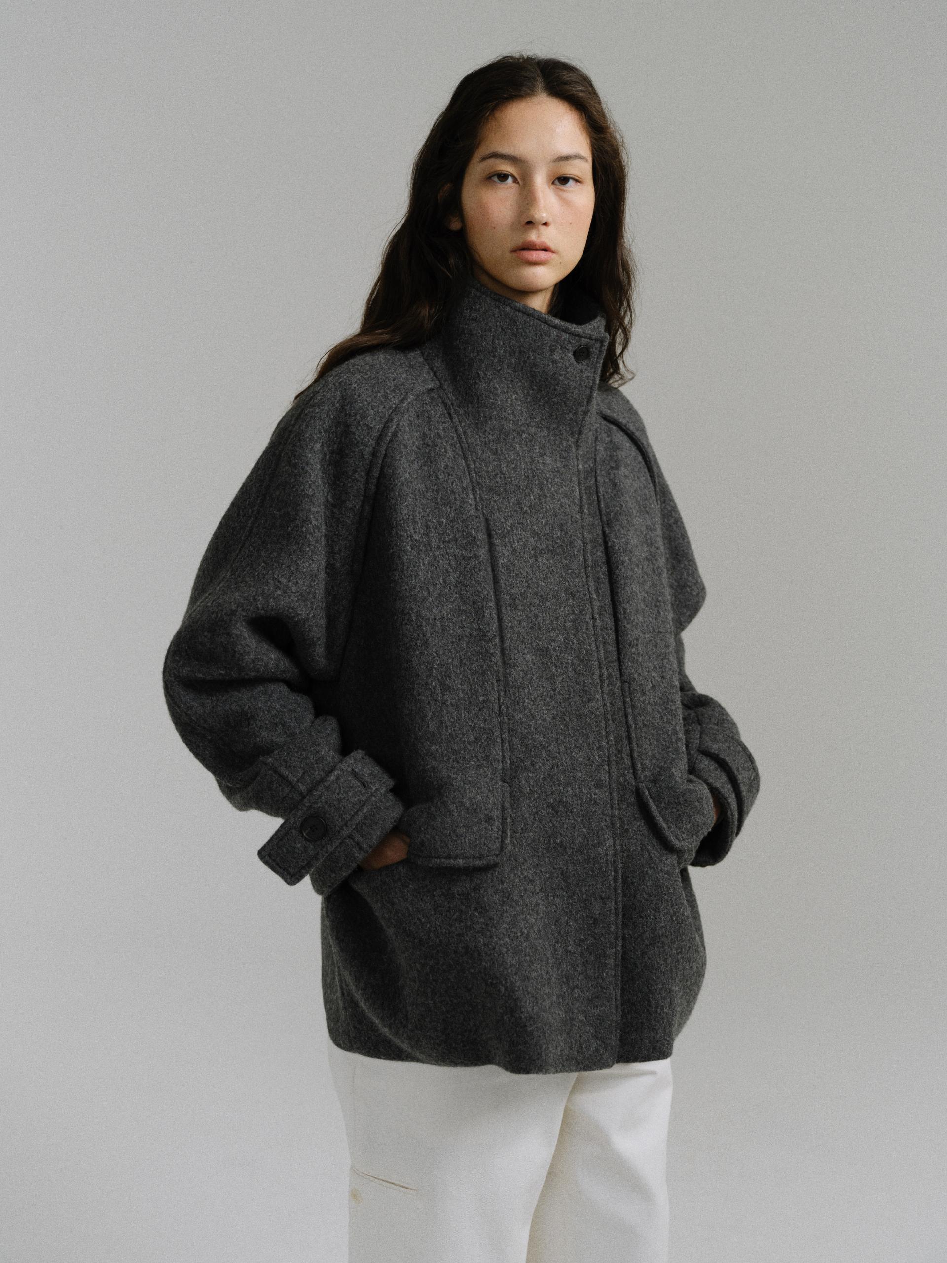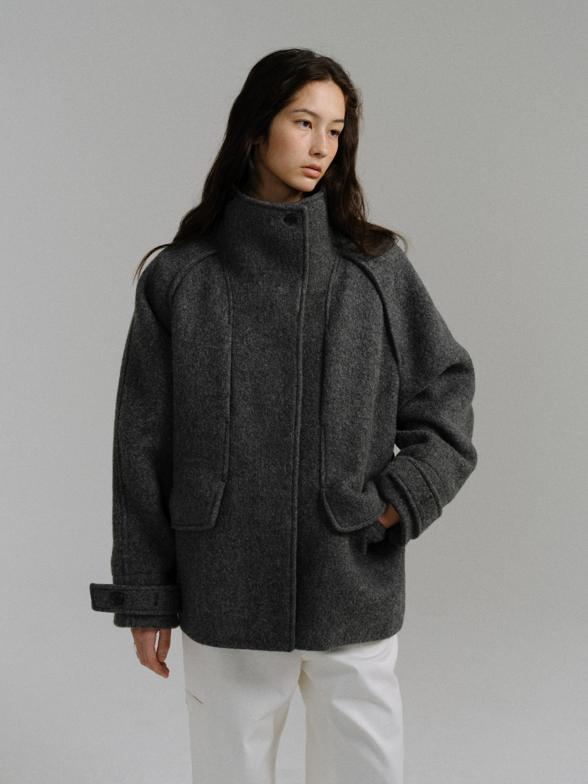 -울 원단 특유의 헤어리한 텍스처가 돋보이며, 차분하게 톤 다운된 컬러가 특징입니다.