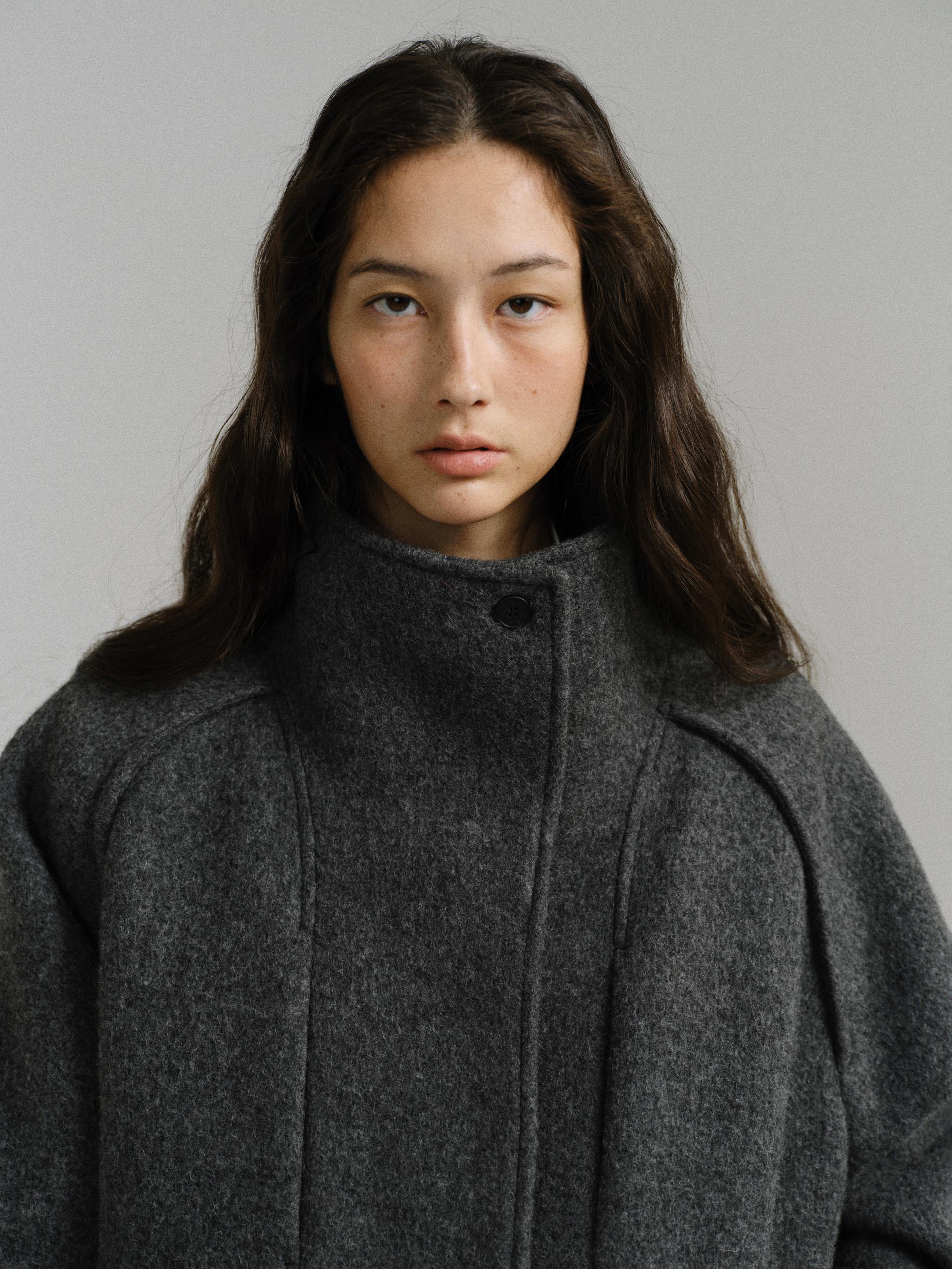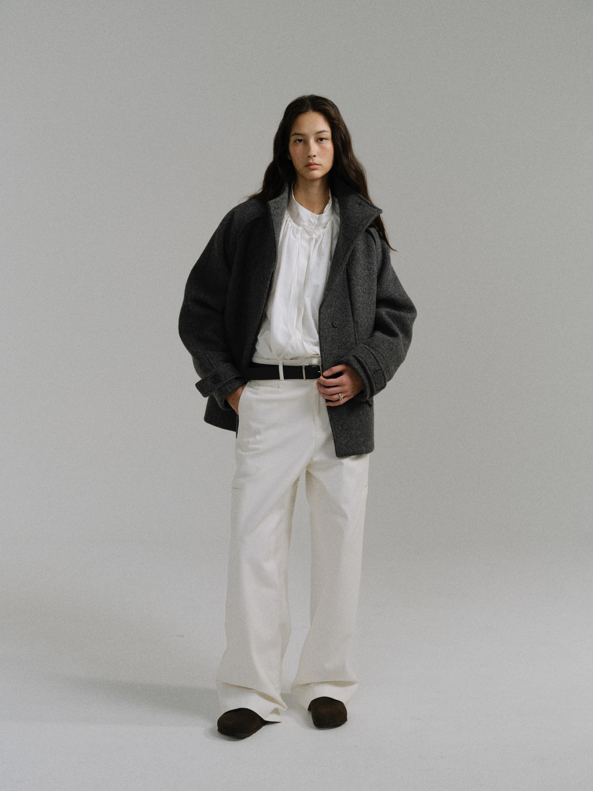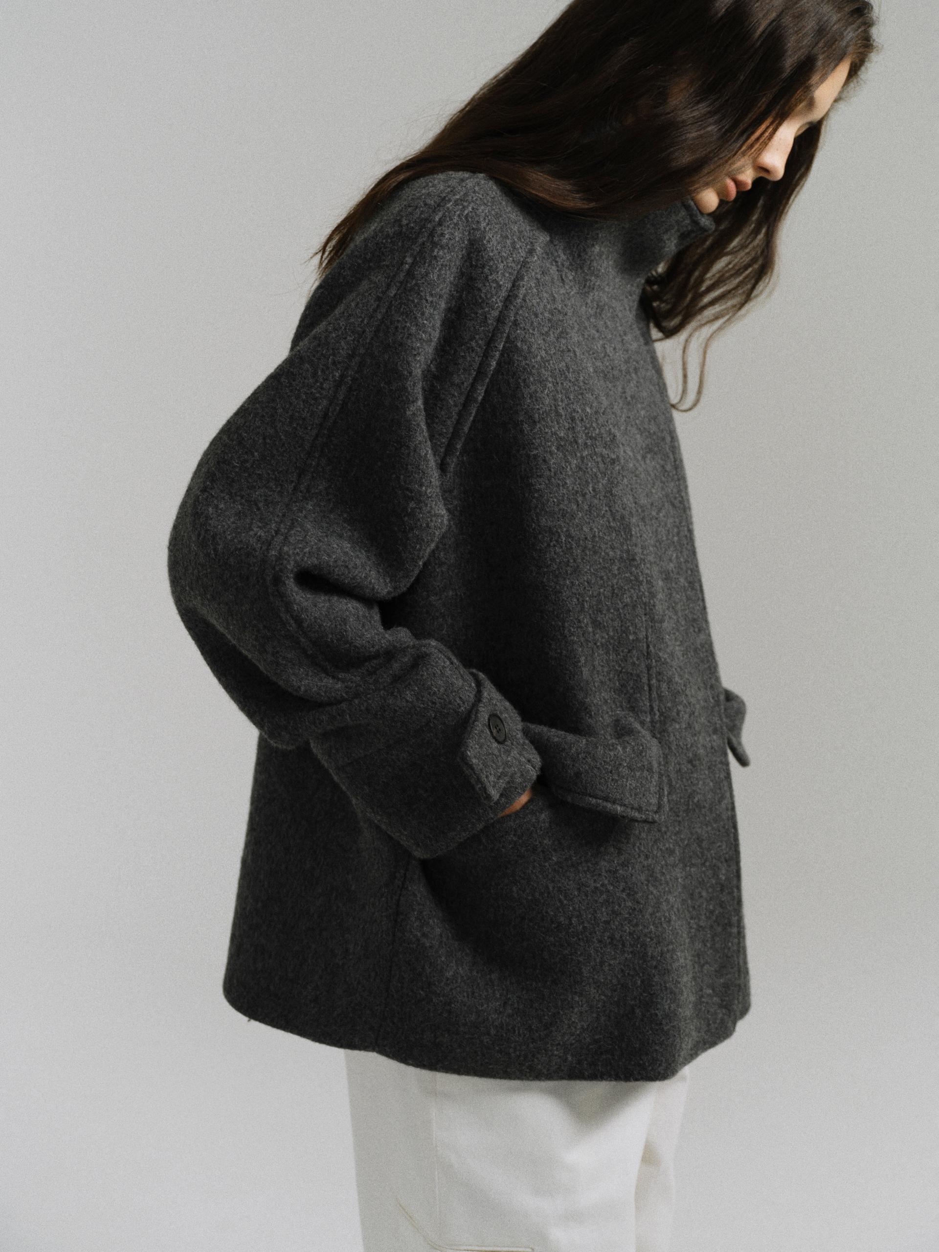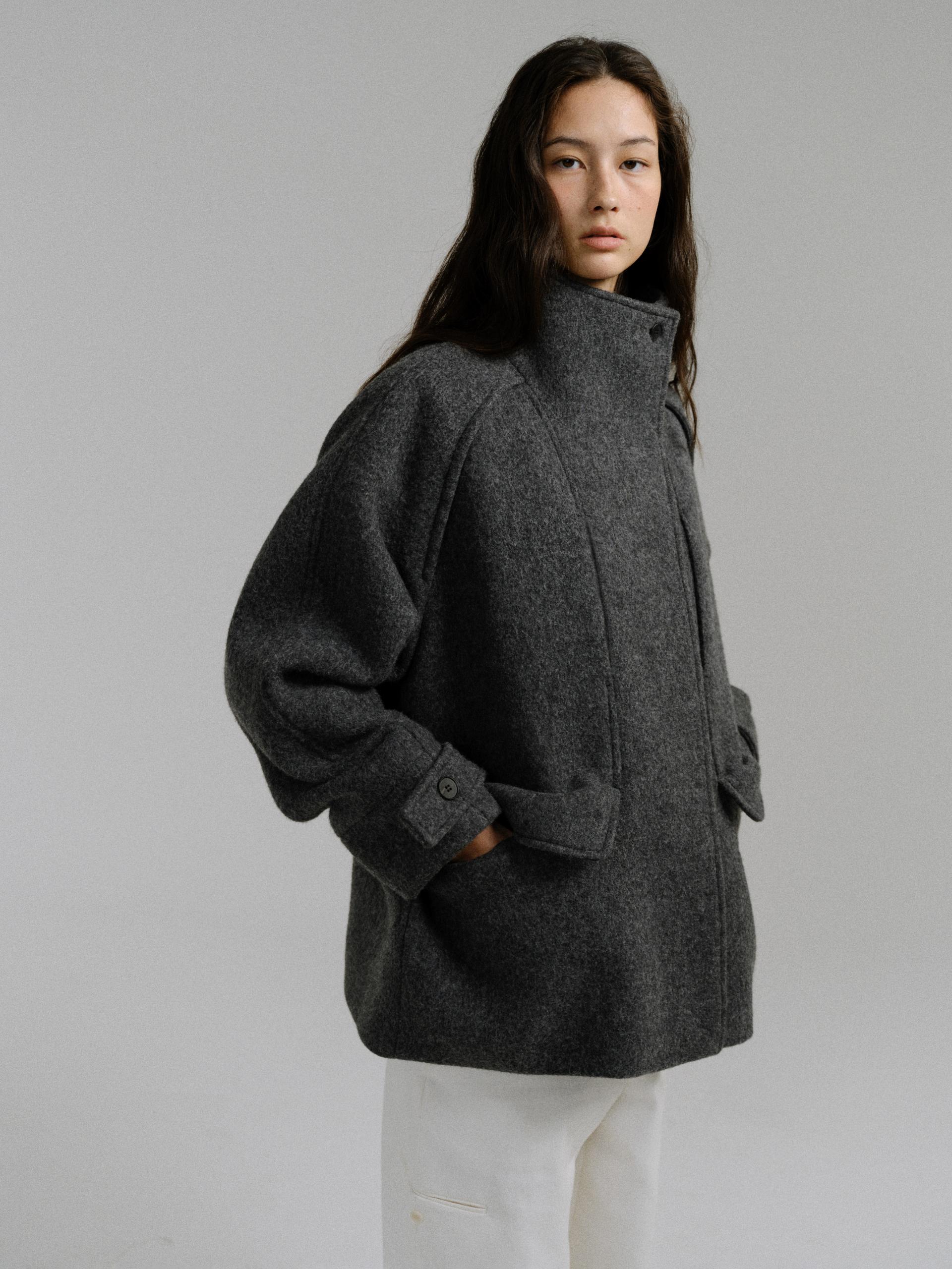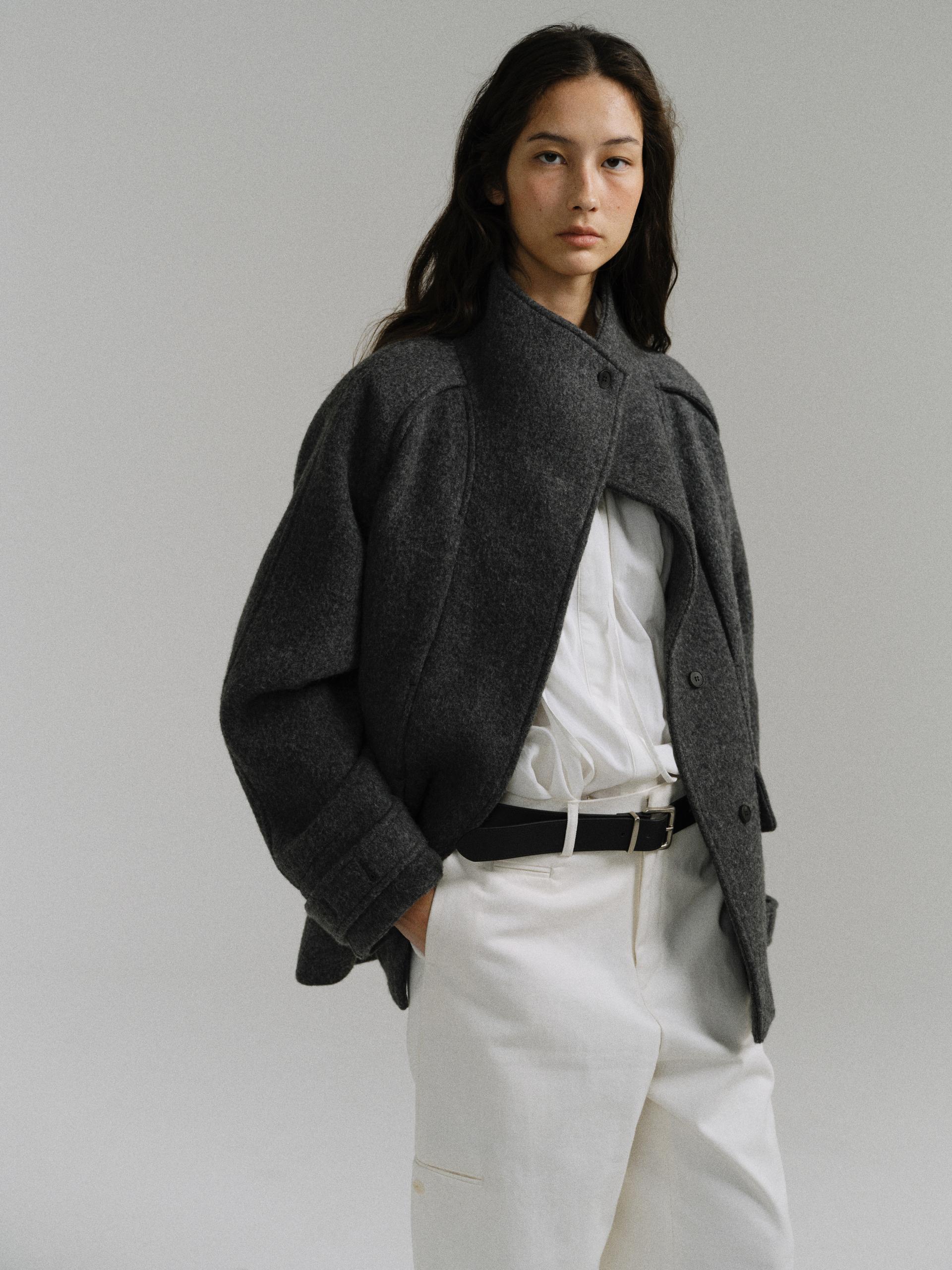 -울 원단 특유의 헤어리한 텍스처가 돋보이며, 차분하게 톤 다운된 컬러가 특징입니다.
