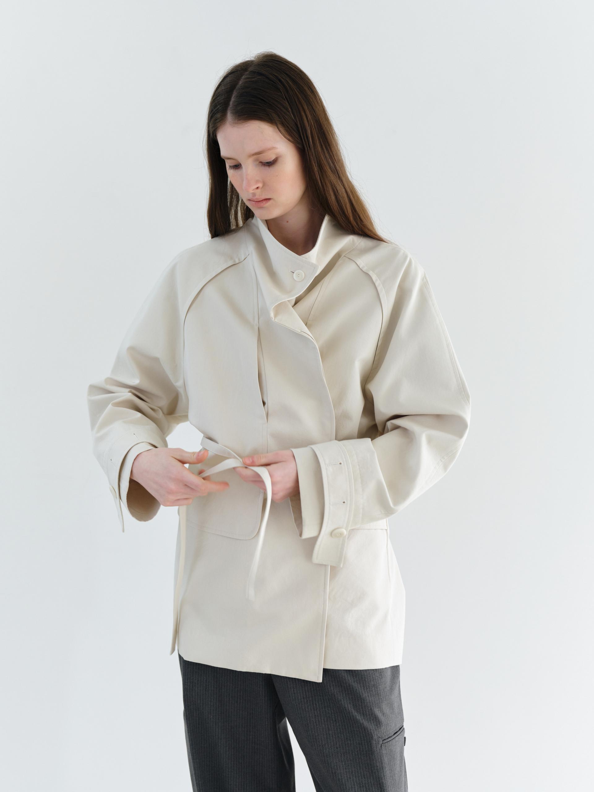 - 입체적인 래글런 소매의 사선 라인과 심 포켓, 입체 포켓이 어우러져 구조적인 실루엣을 완성합니다.