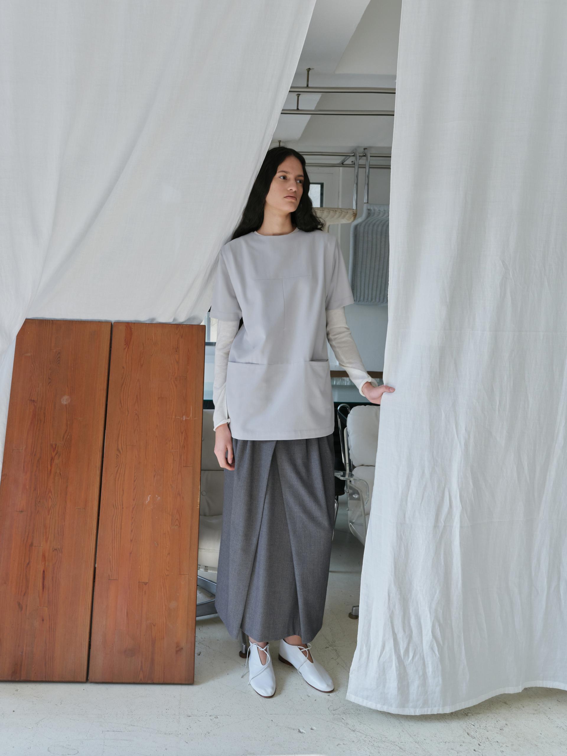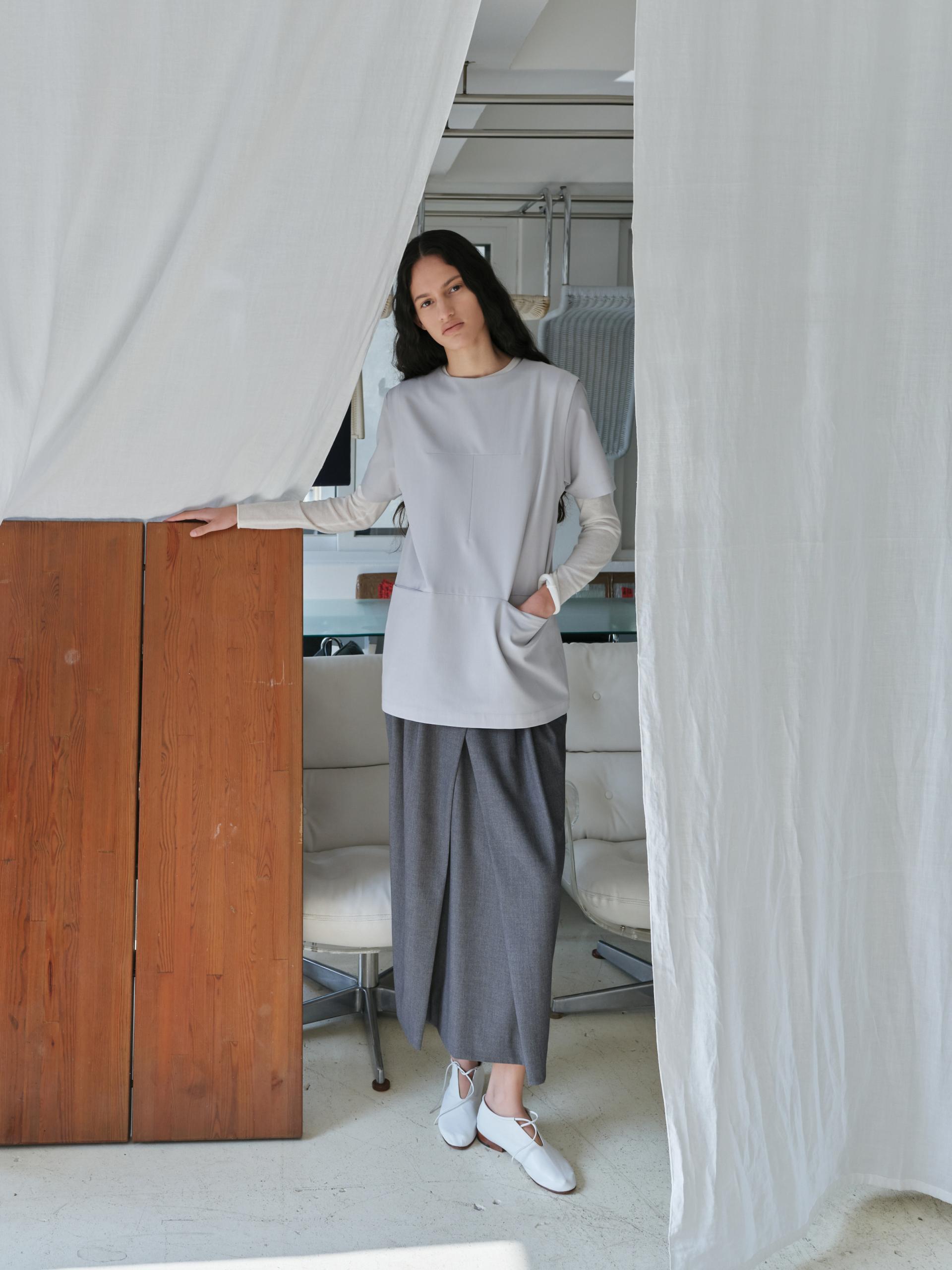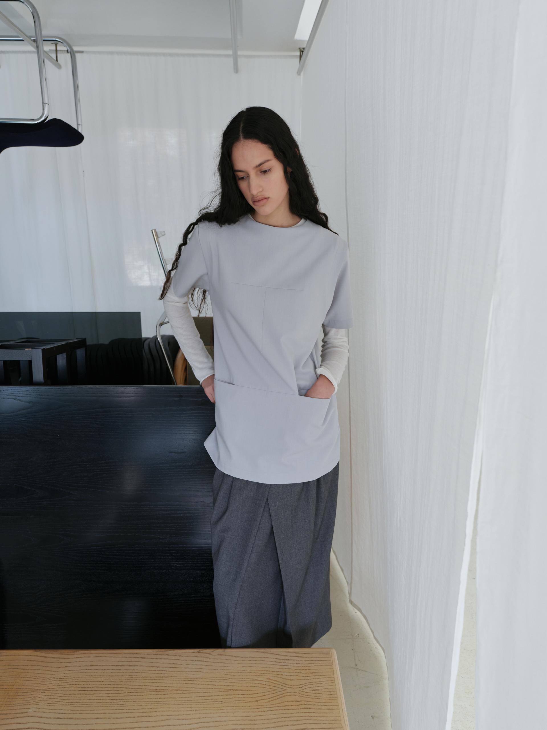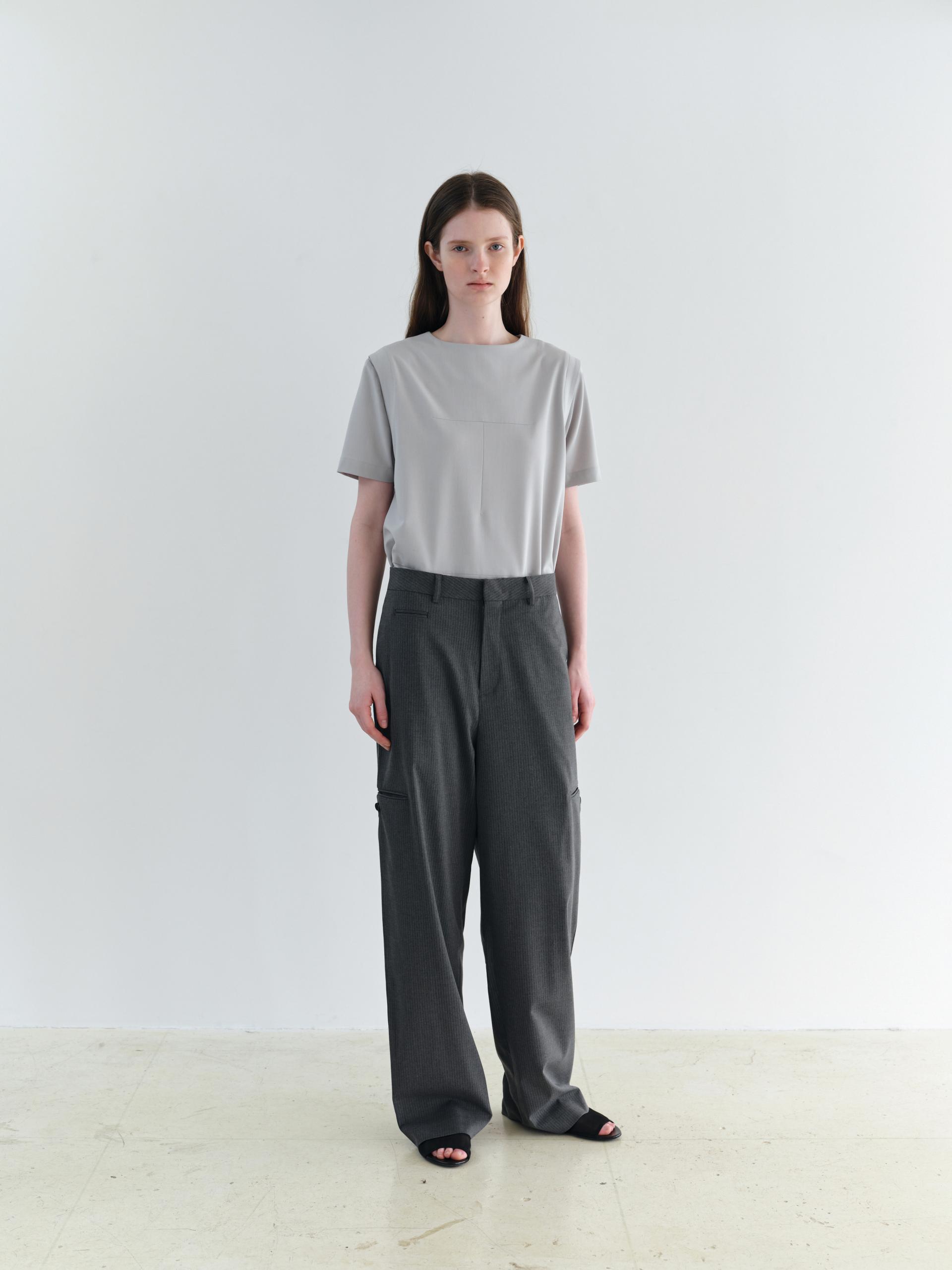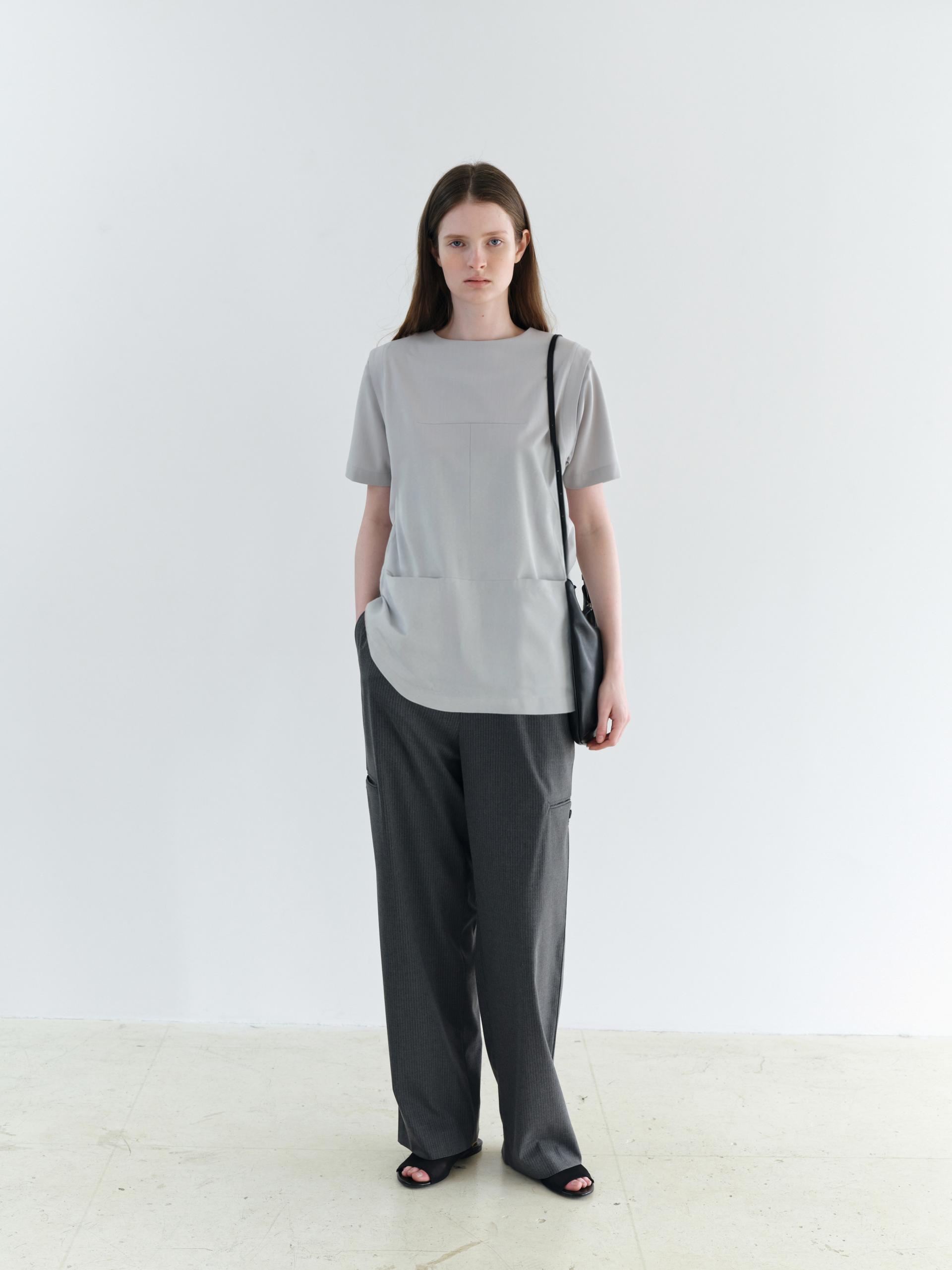 - 가로 절개를 따라 배치된 심포켓은 라인의 연속성을 유지하며, 미니멀한 구조 안에 실용성을 담았습니다.