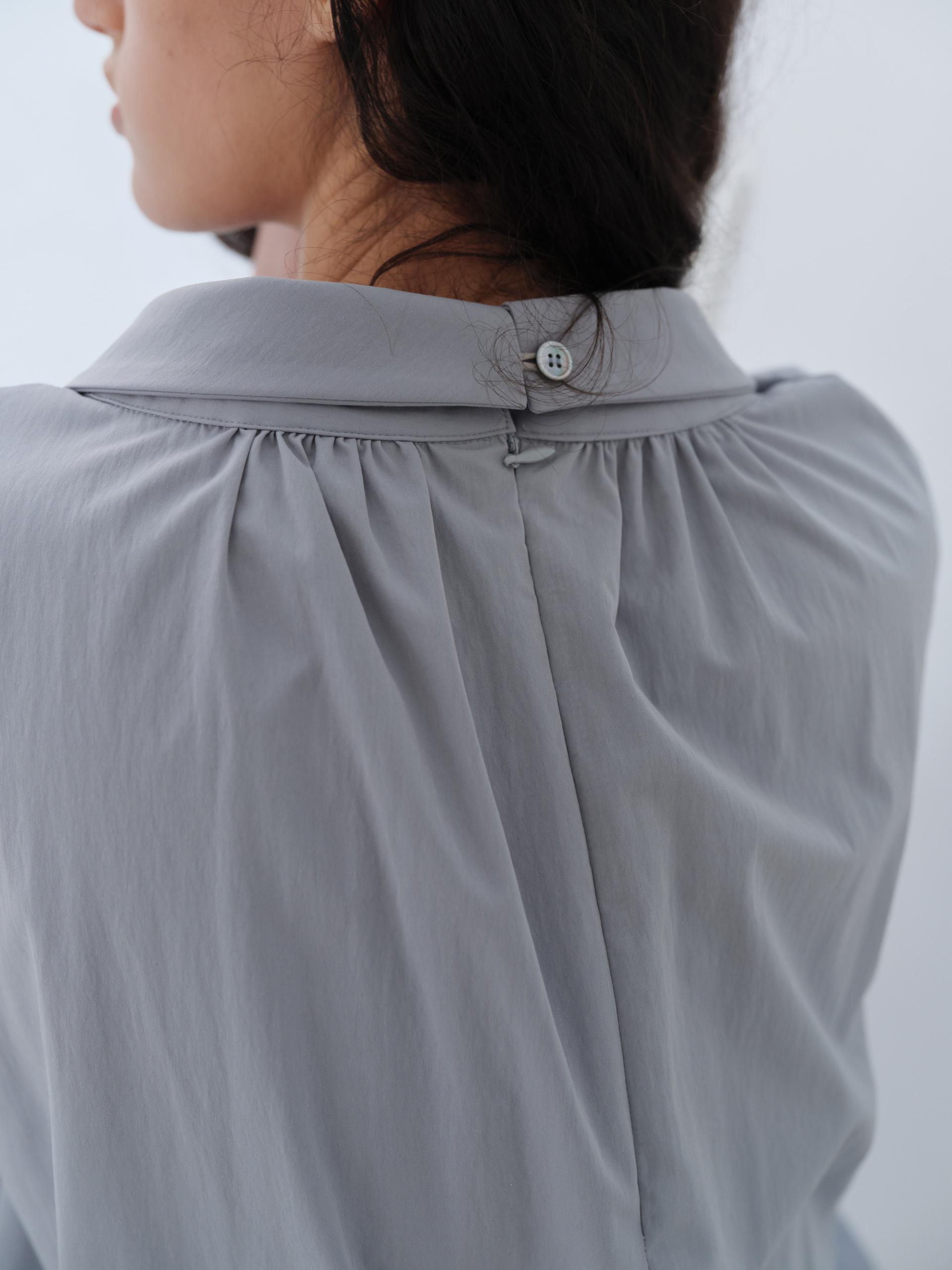- 카라는 접거나 세워서 연출할 수 있도록 설계되었으며, 뒤 중심 절개와 자개단추 디테일로 형태를 안정감 있게 고정할 수 있습니다.